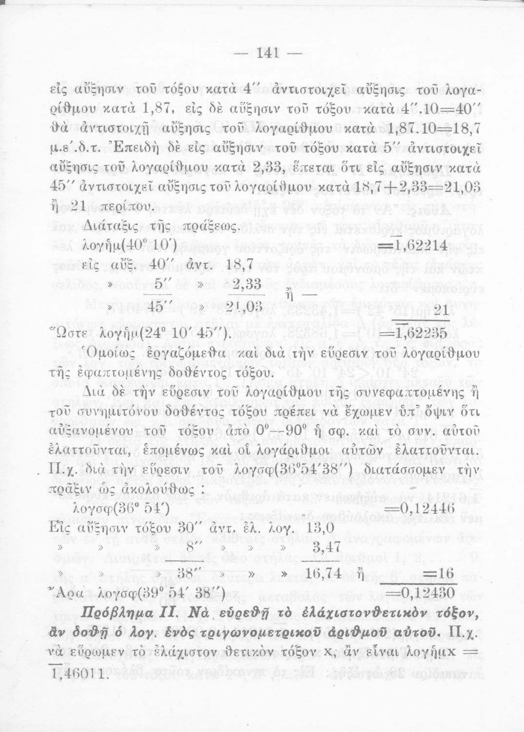 Παρουσίαση περιεχομένου: Μαθητικό βοήθημα το οποίο περιλαμβάνει λογαριθμικούς πίνακες των αριθμών από το 1 έως το 1000 και τους λογάριθμους των τεσσάρων κυριοτέρων τριγωνομετρικών αριθμών και τόξων.