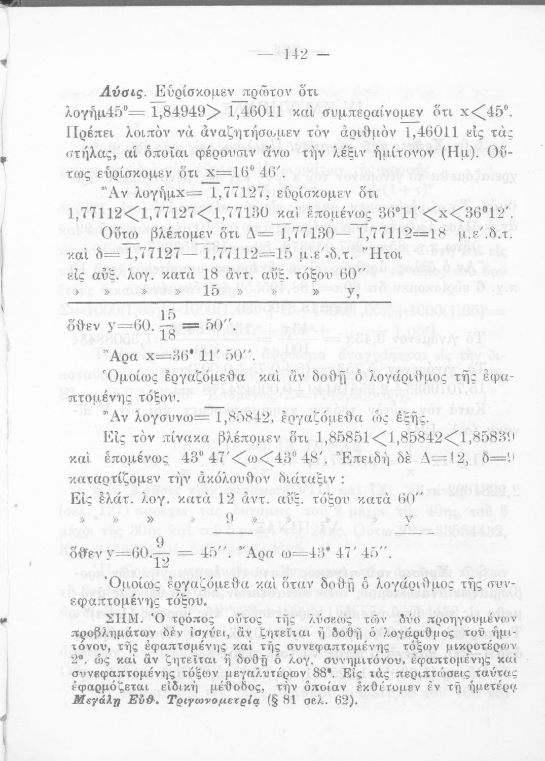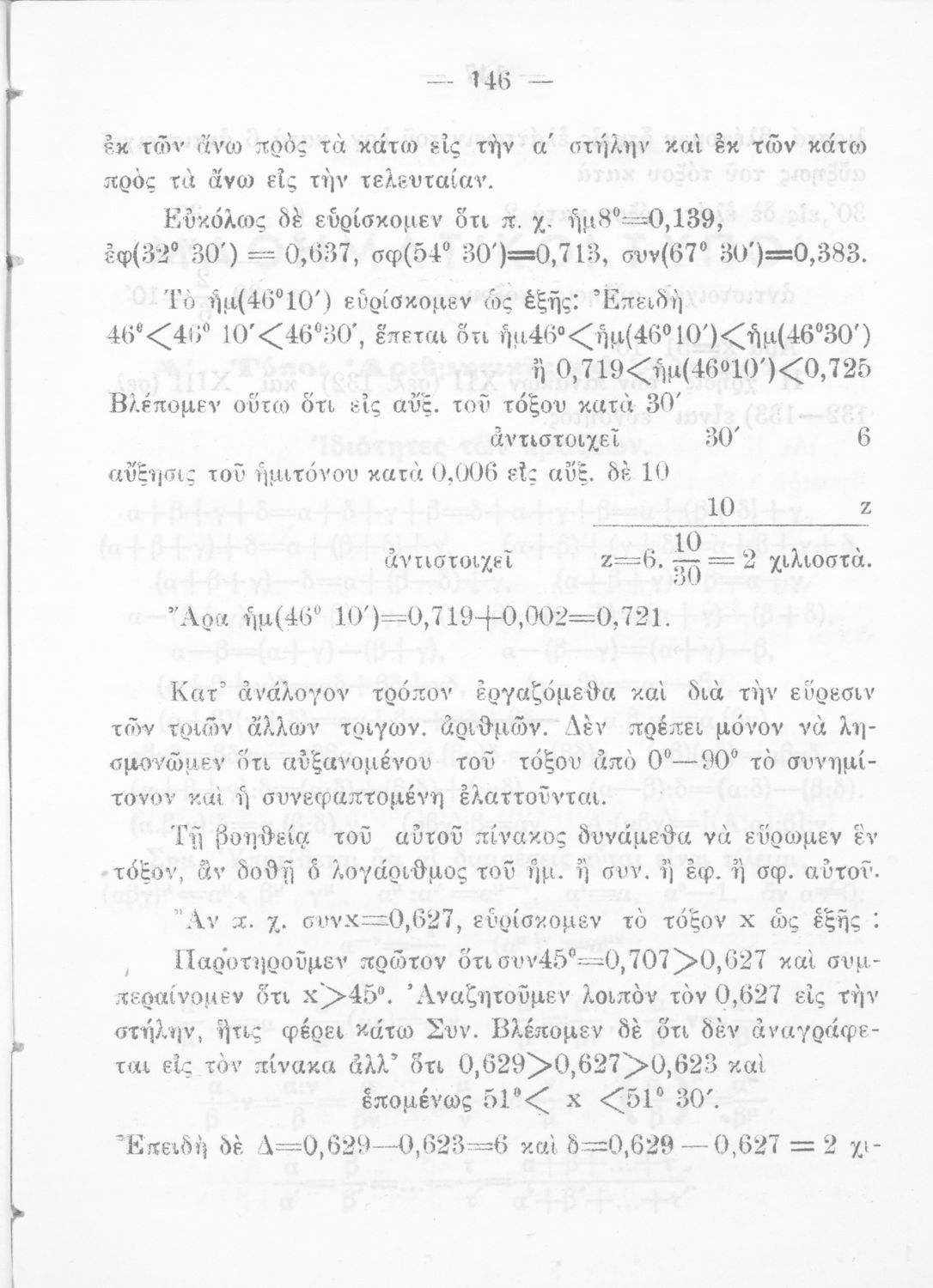 Σχολικό εγχειρίδιο Τριγωνομετρίας Γυμνασίου που εστιάζει στους τριγωνομετρικούς αριθμούς και τους λογαριθμικούς πίνακες. Ο συγγραφέας ήταν καθηγητής στο Πανεπιστήμιο Αθηνών.