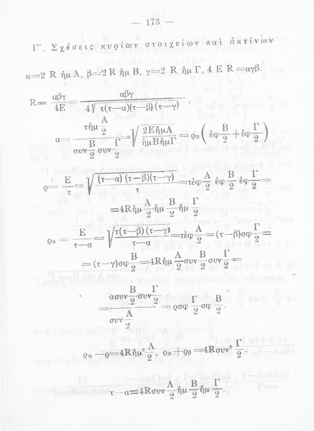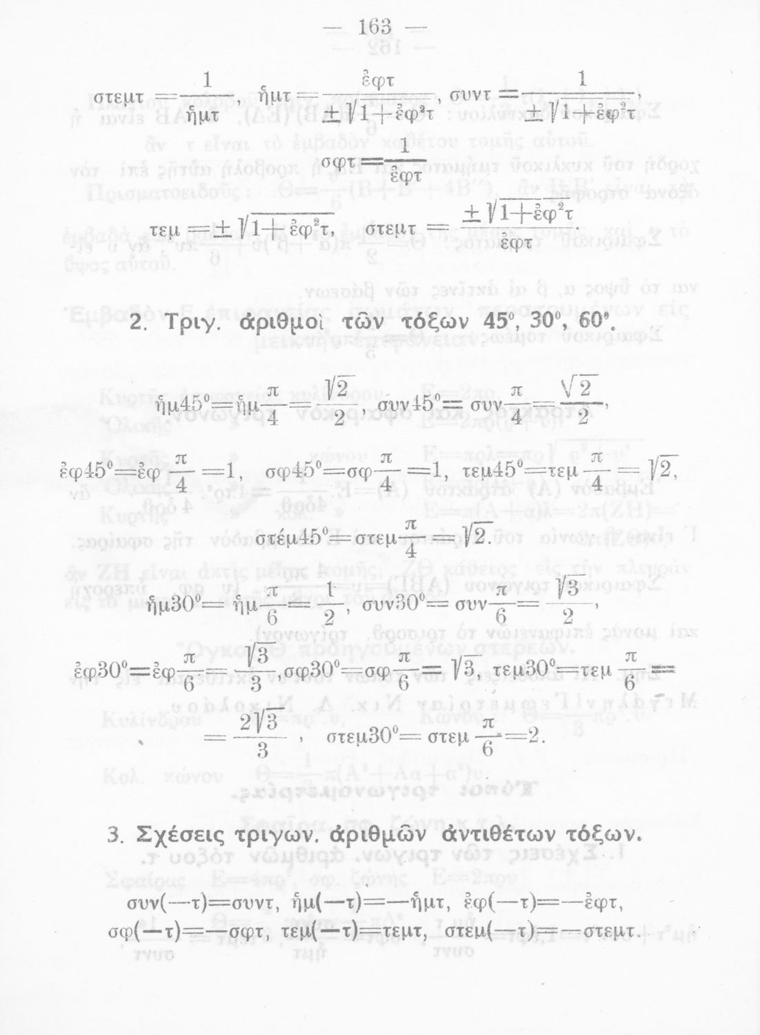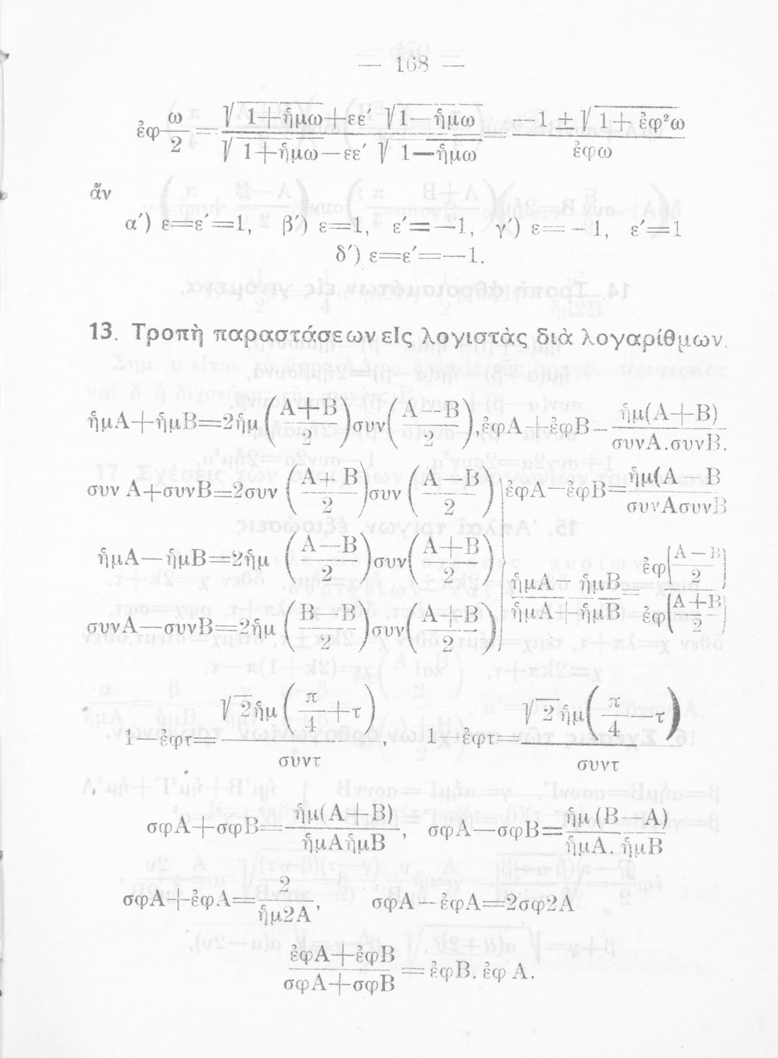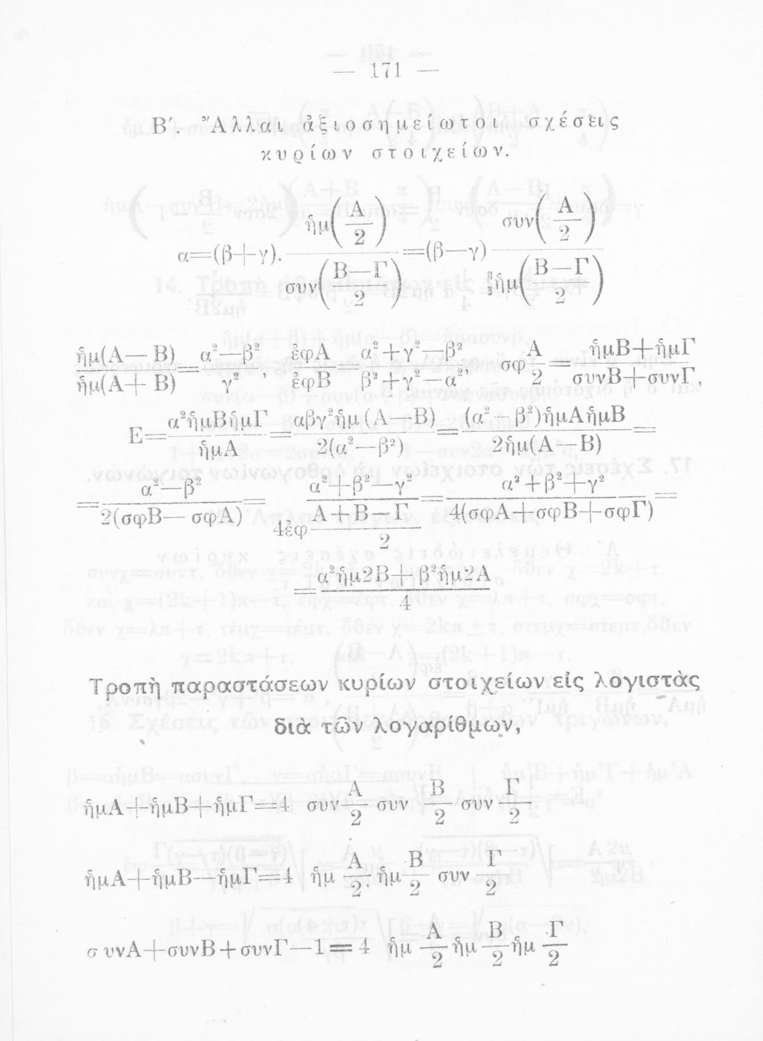 Βαθμίδα εκπαίδευσης: Δευτεροβάθμια Τάξη: Γυμνάσιο / Λύκειο Μάθημα: Μαθηματικά Γλώσσα: Καθαρεύουσα Παρουσίαση περιεχομένου: Μαθητικό βοήθημα το οποίο περιλαμβάνει λογαριθμικούς πίνακες των αριθμών από το 1 έως το 1000 και τους λογάριθμους των τεσσάρων κυριοτέρων τριγωνομετρικών αριθμών και τόξων. |