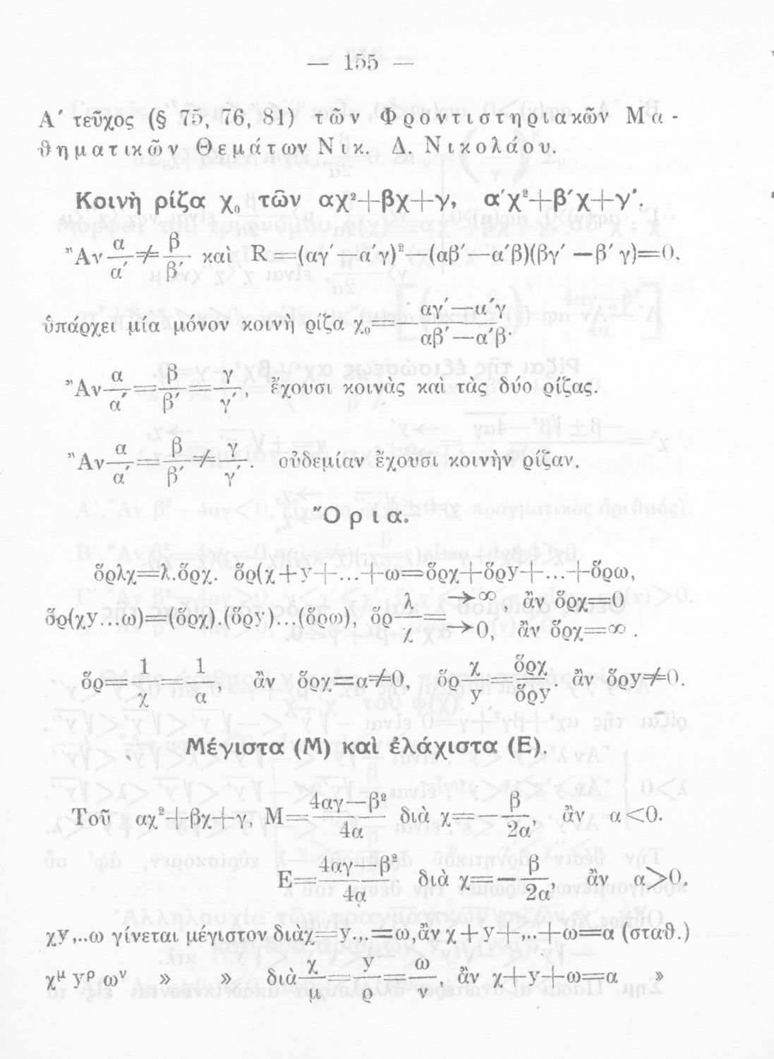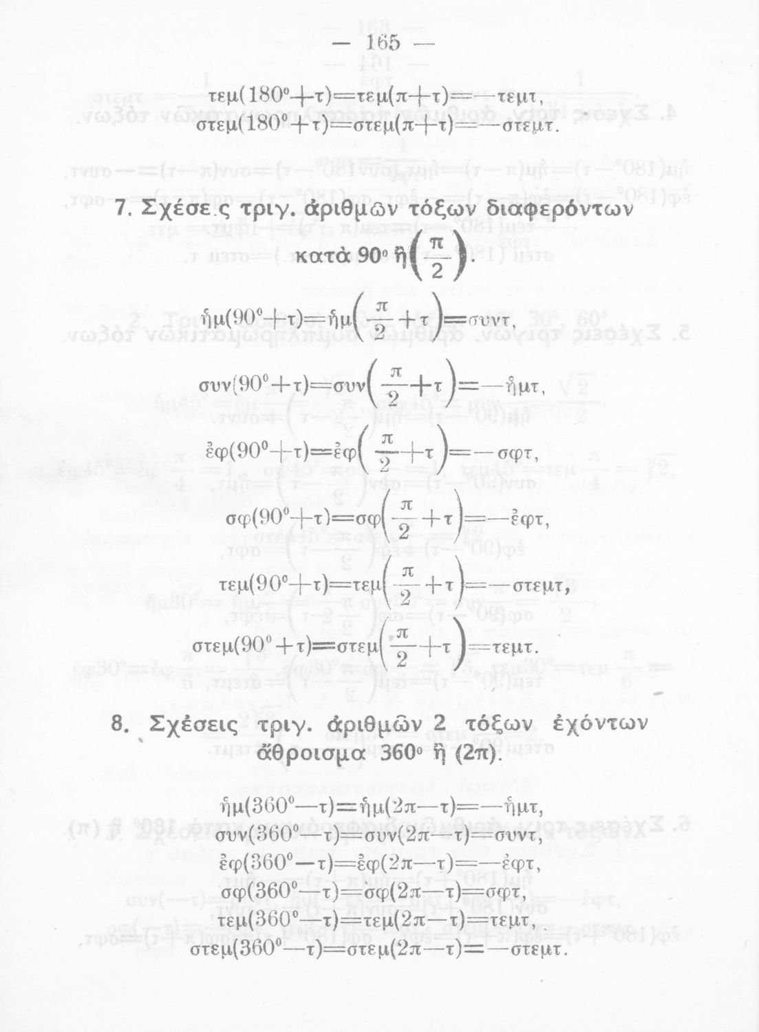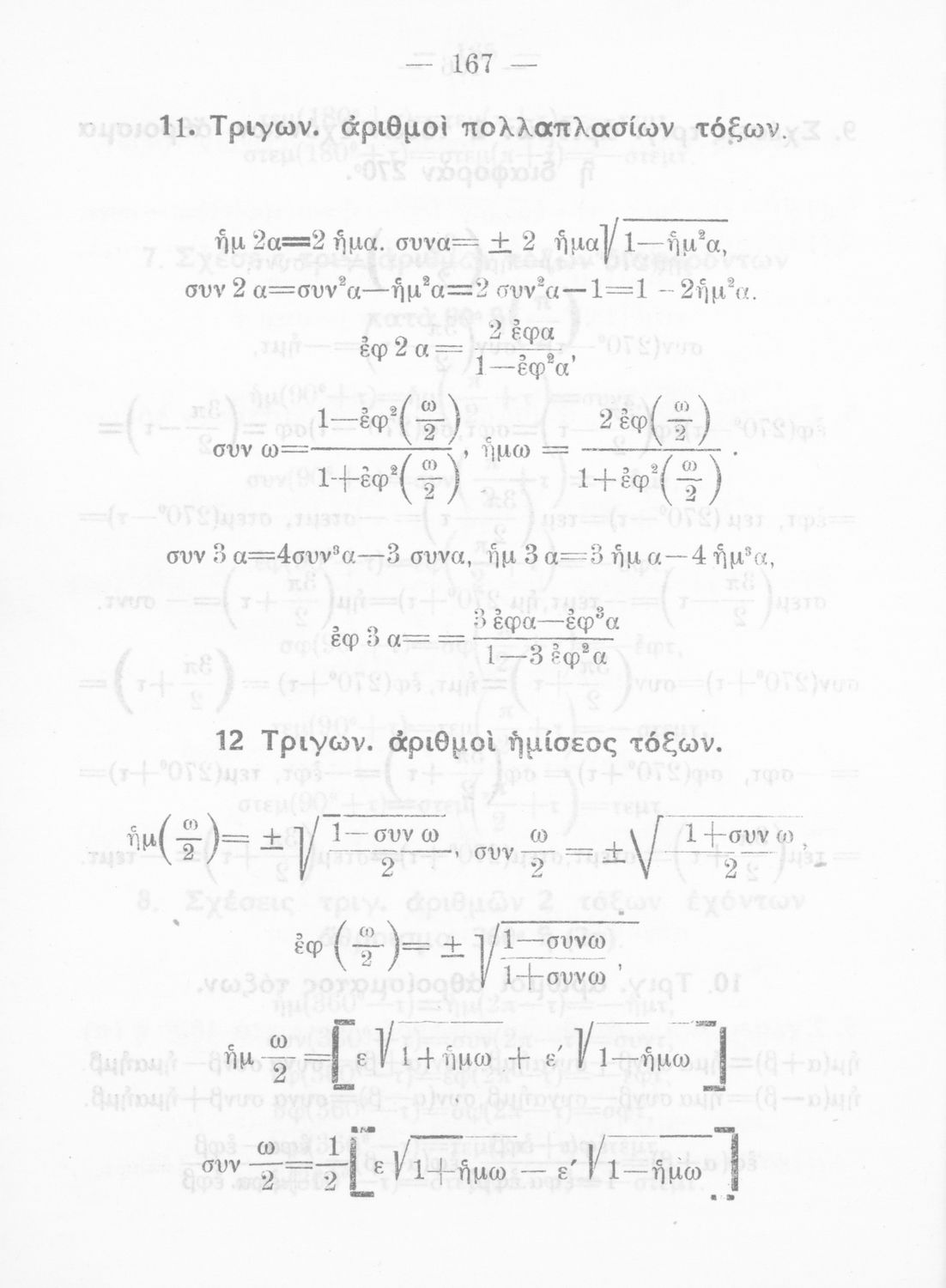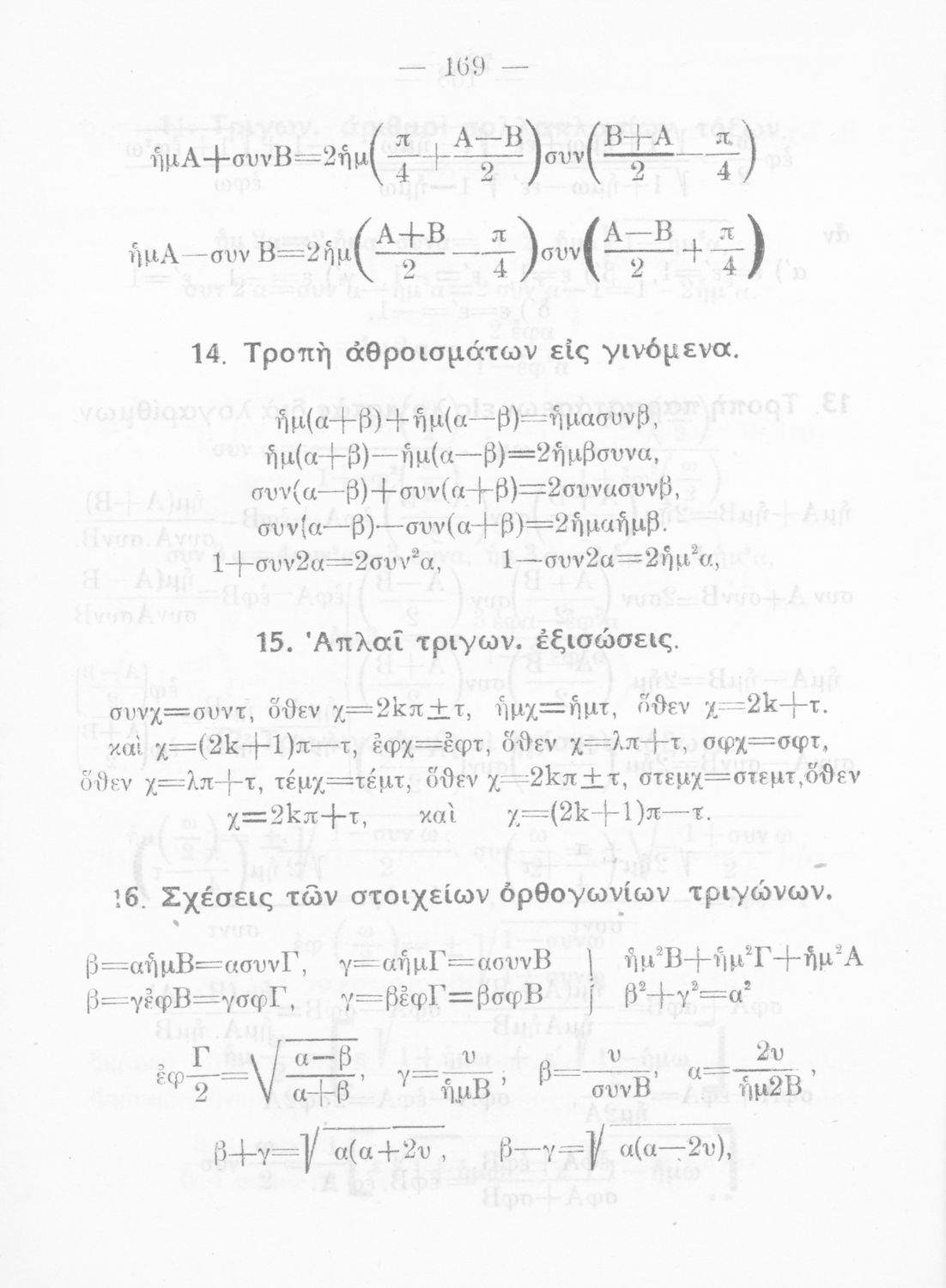 Βαθμίδα εκπαίδευσης: Δευτεροβάθμια Τάξη: Γυμνάσιο / Λύκειο Μάθημα: Μαθηματικά Γλώσσα: Καθαρεύουσα Παρουσίαση περιεχομένου: Μαθητικό βοήθημα το οποίο περιλαμβάνει λογαριθμικούς πίνακες των αριθμών από το 1 έως το 1000 και τους λογάριθμους των τεσσάρων κυριοτέρων τριγωνομετρικών αριθμών και τόξων. |