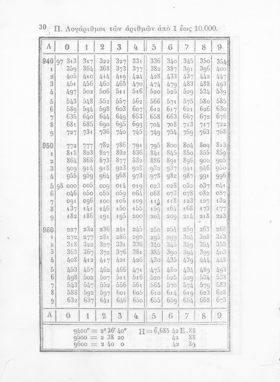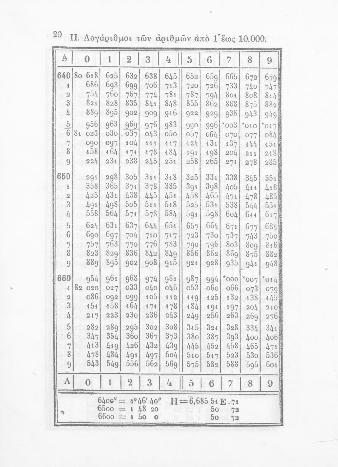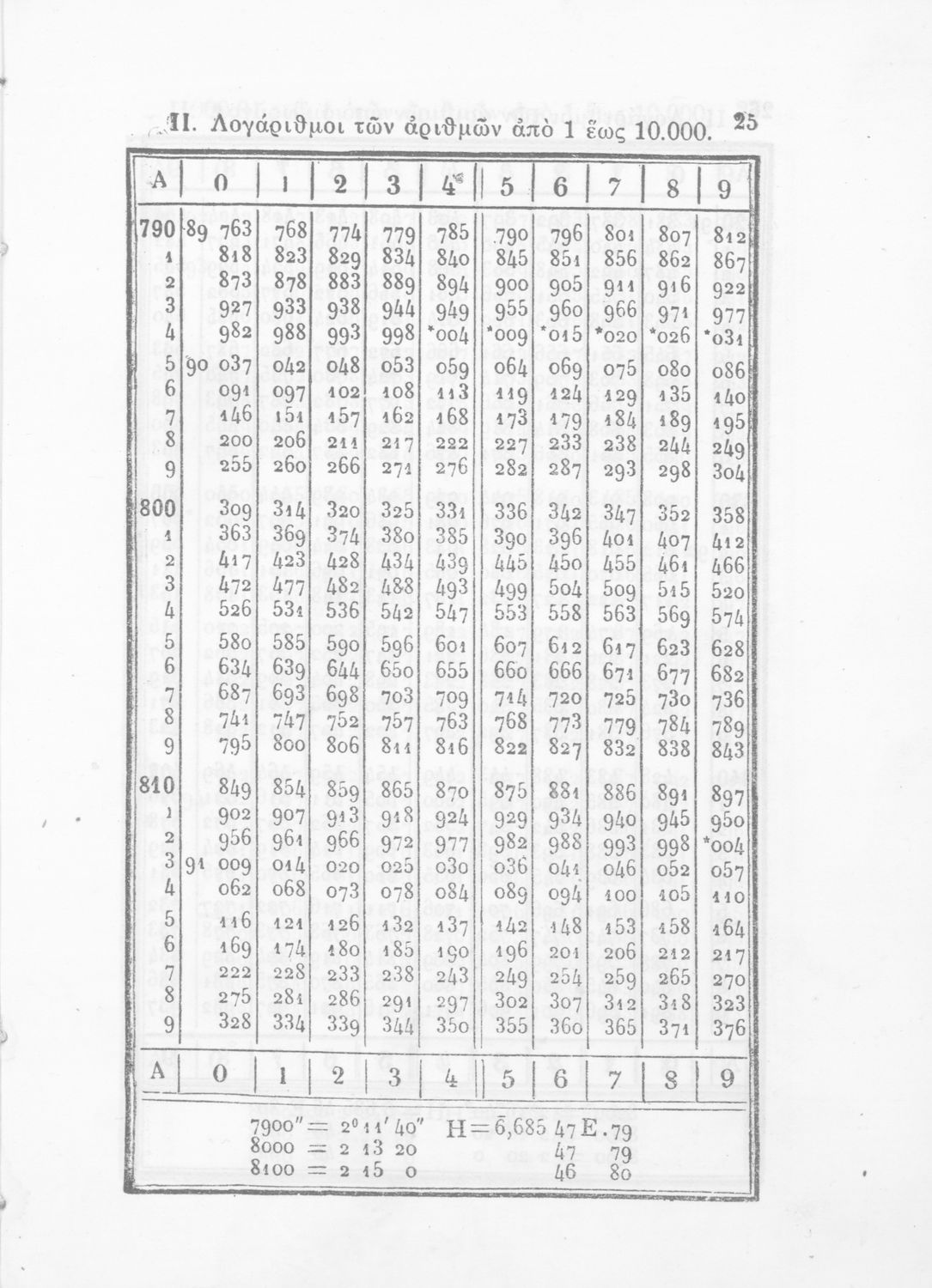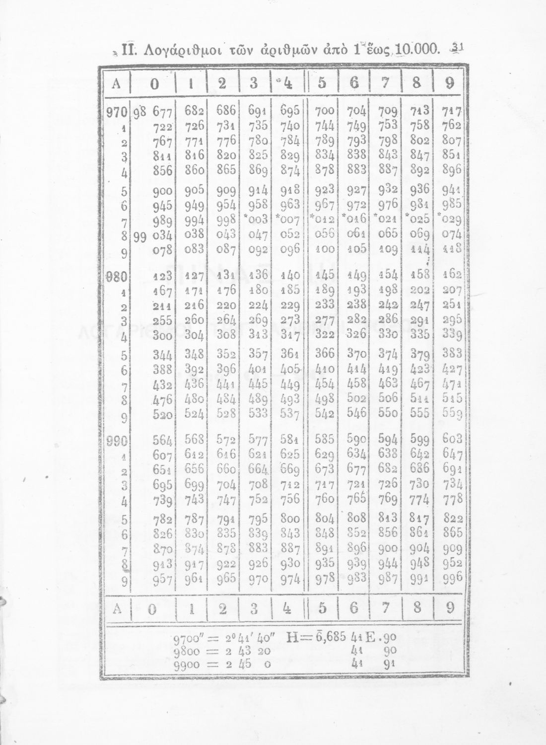Μαθητικό βοήθημα το οποίο περιλαμβάνει λογαριθμικούς πίνακες των αριθμών από το 1 έως το 1000 και τους λογάριθμους των τεσσάρων κυριοτέρων τριγωνομετρικών αριθμών και τόξων.