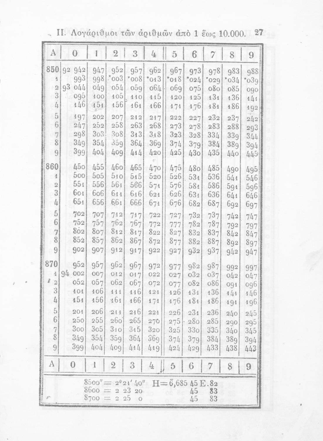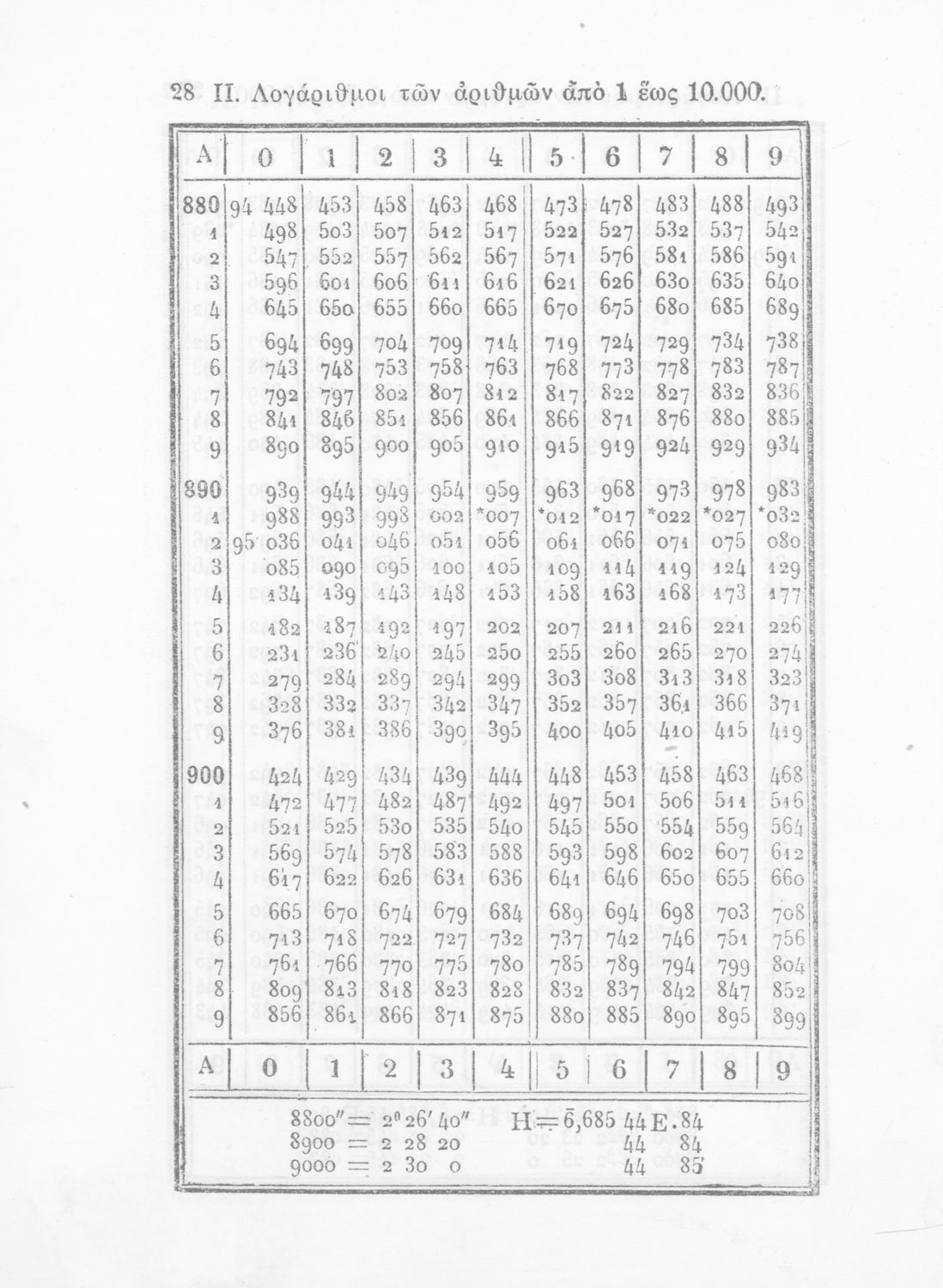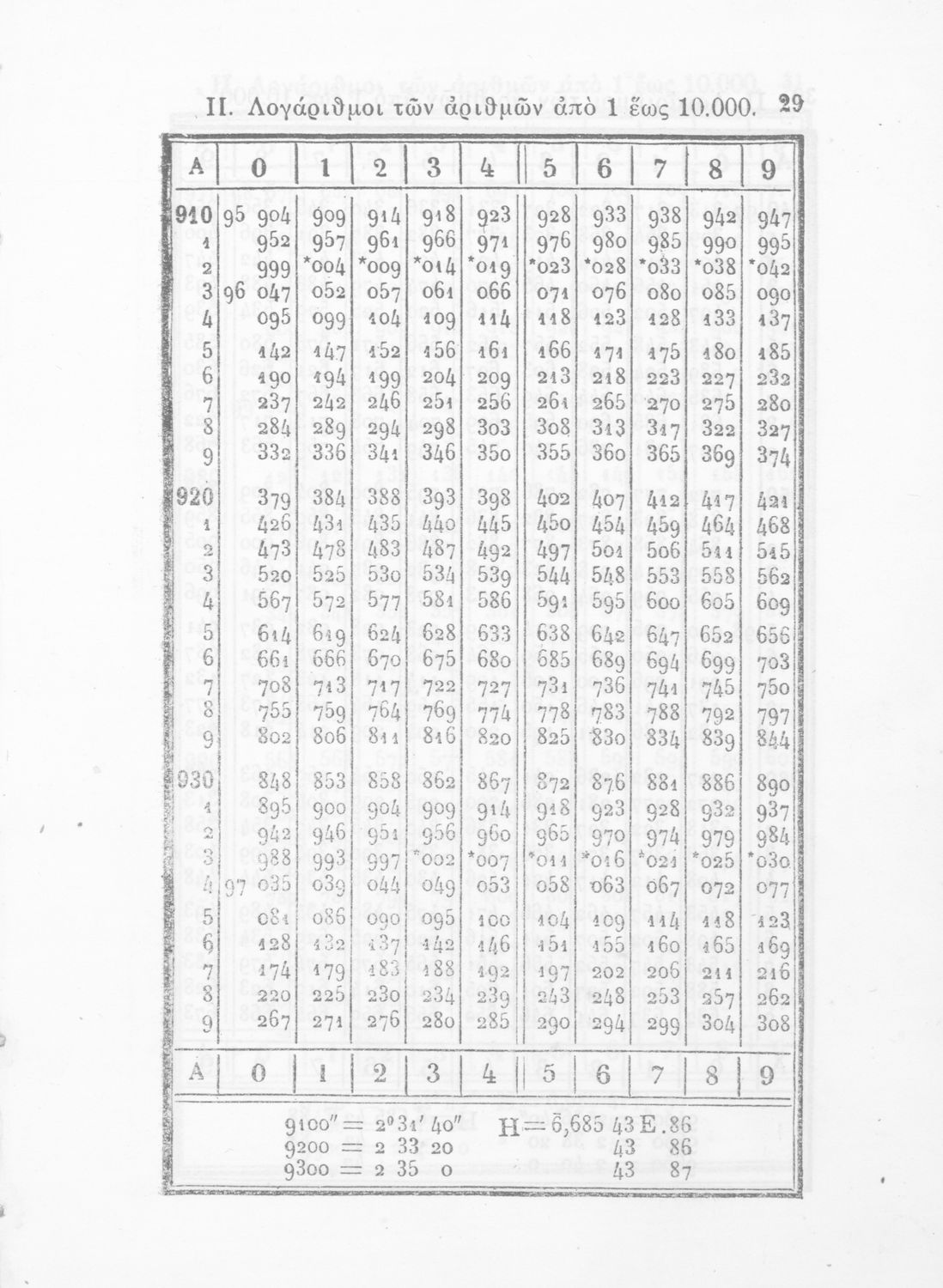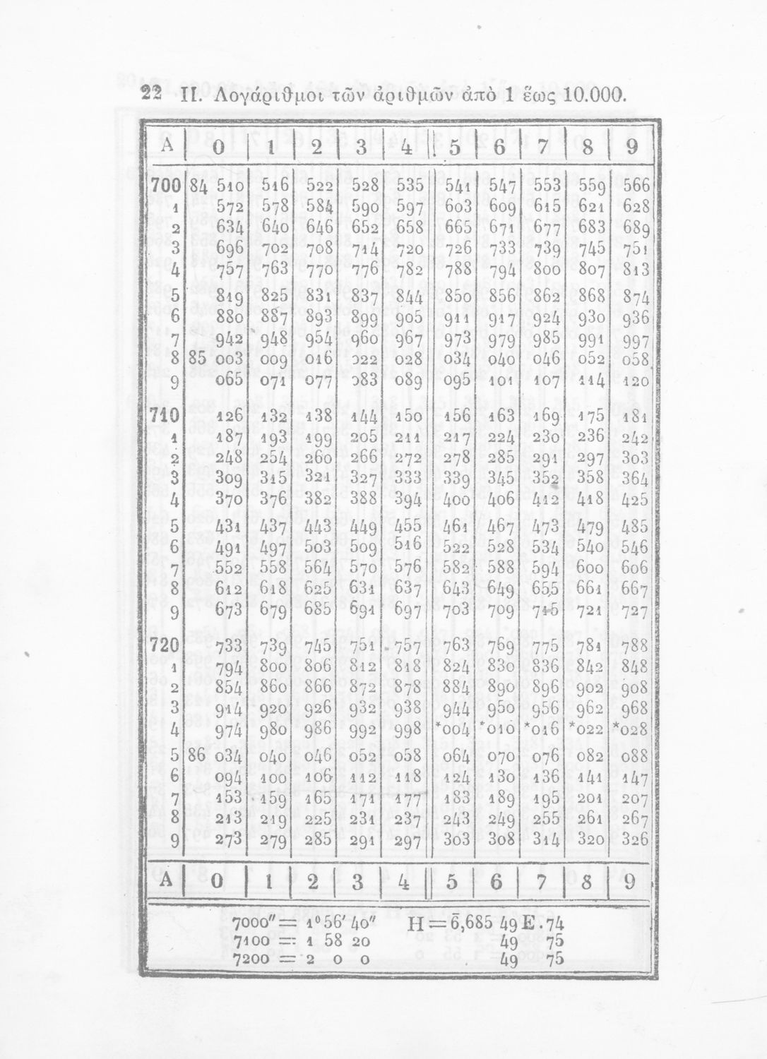 Μαθητικό βοήθημα το οποίο περιλαμβάνει λογαριθμικούς πίνακες των αριθμών από το 1 έως το 1000 και τους λογάριθμους των τεσσάρων κυριοτέρων τριγωνομετρικών αριθμών και τόξων.