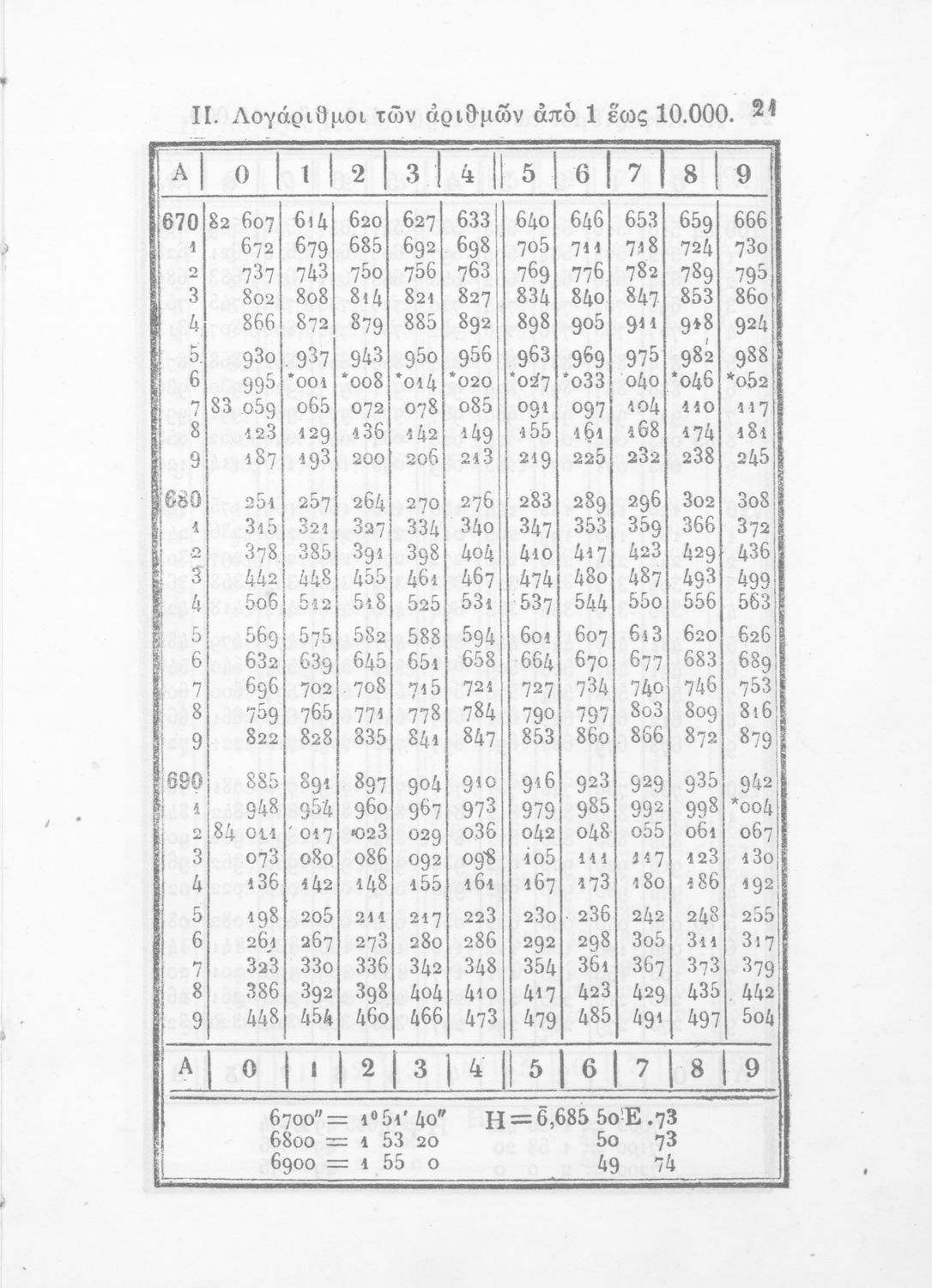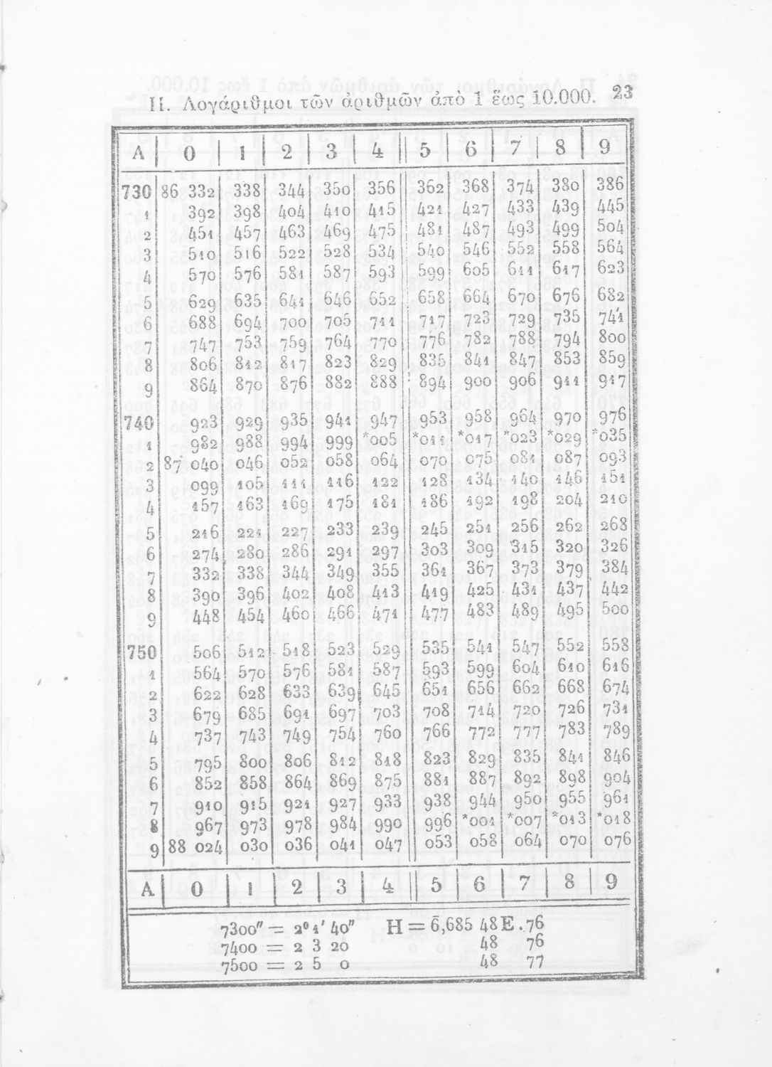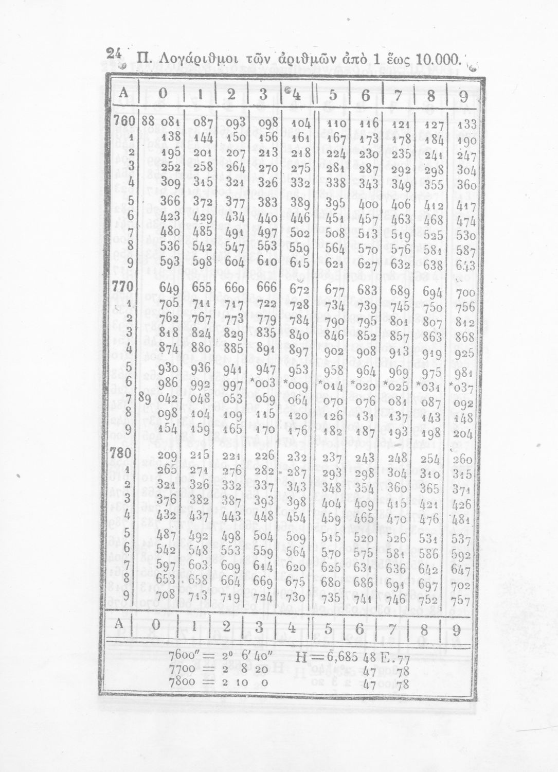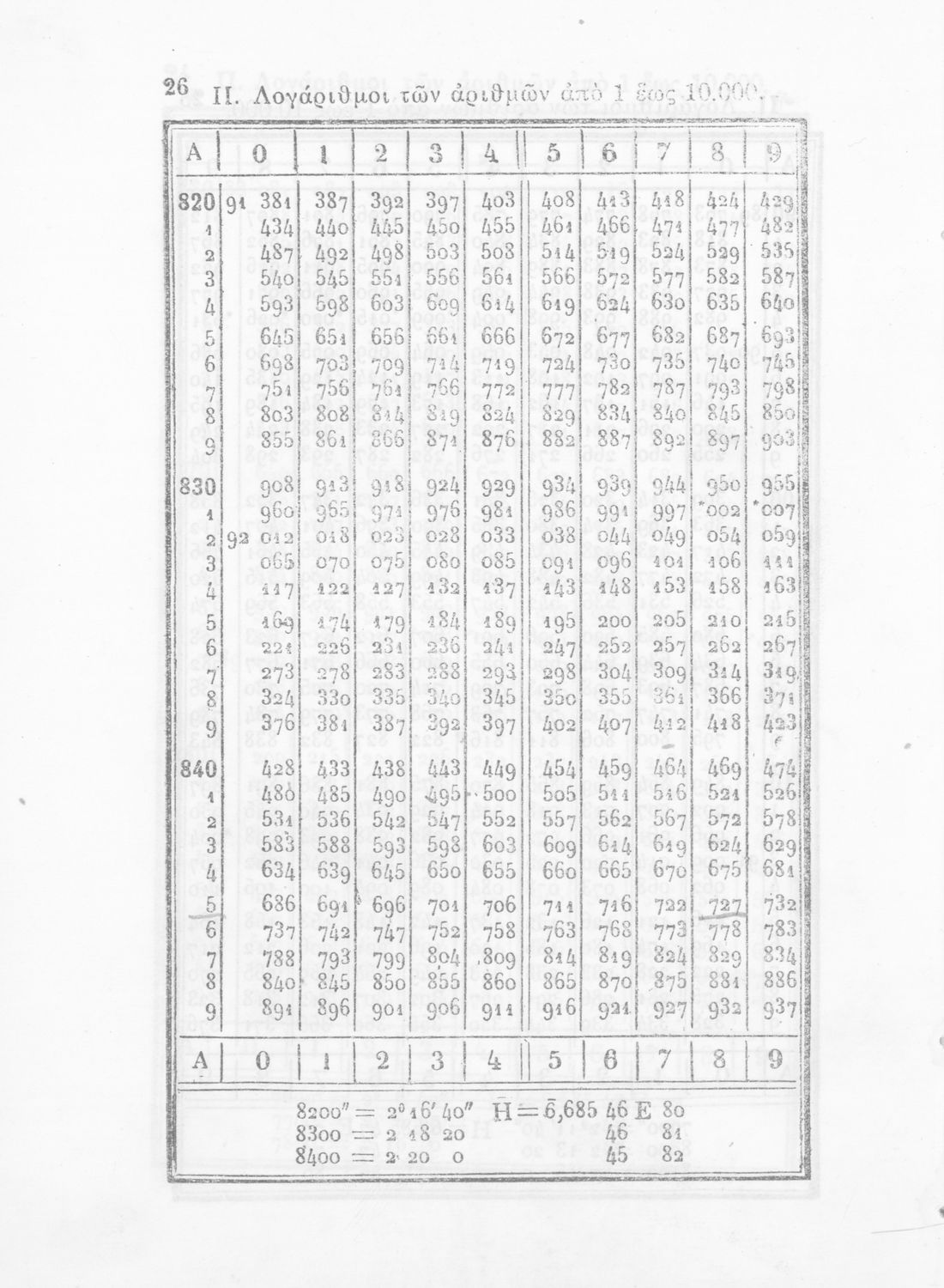 Μαθητικό βοήθημα το οποίο περιλαμβάνει λογαριθμικούς πίνακες των αριθμών από το 1 έως το 1000 και τους λογάριθμους των τεσσάρων κυριοτέρων τριγωνομετρικών αριθμών και τόξων.