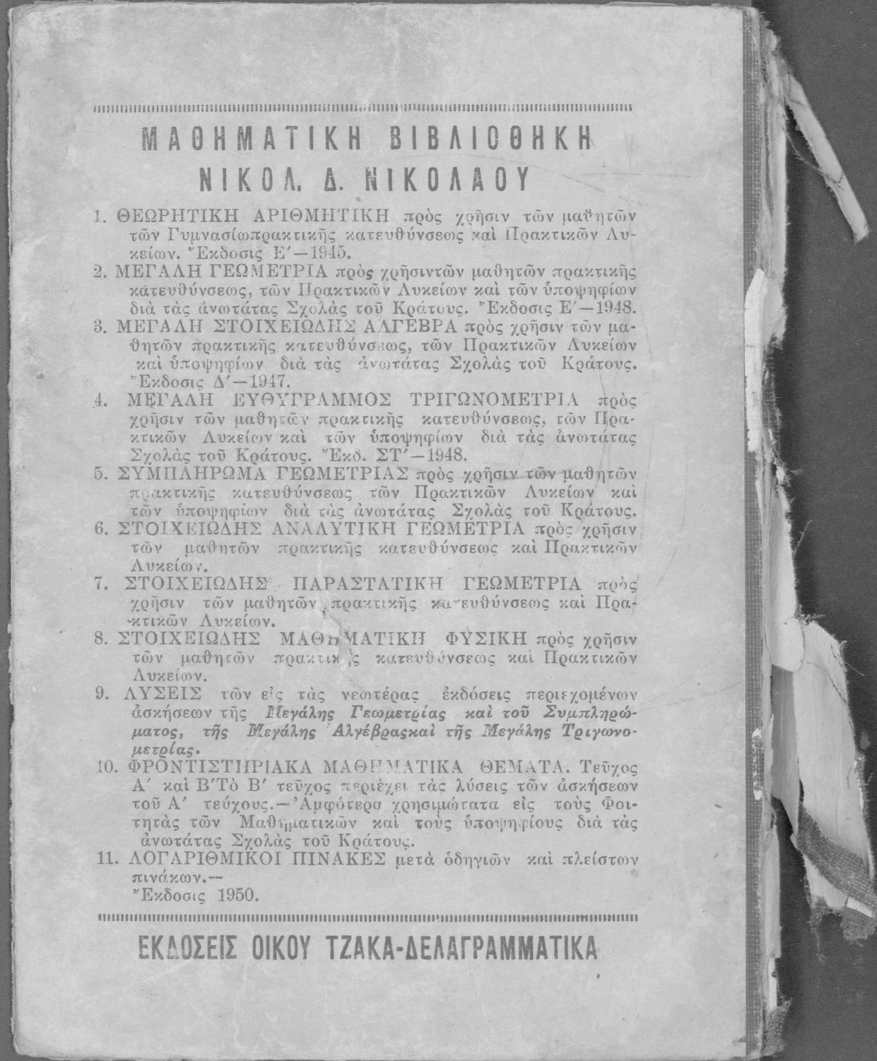 Παρουσίαση περιεχομένου: Μαθητικό βοήθημα το οποίο περιλαμβάνει λογαριθμικούς πίνακες των αριθμών από το 1 έως το 1000 και τους λογάριθμους των τεσσάρων κυριοτέρων τριγωνομετρικών αριθμών και τόξων.
