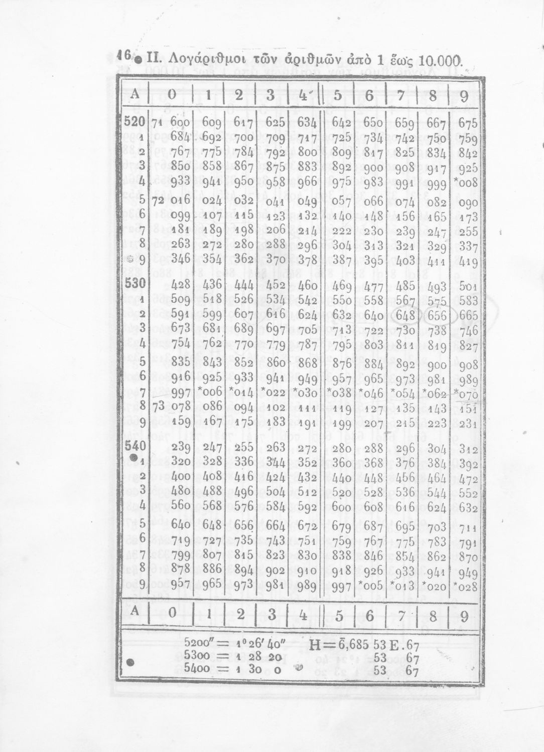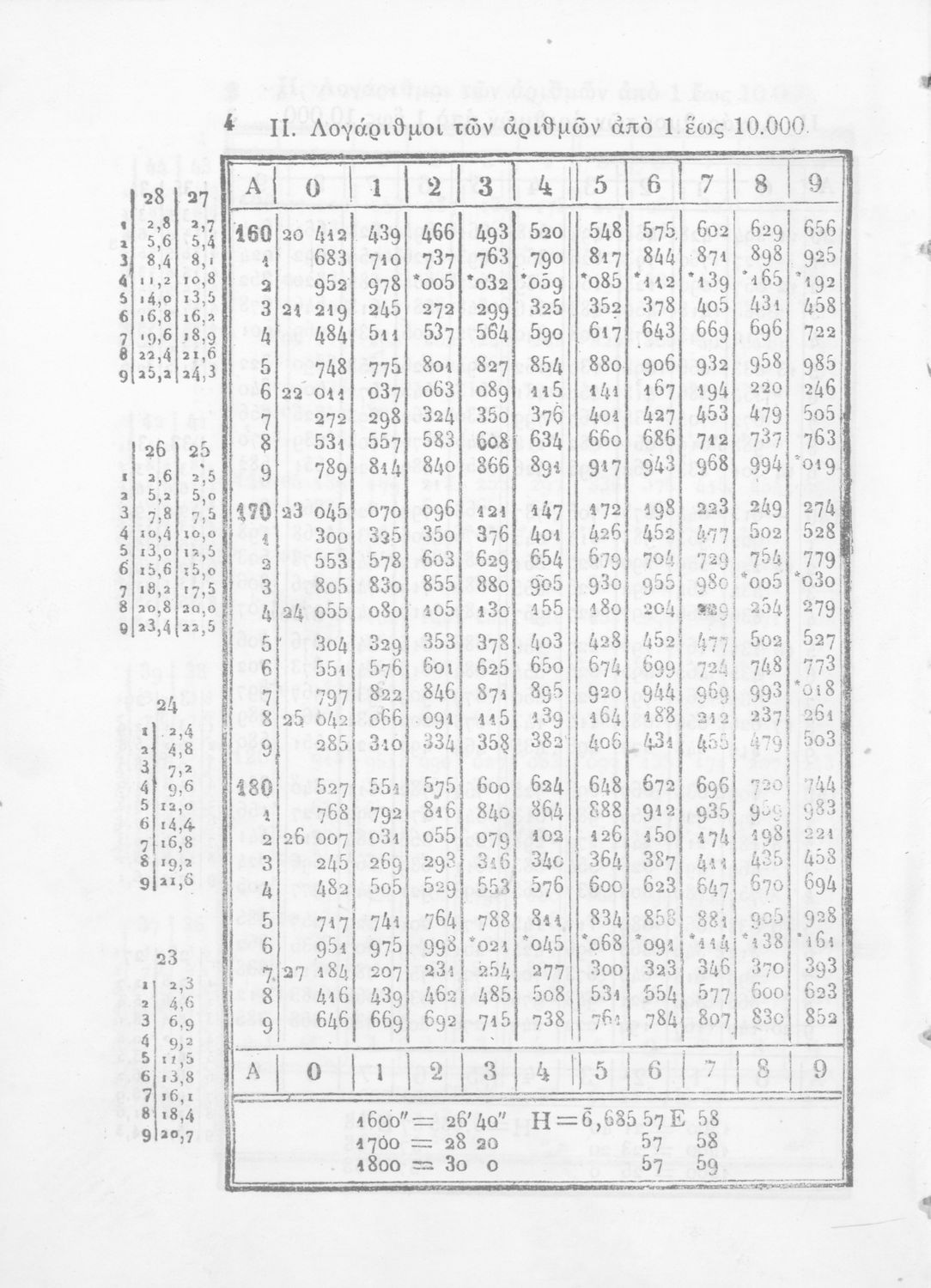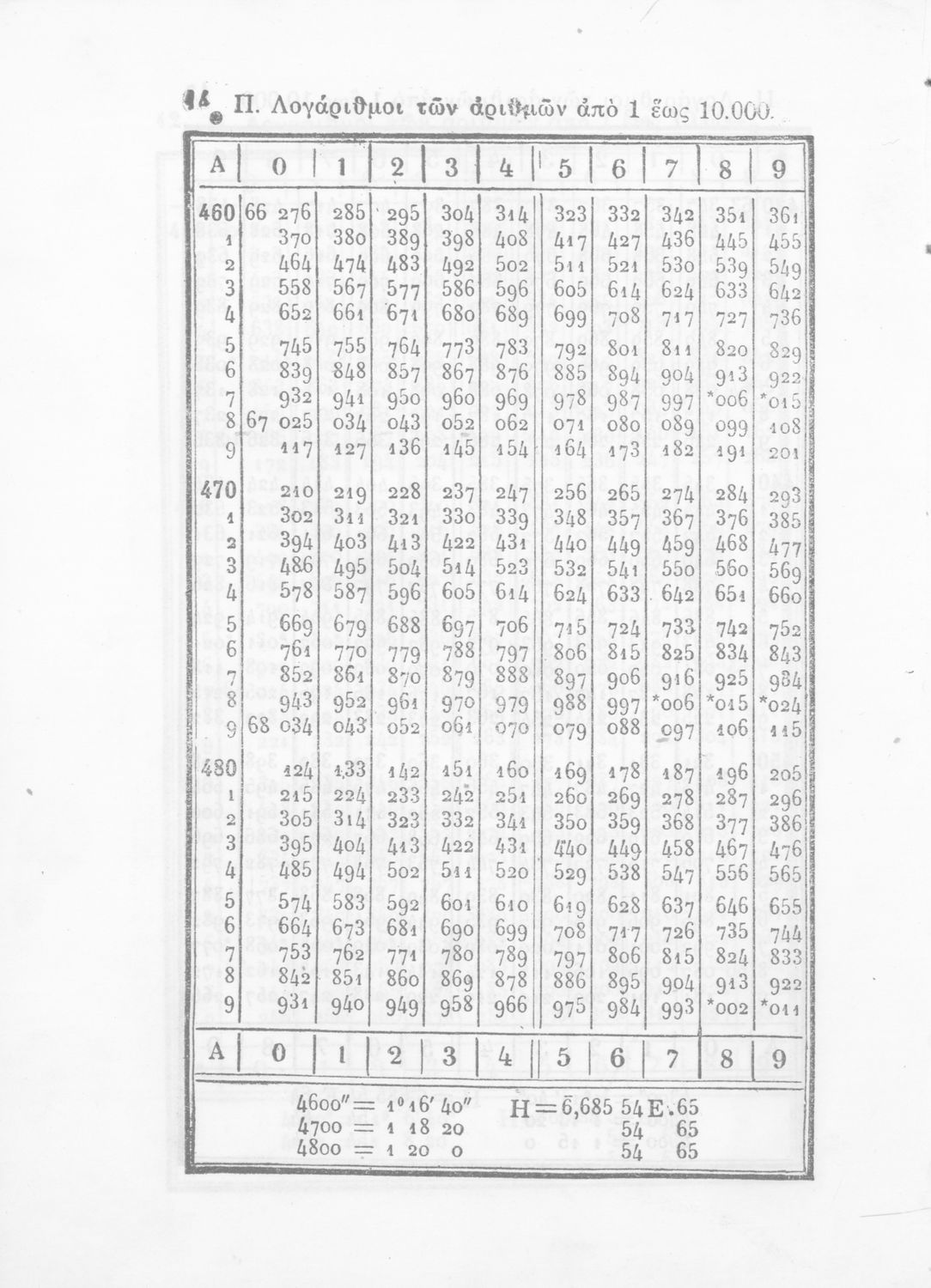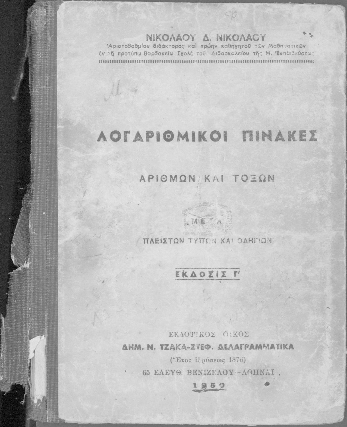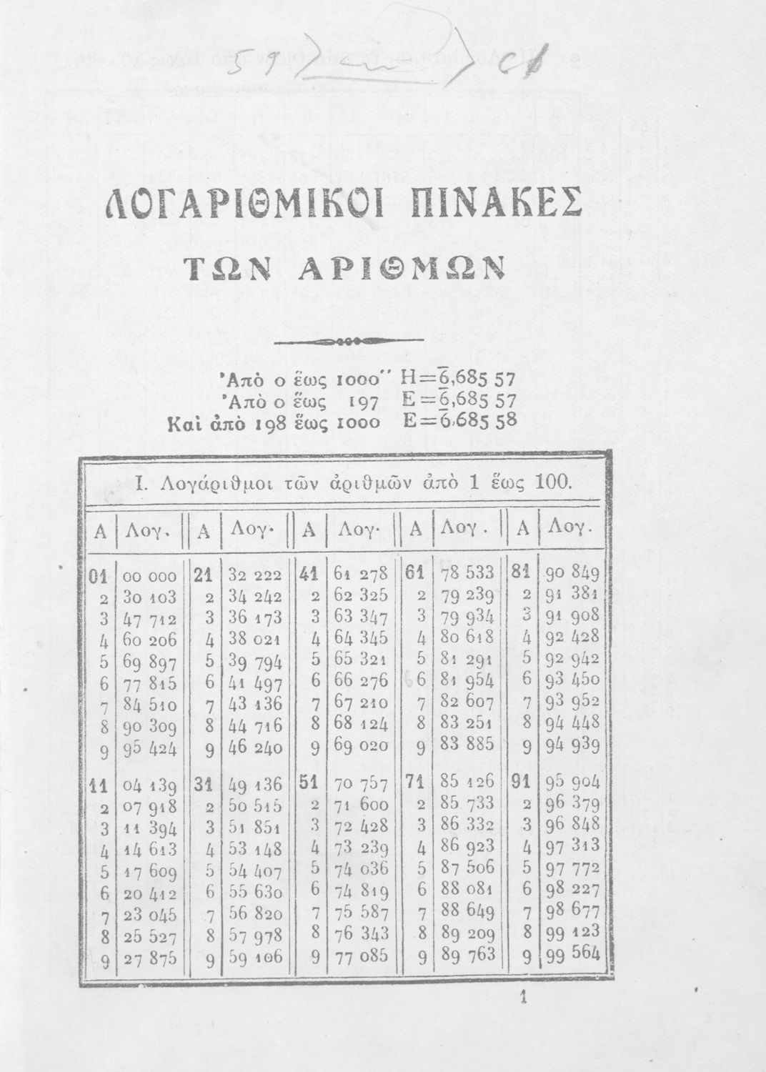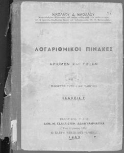 Μαθητικό βοήθημα το οποίο περιλαμβάνει λογαριθμικούς πίνακες των αριθμών από το 1 έως το 1000 και τους λογάριθμους των τεσσάρων κυριοτέρων τριγωνομετρικών αριθμών και τόξων.