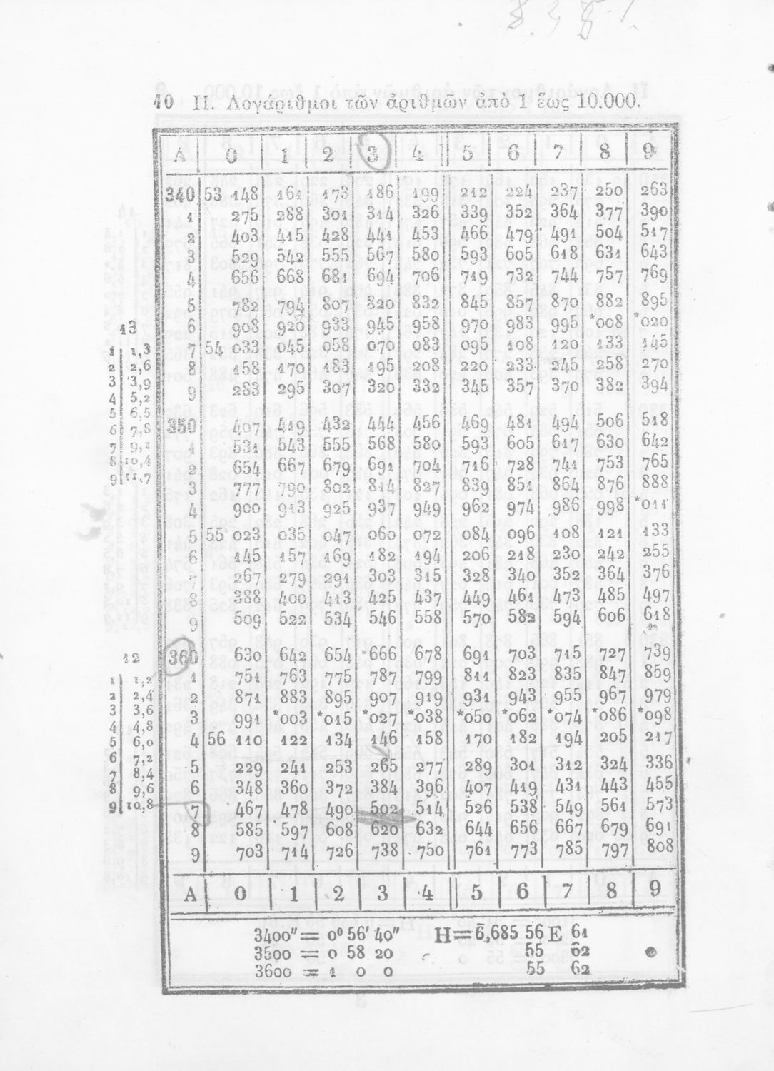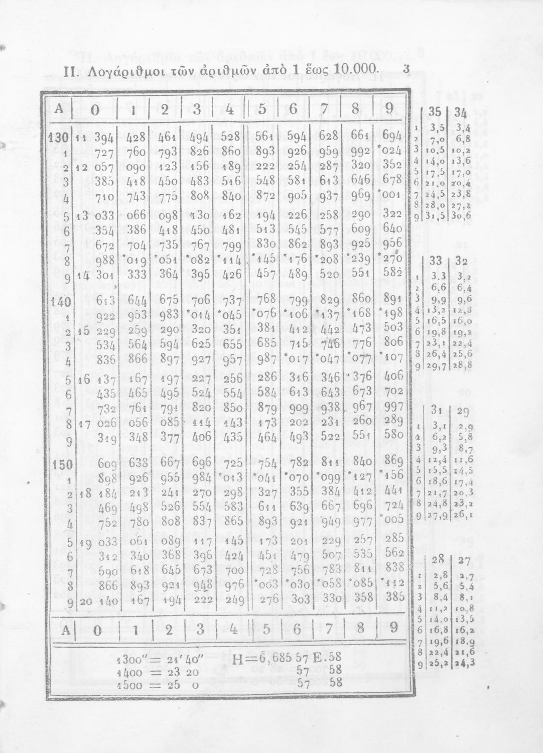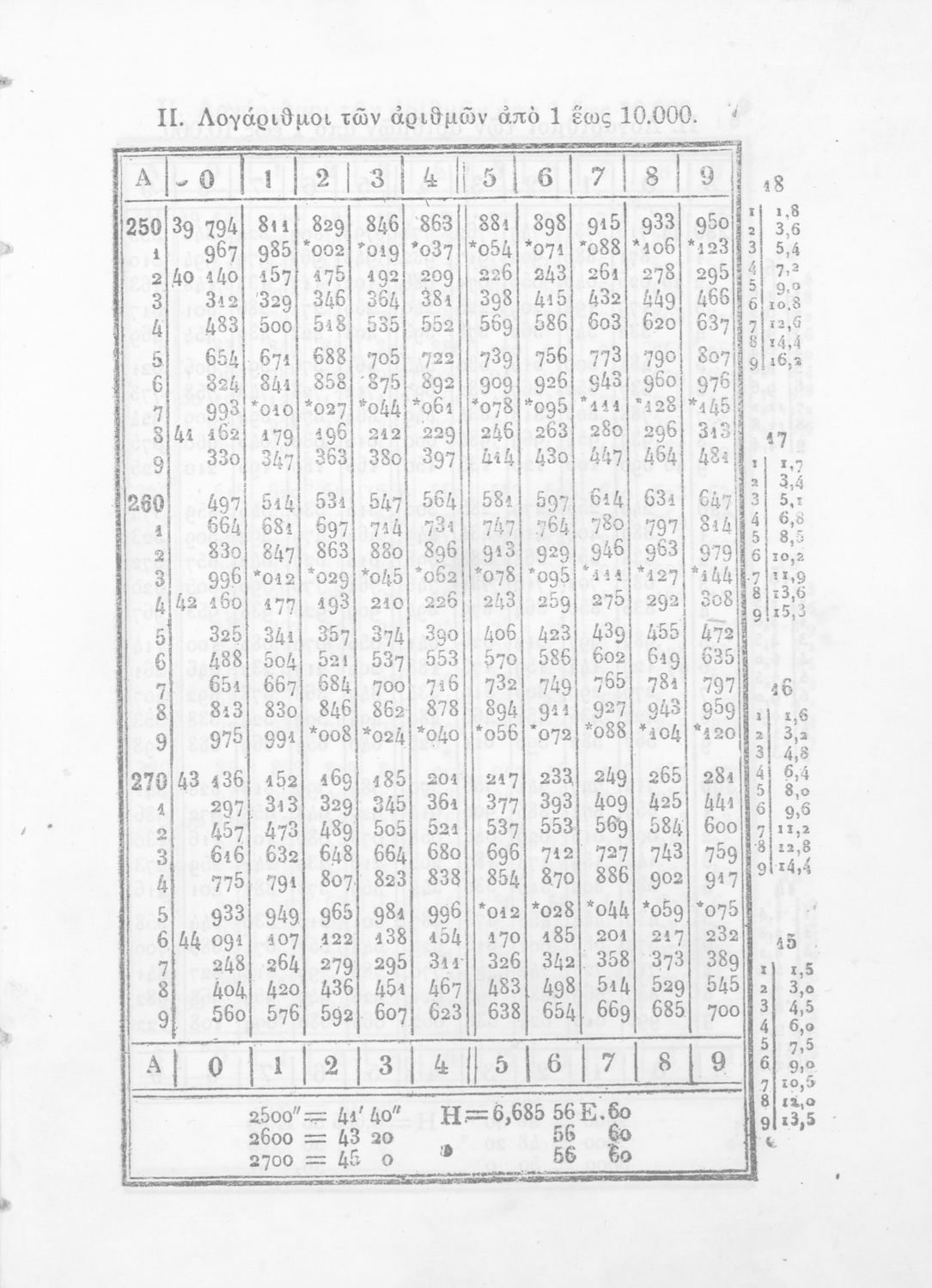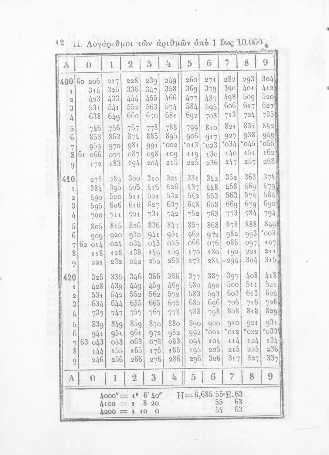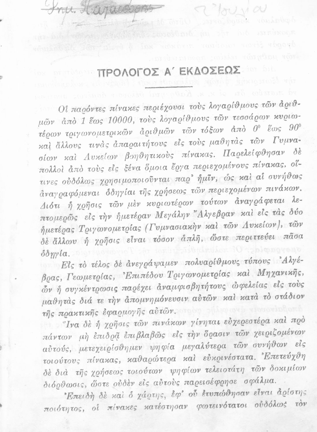 Μαθητικό βοήθημα το οποίο περιλαμβάνει λογαριθμικούς πίνακες των αριθμών από το 1 έως το 1000 και τους λογάριθμους των τεσσάρων κυριοτέρων τριγωνομετρικών αριθμών και τόξων.