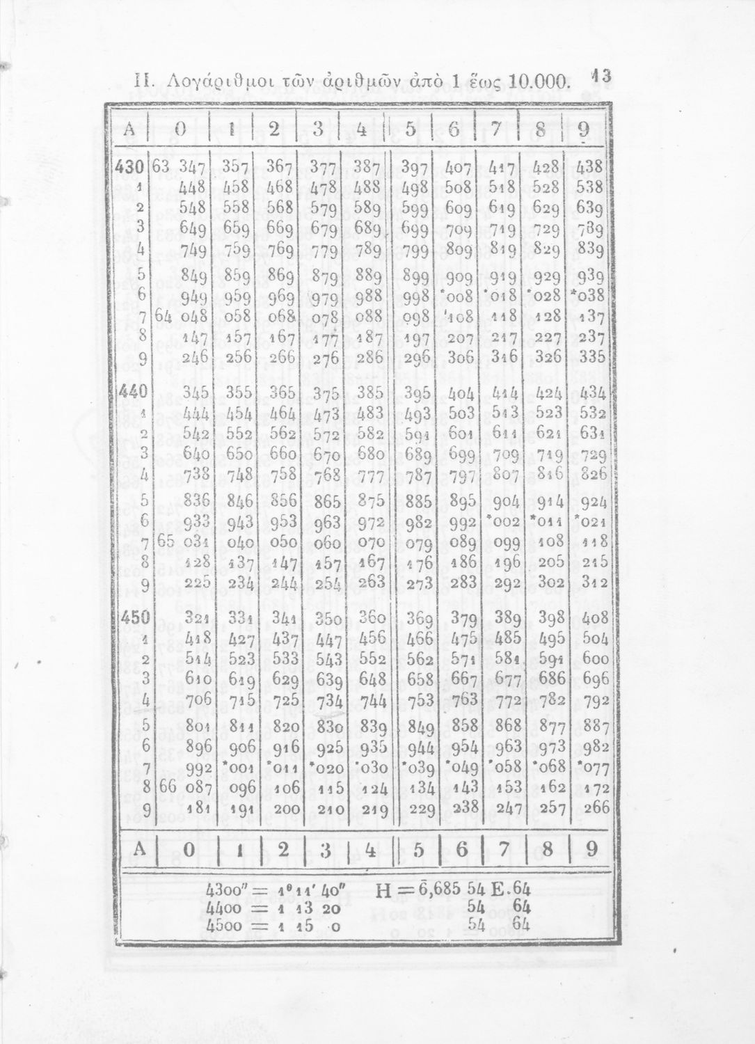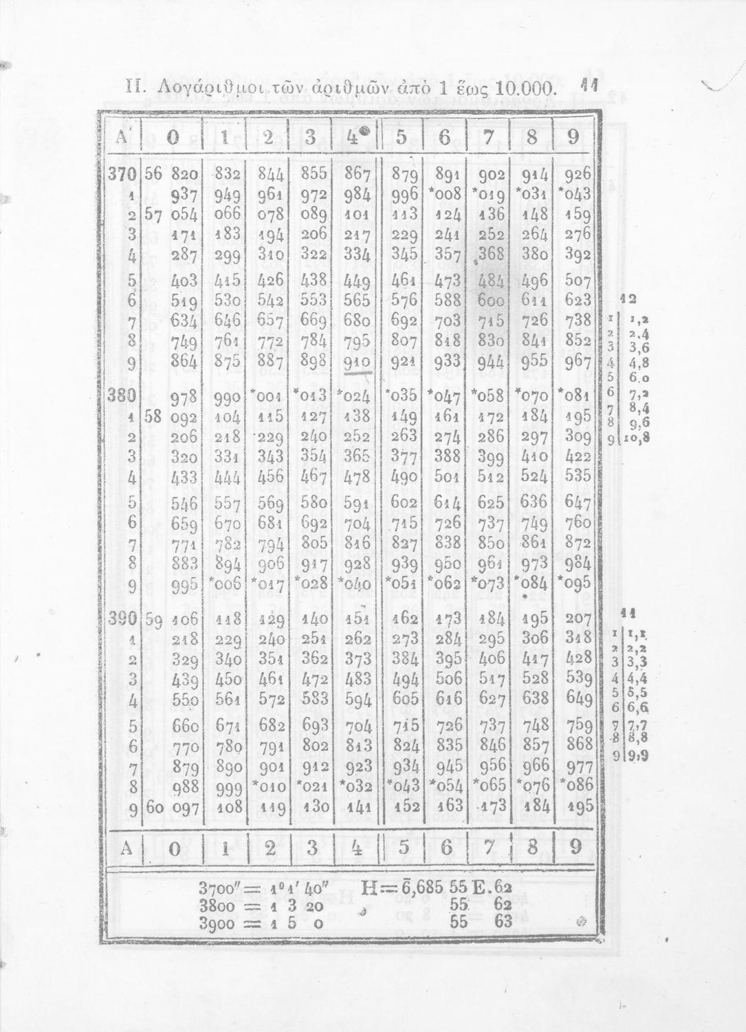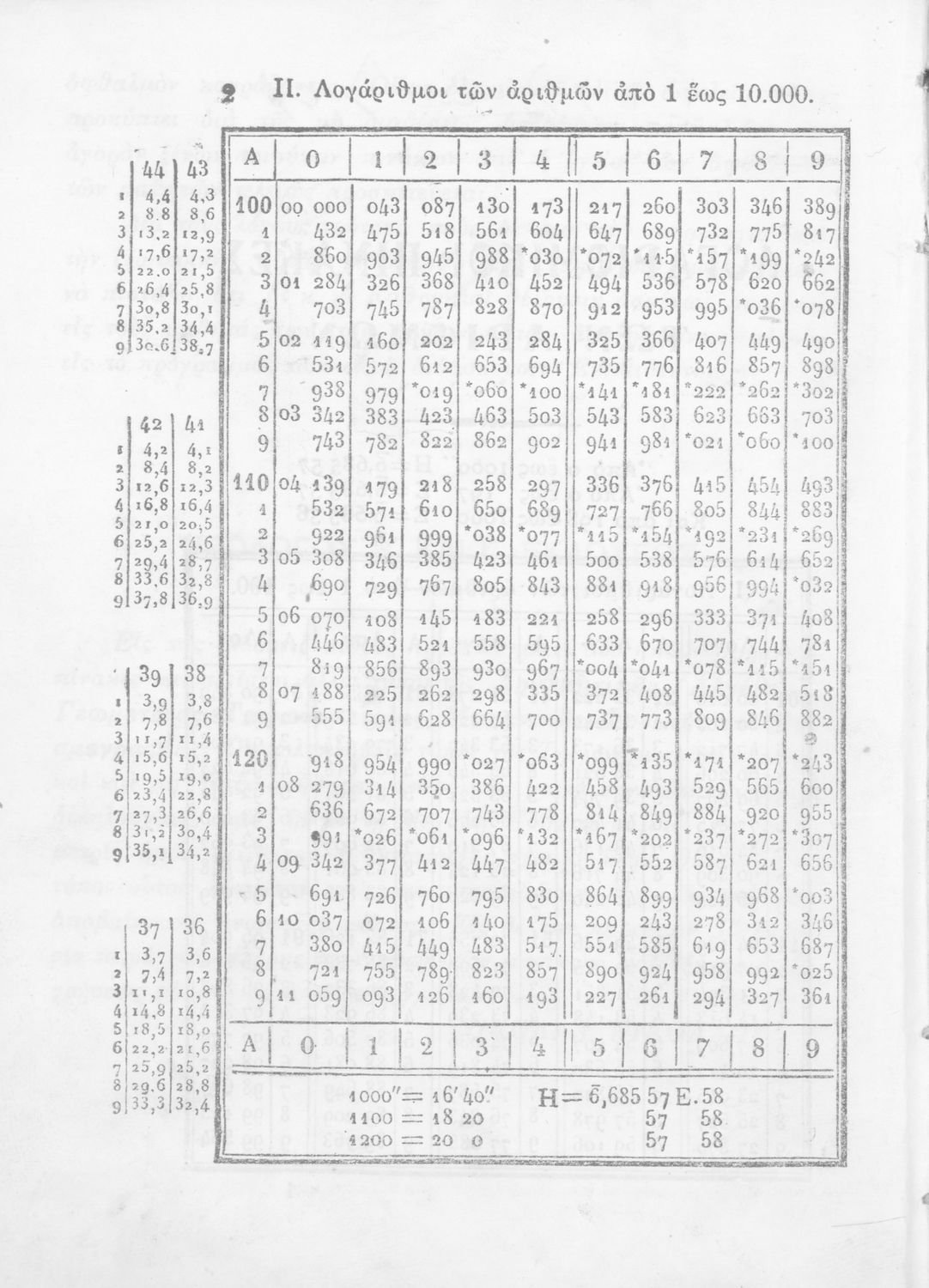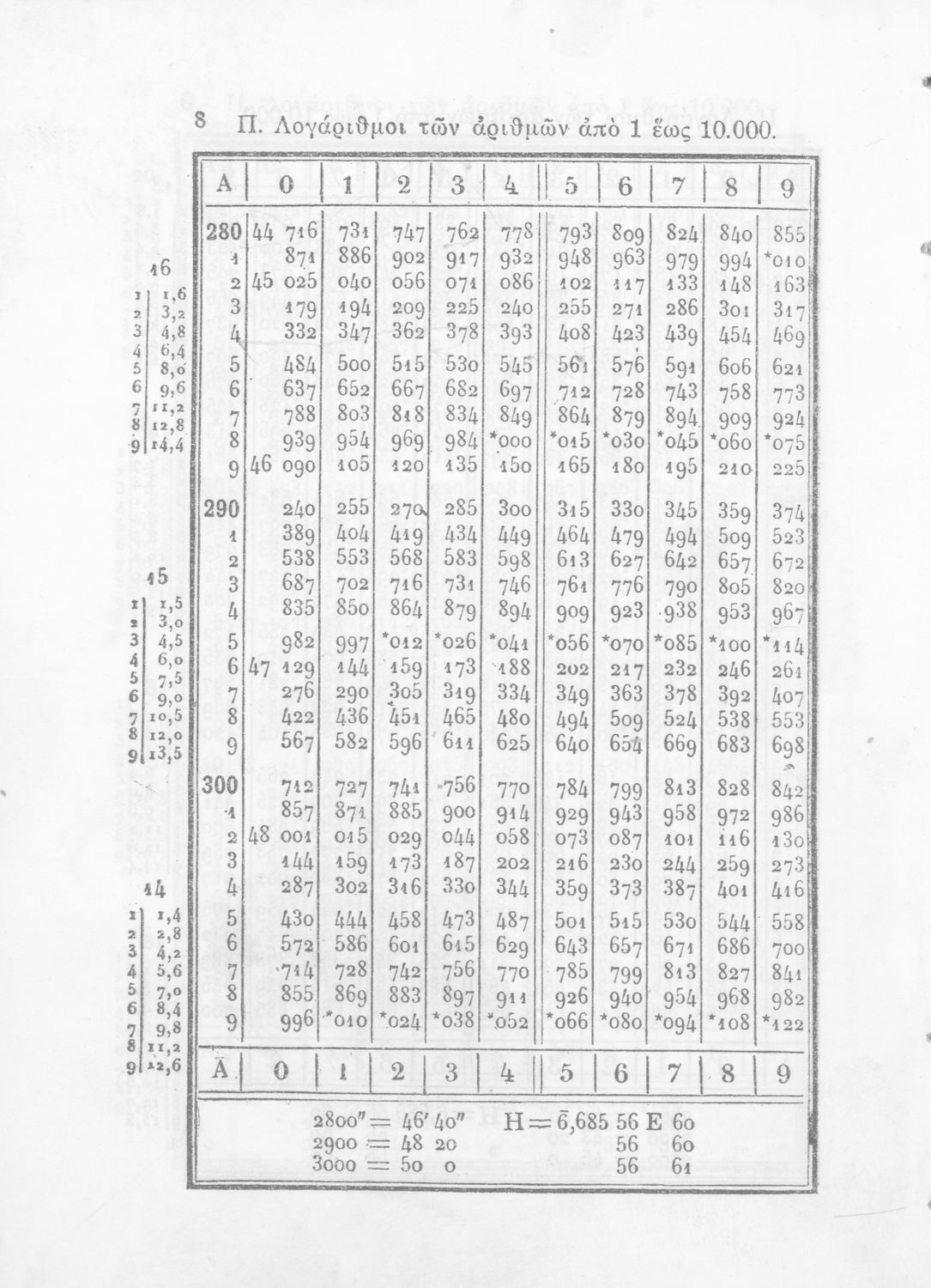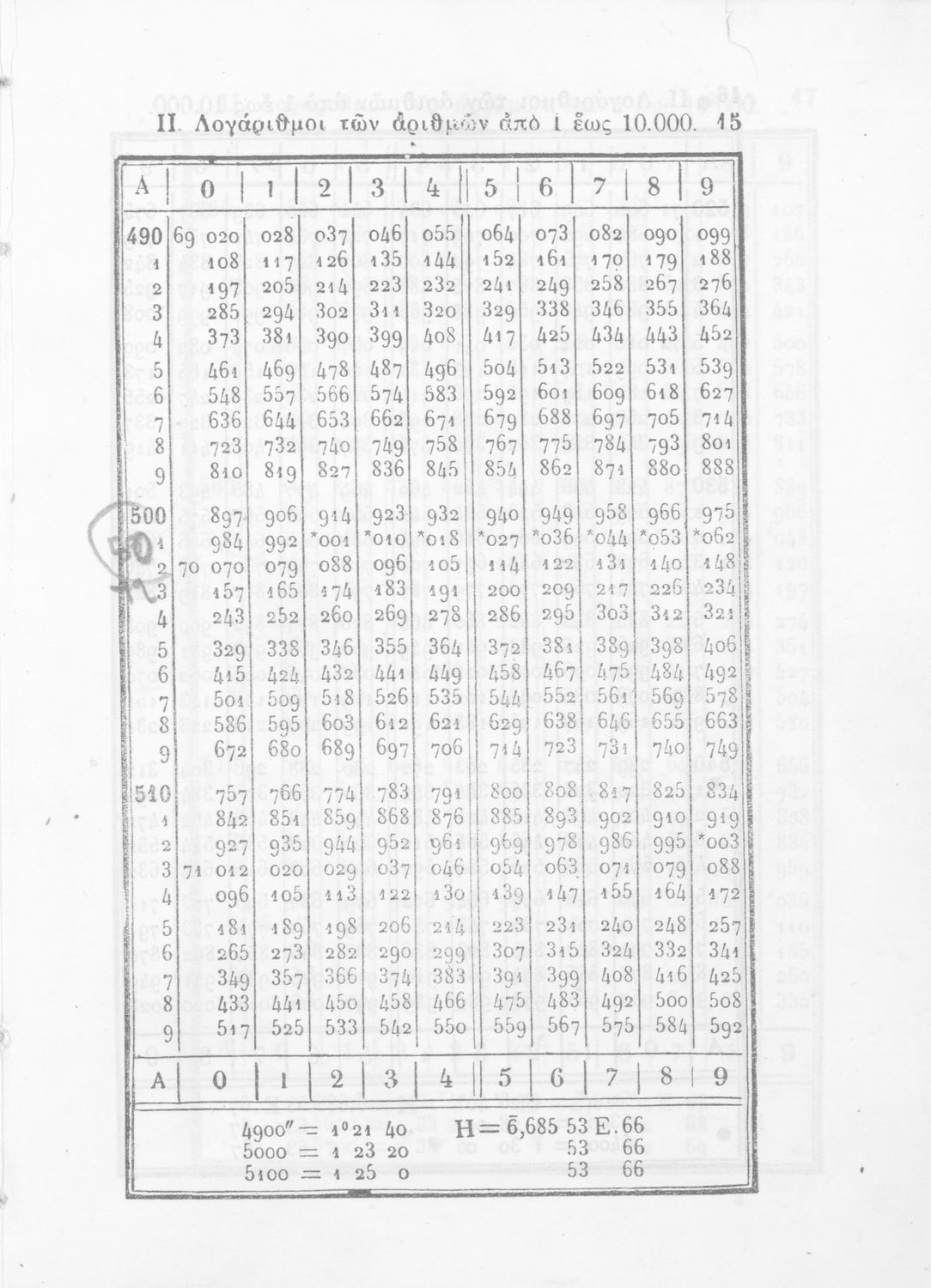 Μαθητικό βοήθημα το οποίο περιλαμβάνει λογαριθμικούς πίνακες των αριθμών από το 1 έως το 1000 και τους λογάριθμους των τεσσάρων κυριοτέρων τριγωνομετρικών αριθμών και τόξων.