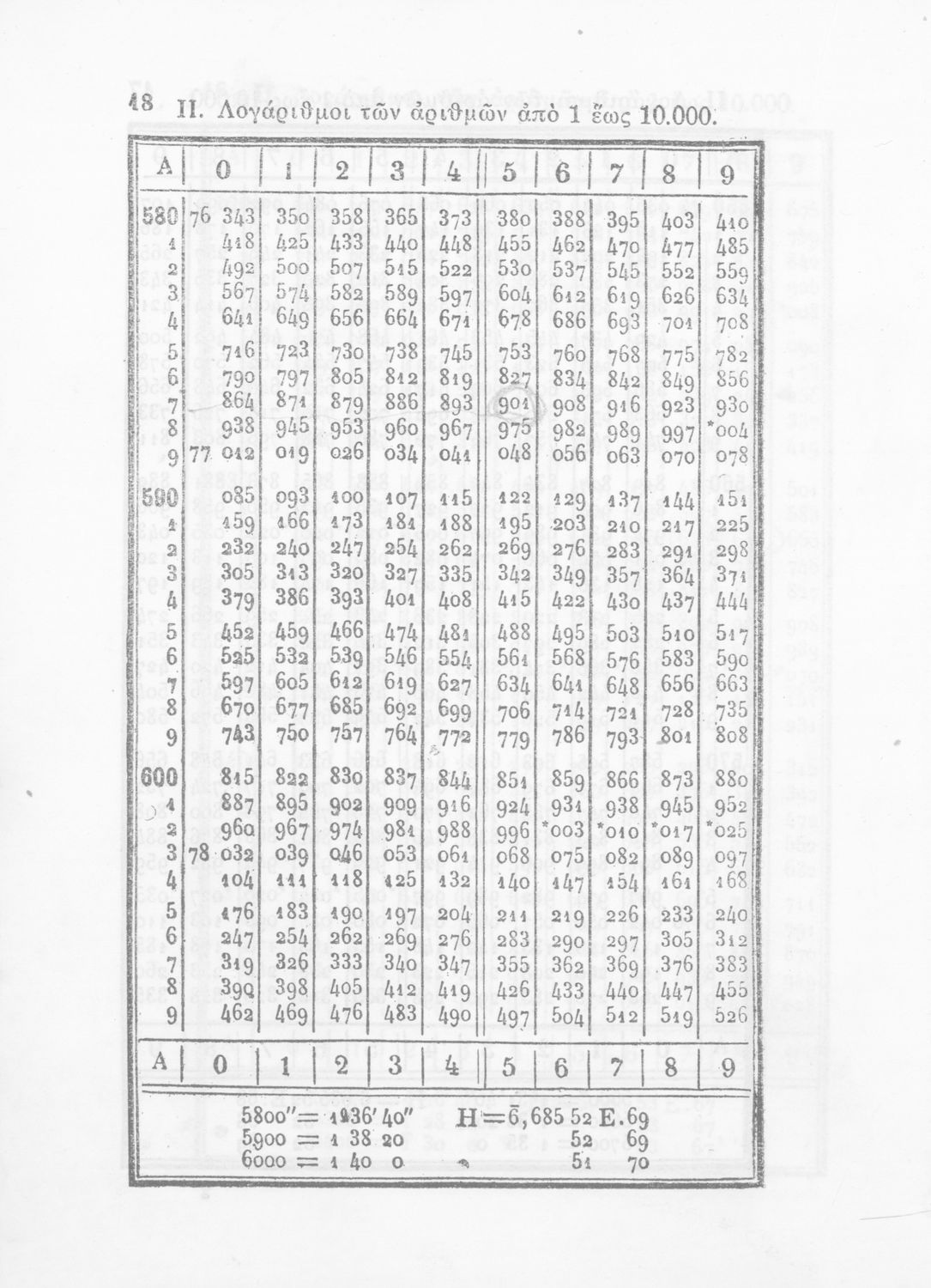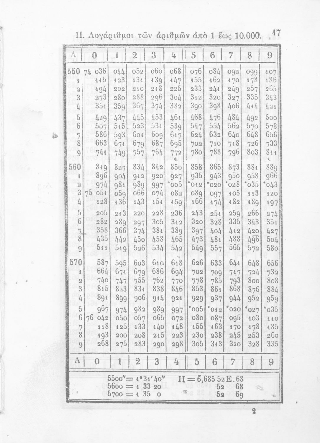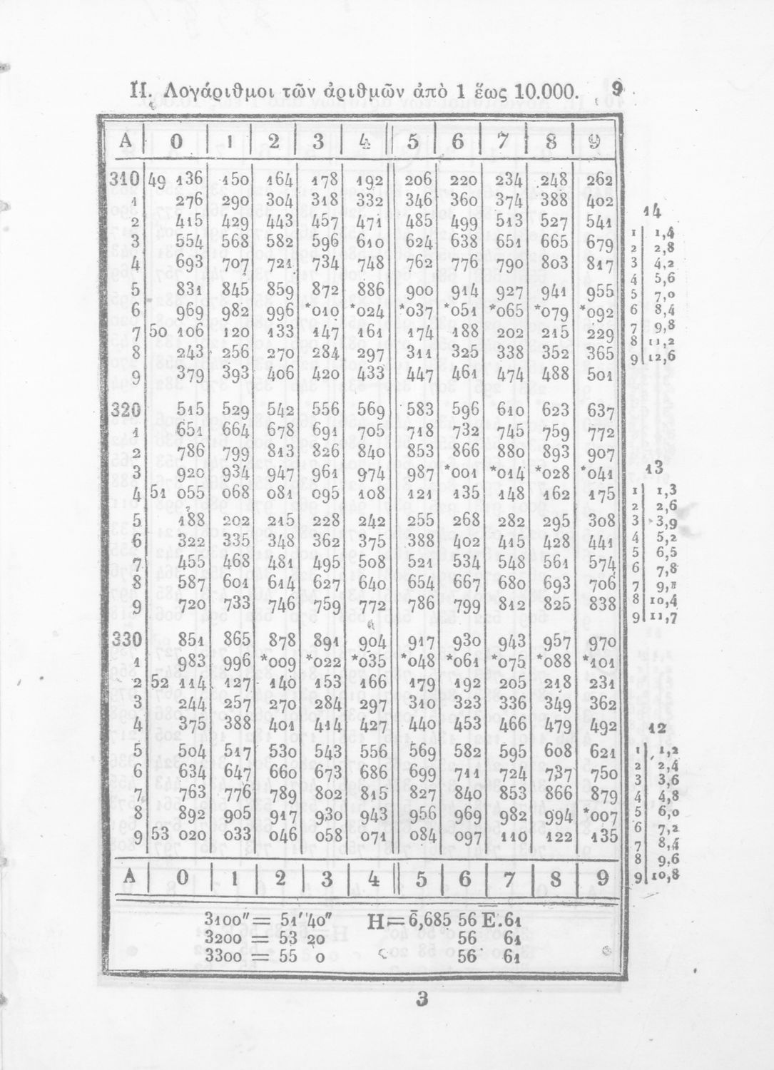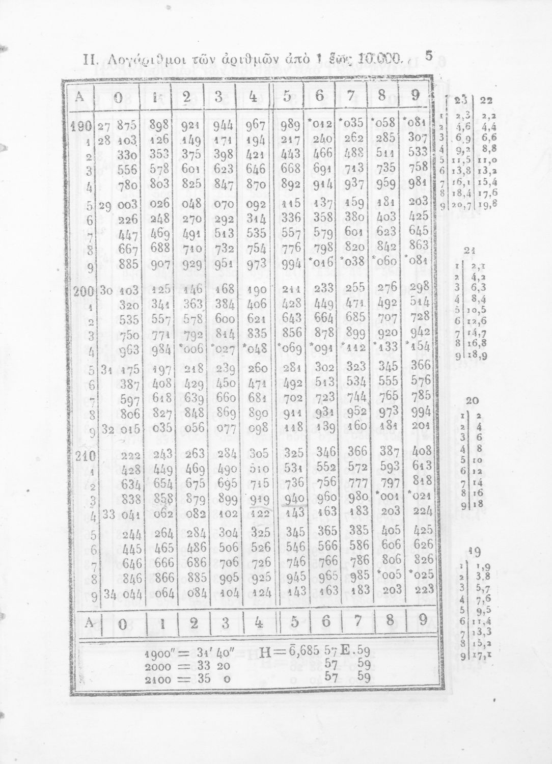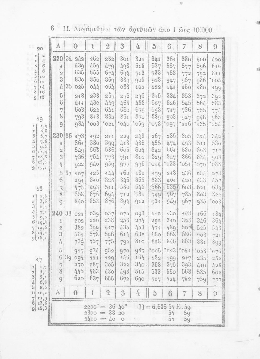 Μαθητικό βοήθημα το οποίο περιλαμβάνει λογαριθμικούς πίνακες των αριθμών από το 1 έως το 1000 και τους λογάριθμους των τεσσάρων κυριοτέρων τριγωνομετρικών αριθμών και τόξων.
