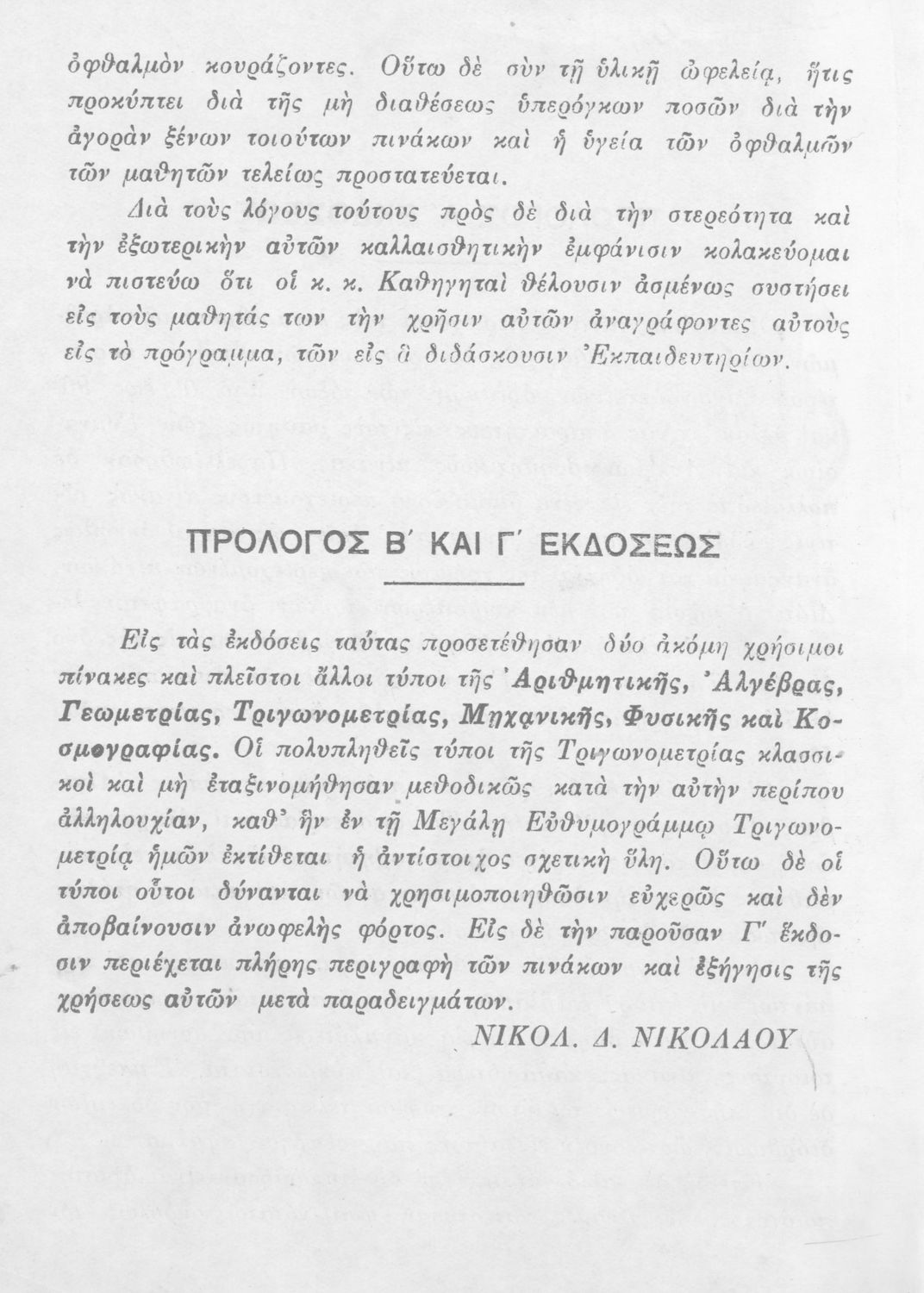 Βαθμίδα εκπαίδευσης: Δευτεροβάθμια Τάξη: Γυμνάσιο / Λύκειο Μάθημα: Μαθηματικά Γλώσσα: Καθαρεύουσα Παρουσίαση περιεχομένου: Μαθητικό βοήθημα το οποίο περιλαμβάνει λογαριθμικούς πίνακες των αριθμών από το 1 έως το 1000 και τους λογάριθμους των τεσσάρων κυριοτέρων τριγωνομετρικών αριθμών και τόξων. |