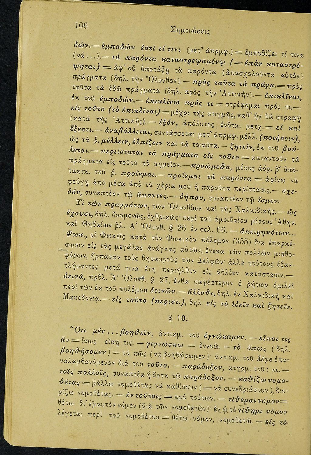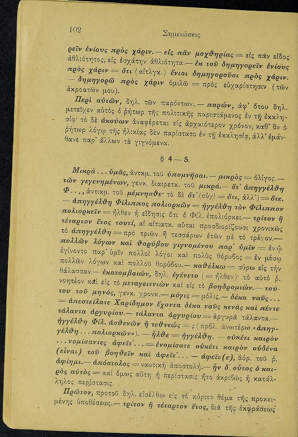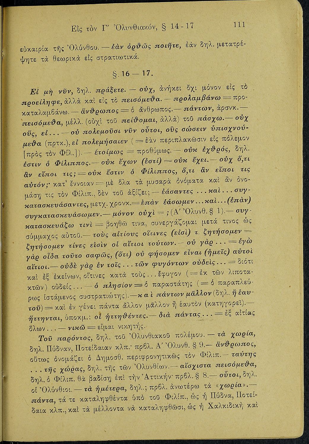 Σχολικό εγχειρίδιο Αρχαίων Ελληνικών Δ΄ Γυμνασίου που περιέχει τους Ολυνθιακούς Α΄ και Β΄ και τους Φιλιππικούς Α΄ και Β' του Δημοσθένη, ερμηνευτικά και πραγματολογικά σχόλια και γραμματικές παρατηρήσεις.