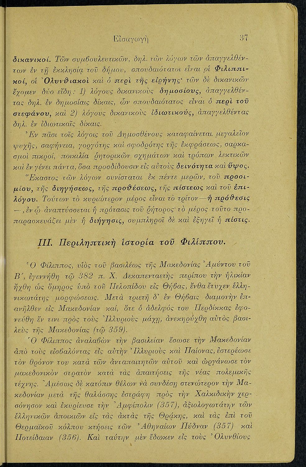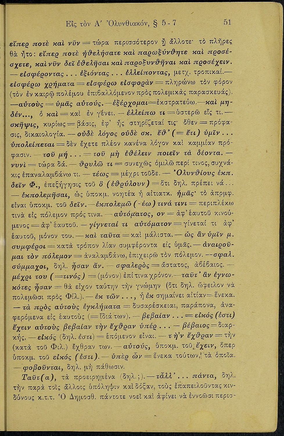 Σχολικό εγχειρίδιο Αρχαίων Ελληνικών Ε΄ Γυμνασίου που περιέχει τους Ολυνθιακούς Α΄ και Β΄ και τους Φιλιππικούς Α΄ και Β΄ του Δημοσθένη, βιογραφικό σημείωμα, λεξιλόγιο και ερμηνευτικά και ετυμολογικά σχόλια.