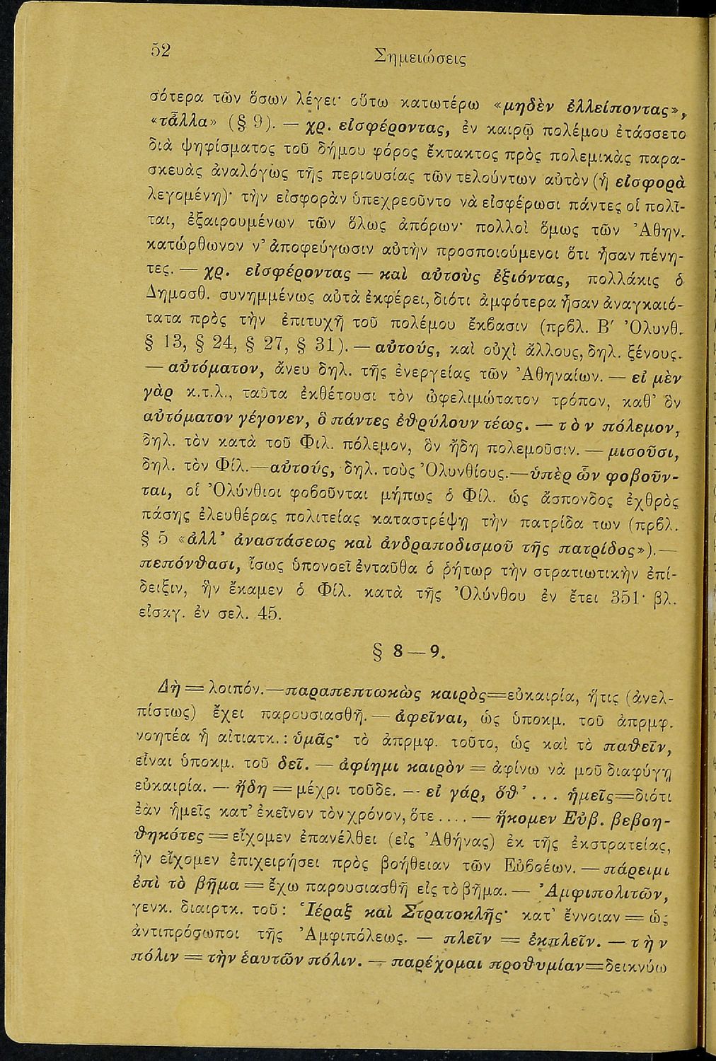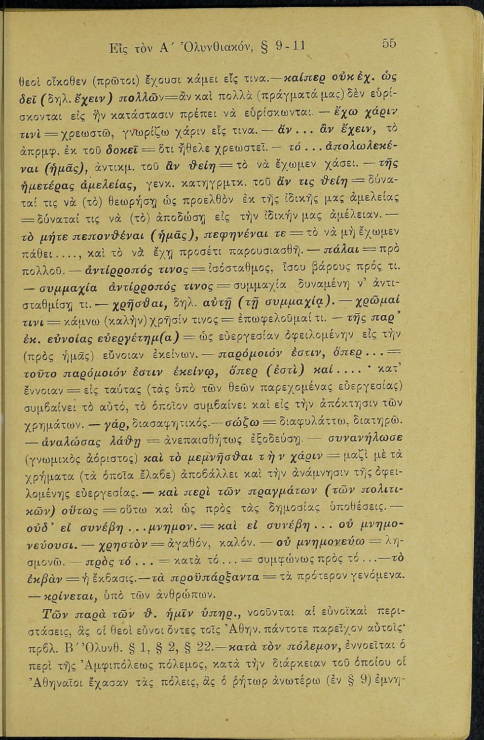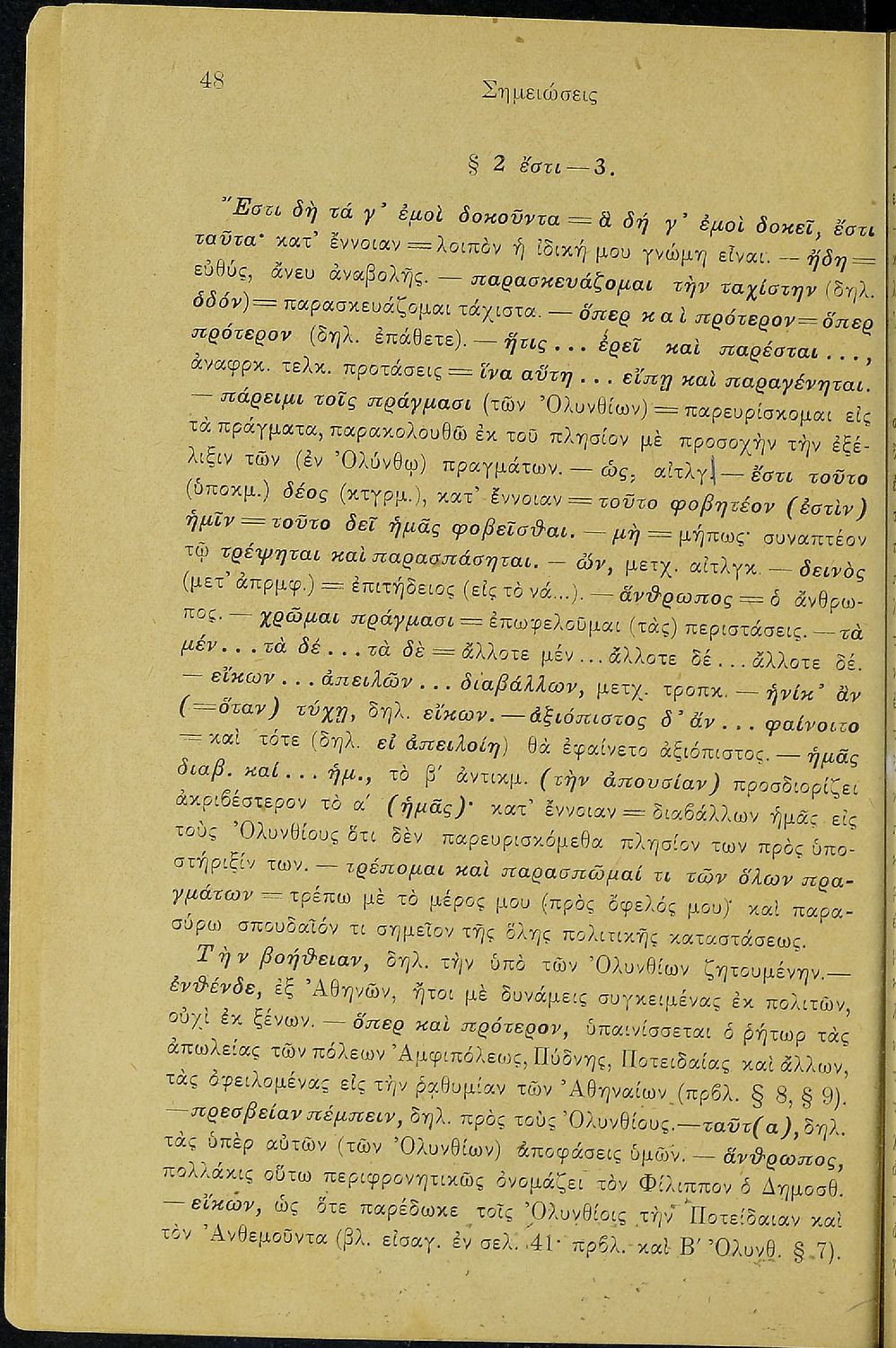 Σχολικό εγχειρίδιο Αρχαίων Ελληνικών Β΄ Γυμνασίου που περιλαμβάνει τους τρεις Ολυνθιακούς Λόγους του Δημοσθένη, ερμηνευτικά και πραγματολογικά σχόλια, λεξιλόγιο, γραμματικές παρατηρήσεις, εισαγωγικά σχόλια για