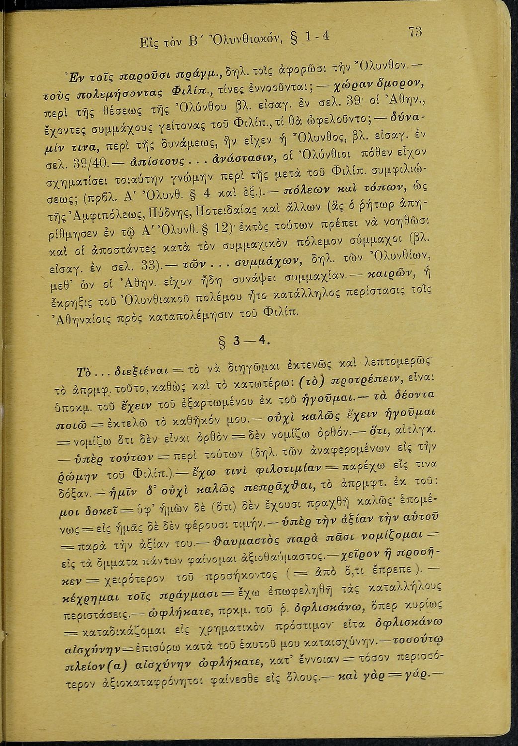 Σχολικό εγχειρίδιο Αρχαίων Ελληνικών Δ΄ Γυμνασίου που περιέχει τους Ολυνθιακούς Α΄ και Β΄ και τους Φιλιππικούς Α΄ και Β' του Δημοσθένη, ερμηνευτικά και πραγματολογικά σχόλια και γραμματικές παρατηρήσεις.