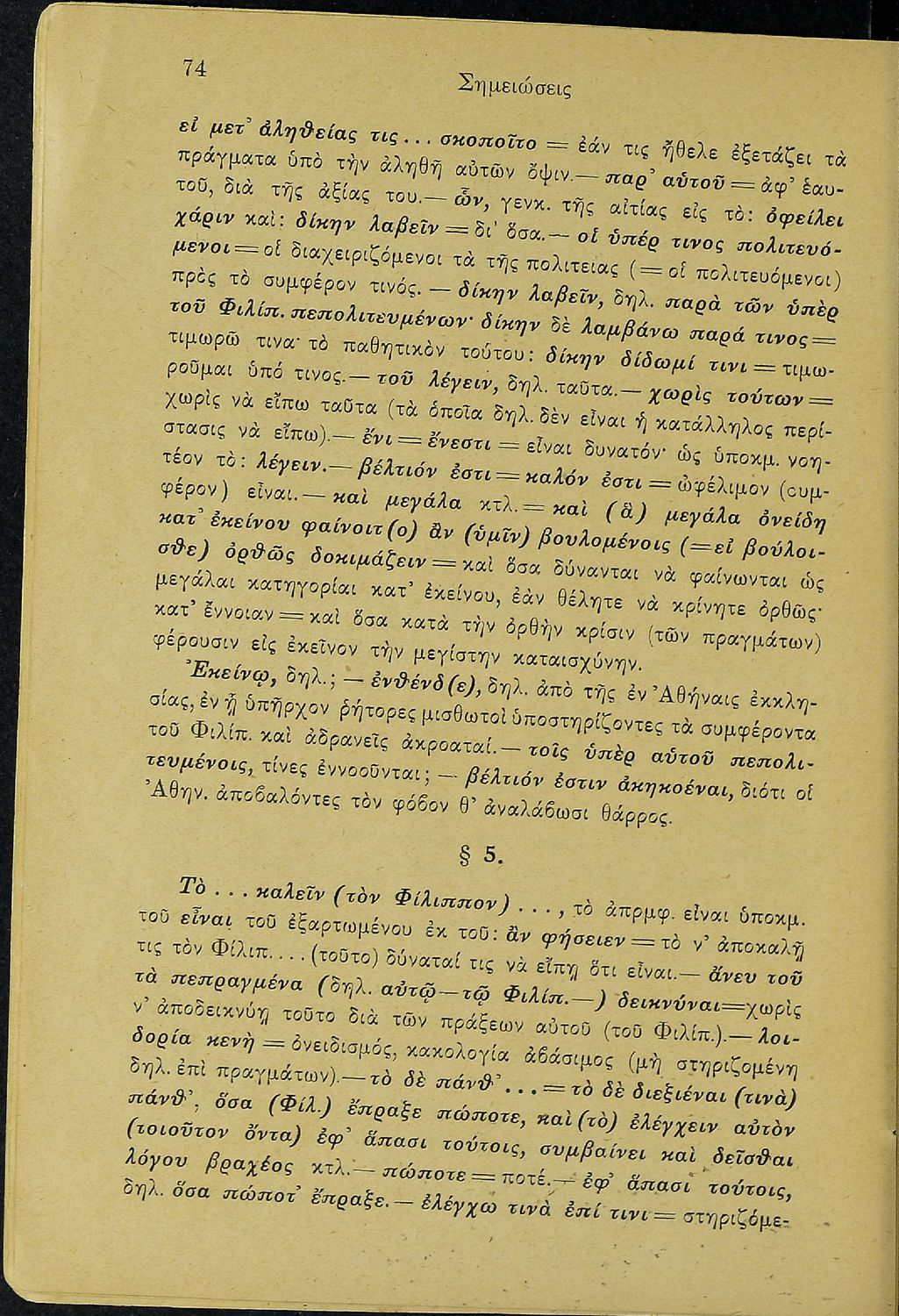 Σχολικό εγχειρίδιο Αρχαίων Ελληνικών Ε΄ Γυμνασίου που περιέχει τους Ολυνθιακούς Α΄ και Β΄ και τους Φιλιππικούς Α΄ και Β΄ του Δημοσθένη, βιογραφικό σημείωμα, λεξιλόγιο και ερμηνευτικά και ετυμολογικά σχόλια.