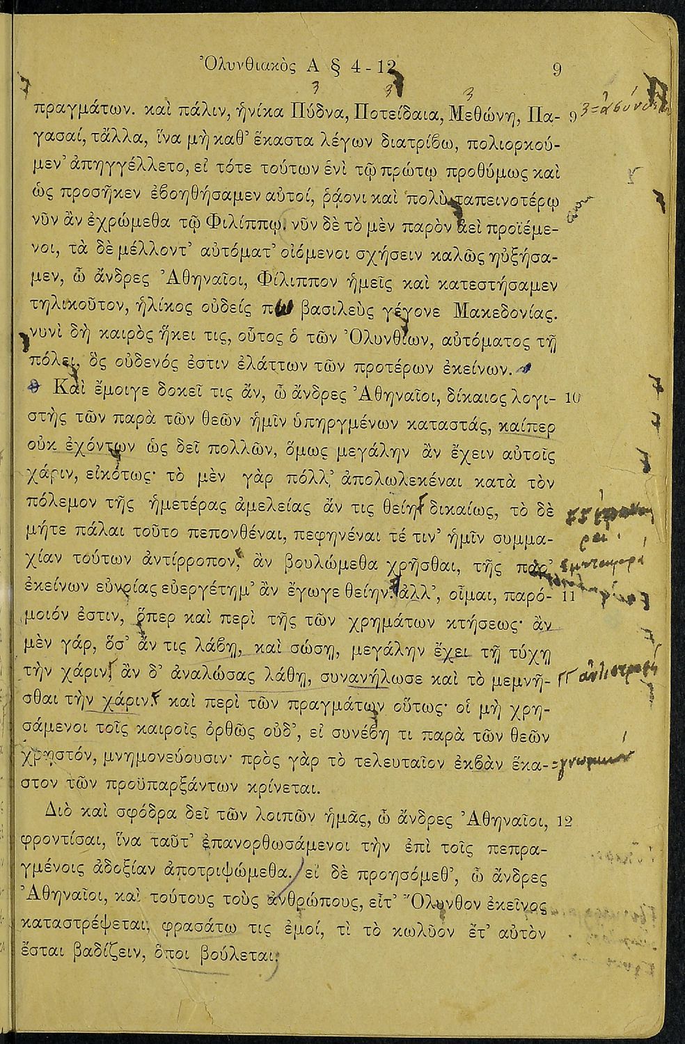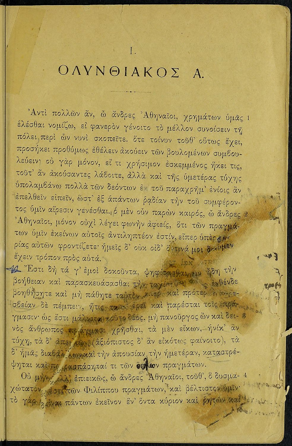 Σχολικό εγχειρίδιο Αρχαίων Ελληνικών Β΄ Γυμνασίου που περιλαμβάνει τους τρεις Ολυνθιακούς Λόγους του Δημοσθένη, εισαγωγικά σχόλια στη ζωή και το έργο του, την υπόθεση των Λόγων, και ερμηνευτικά, πραγματολογικά