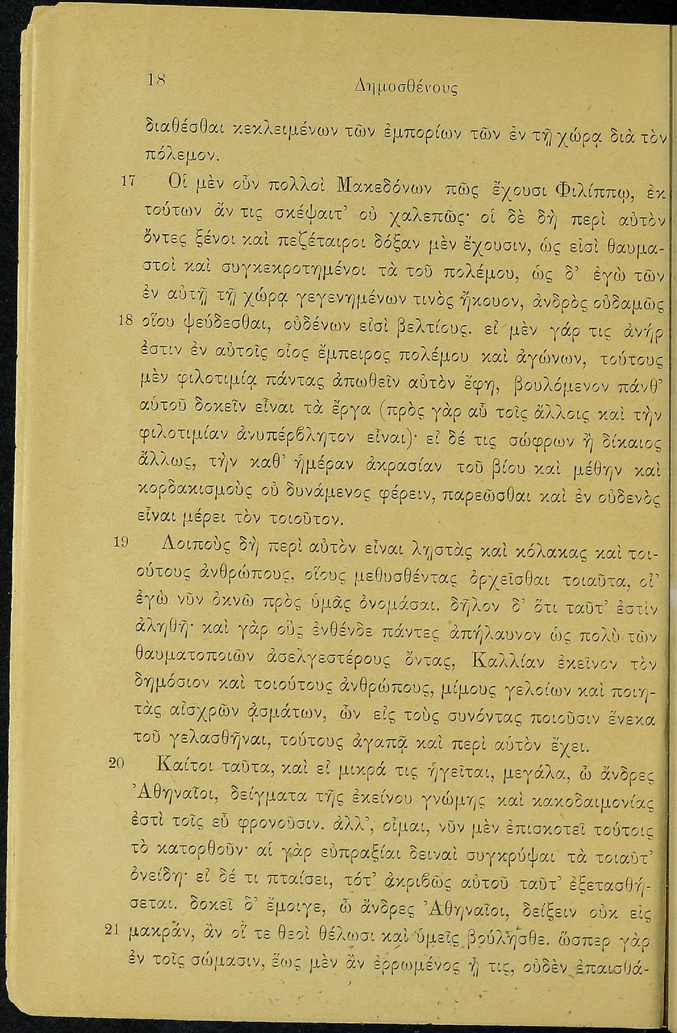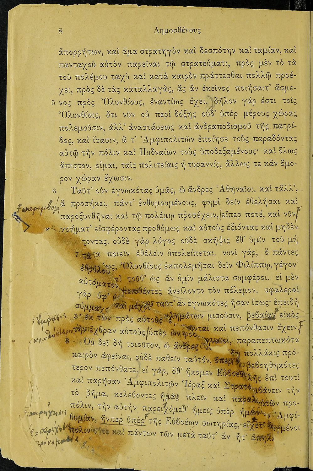 Σχολικό εγχειρίδιο Αρχαίων Ελληνικών Ε΄ Γυμνασίου που περιέχει τους Ολυνθιακούς Α΄ και Β΄ και τους Φιλιππικούς Α΄ και Β΄ του Δημοσθένη, βιογραφικό σημείωμα, λεξιλόγιο και ερμηνευτικά και ετυμολογικά σχόλια.