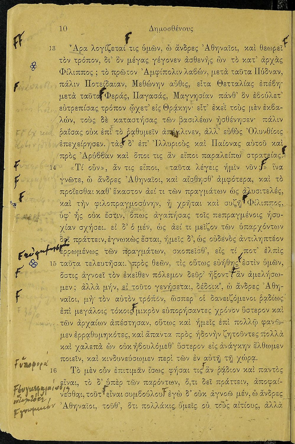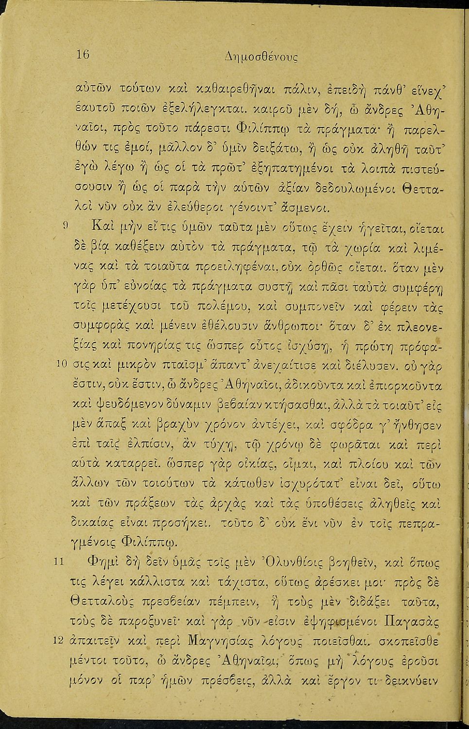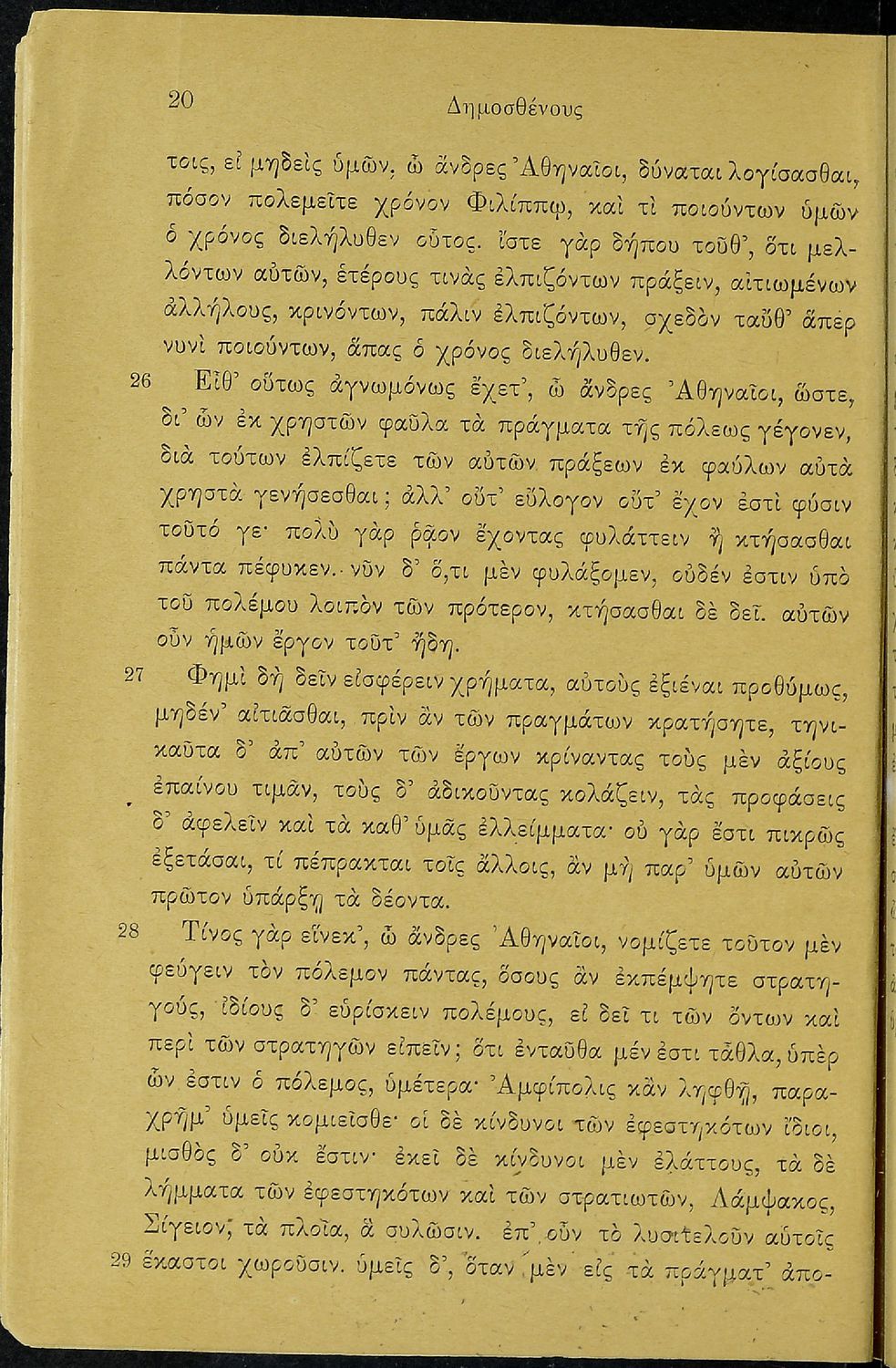 Σχολικό εγχειρίδιο Αρχαίων Ελληνικών Δ΄ Γυμνασίου που περιέχει τους Ολυνθιακούς Α΄ και Β΄ και τους Φιλιππικούς Α΄ και Β' του Δημοσθένη, ερμηνευτικά και πραγματολογικά σχόλια και γραμματικές παρατηρήσεις.