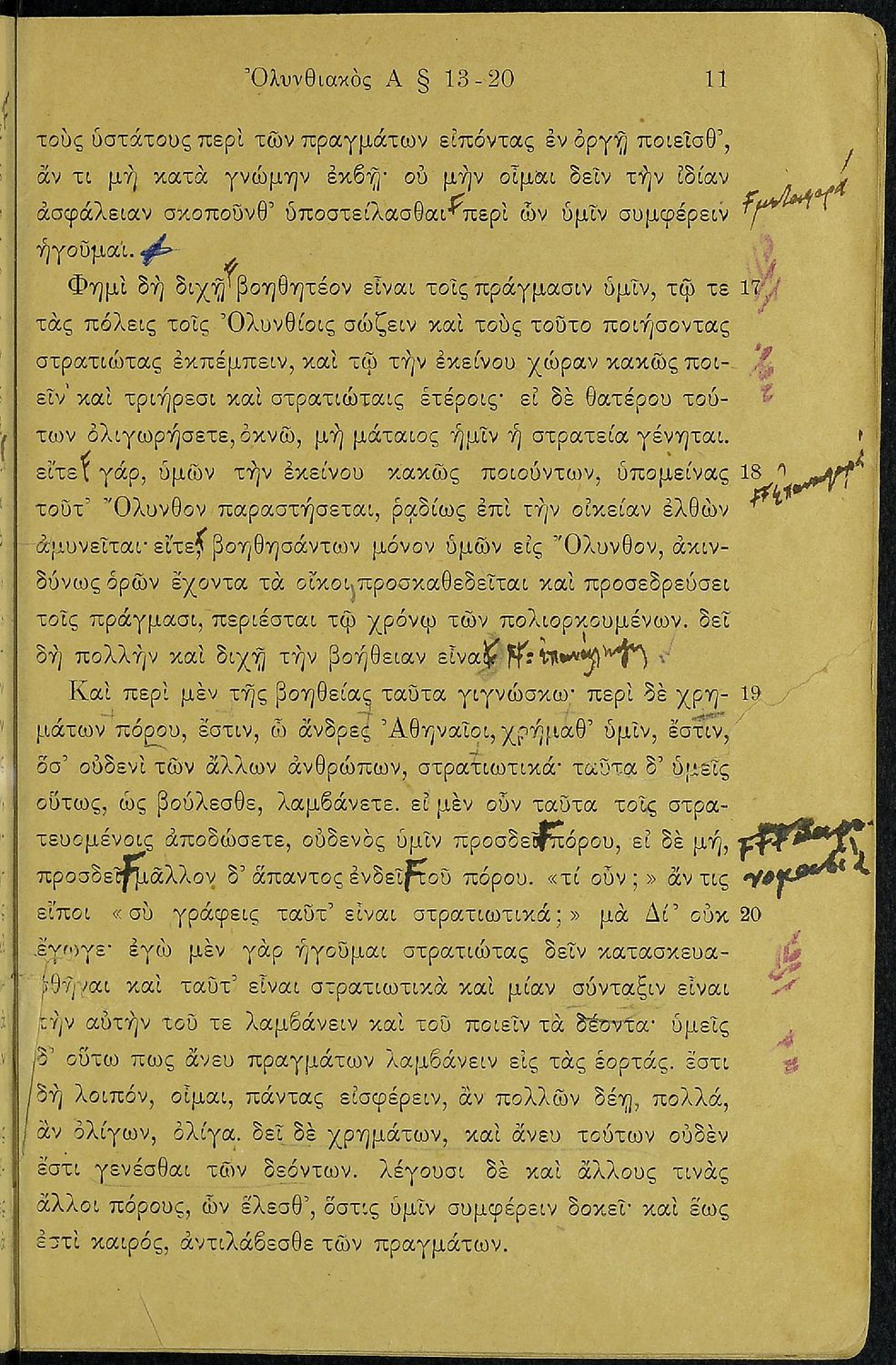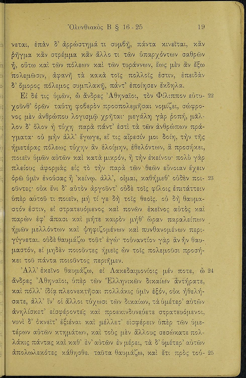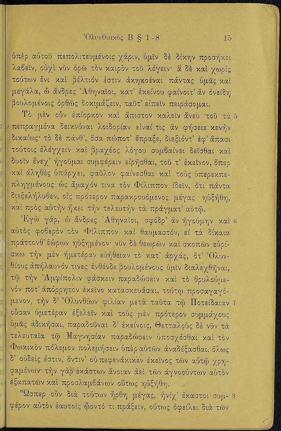Σχολικό εγχειρίδιο Αρχαίων Ελληνικών Β΄ Γυμνασίου που περιλαμβάνει τους τρεις Ολυνθιακούς Λόγους του Δημοσθένη, εισαγωγικά σχόλια στη ζωή και το έργο του, την υπόθεση των Λόγων, και ερμηνευτικά, πραγματολογικά και λεξιλογικά σχόλια.