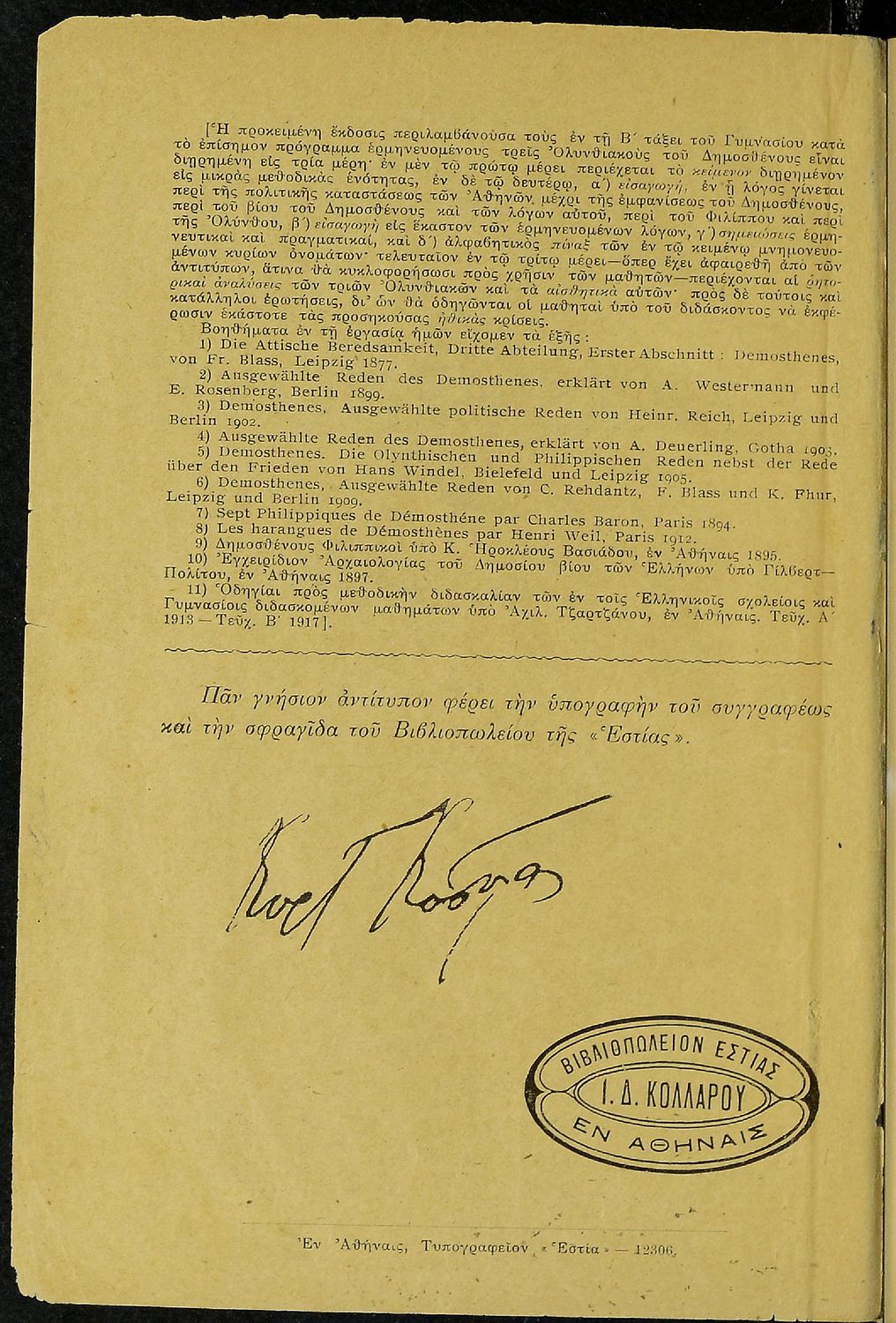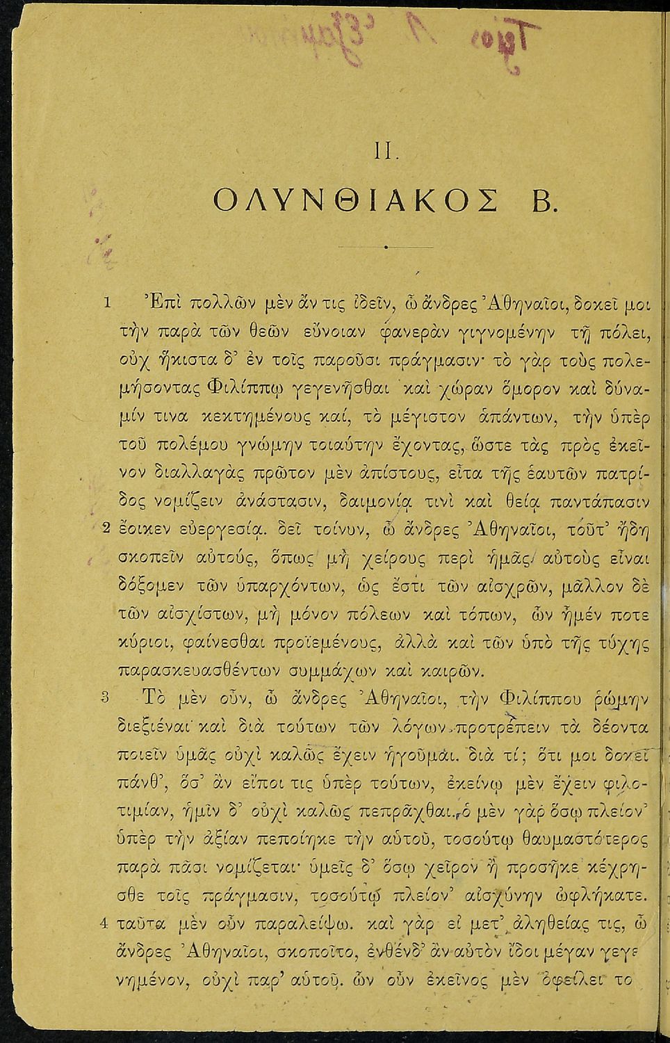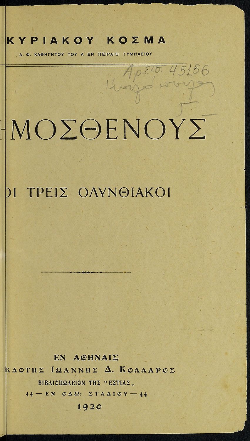 Τίτλος: Δημοσθένους οι τρεις Ολυνθιακοί διά την Β΄ τάξιν των Γυμνασίων