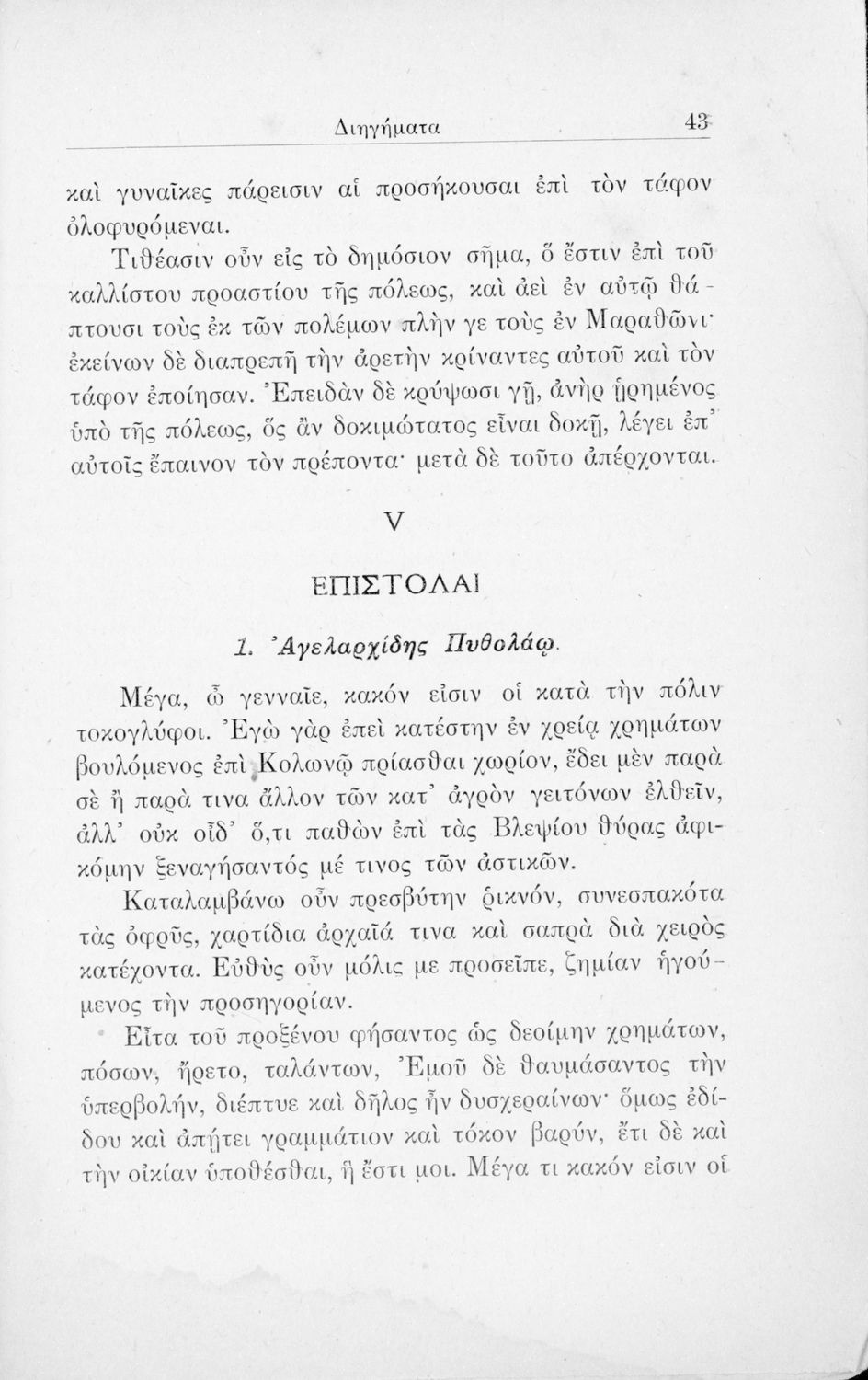 Σχολικό εγχειρίδιο Αρχαίων Ελληνικών για τις Ε΄ Δημοτικού και Α' Ελληνικού Σχολείου που περιλαμβάνει σύντομα διηγήματα εμπνευσμένα από τους μύθους του Αισώπου, περιγραφές ελληνικών πόλεων, επιστολές και ...