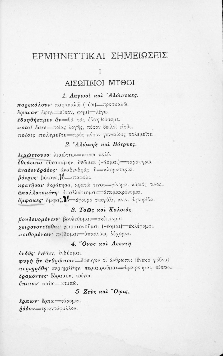 Σχολικό εγχειρίδιο Αρχαίων Ελληνικών Α' Ελληνικού Σχολείου που περιλαμβάνει κείμενα για τη διδασκαλία της γραμματικής της αρχαίας ελληνικής, αποσπάσματα από τους μύθους του Αισώπου και την ελληνική μυθολογία ...