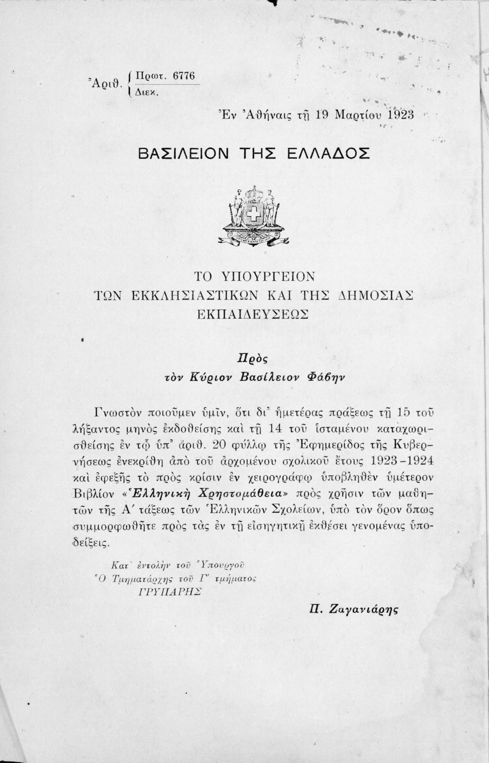 Υπουργική απόφαση / Σύμβαση: 6776/19-3-1923