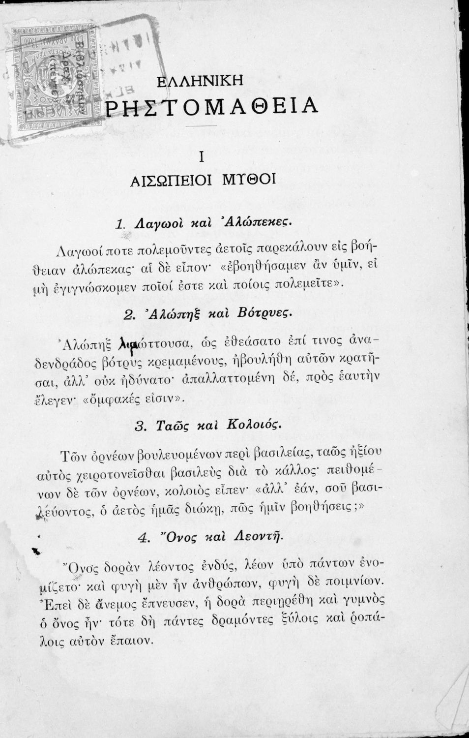 Σχολικό εγχειρίδιο Αρχαίων Ελληνικών Α' Ελληνικού Σχολείου που περιλαμβάνει κείμενα για τη διδασκαλία της γραμματικής της αρχαίας ελληνικής, αποσπάσματα από τους μύθους του Αισώπου και την ελληνική μυθολογία ...