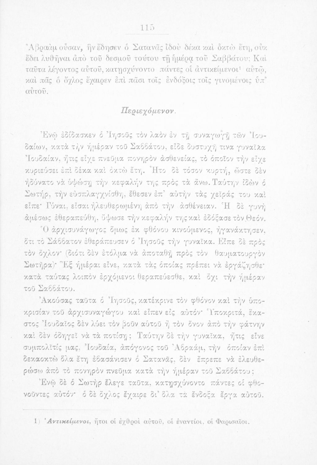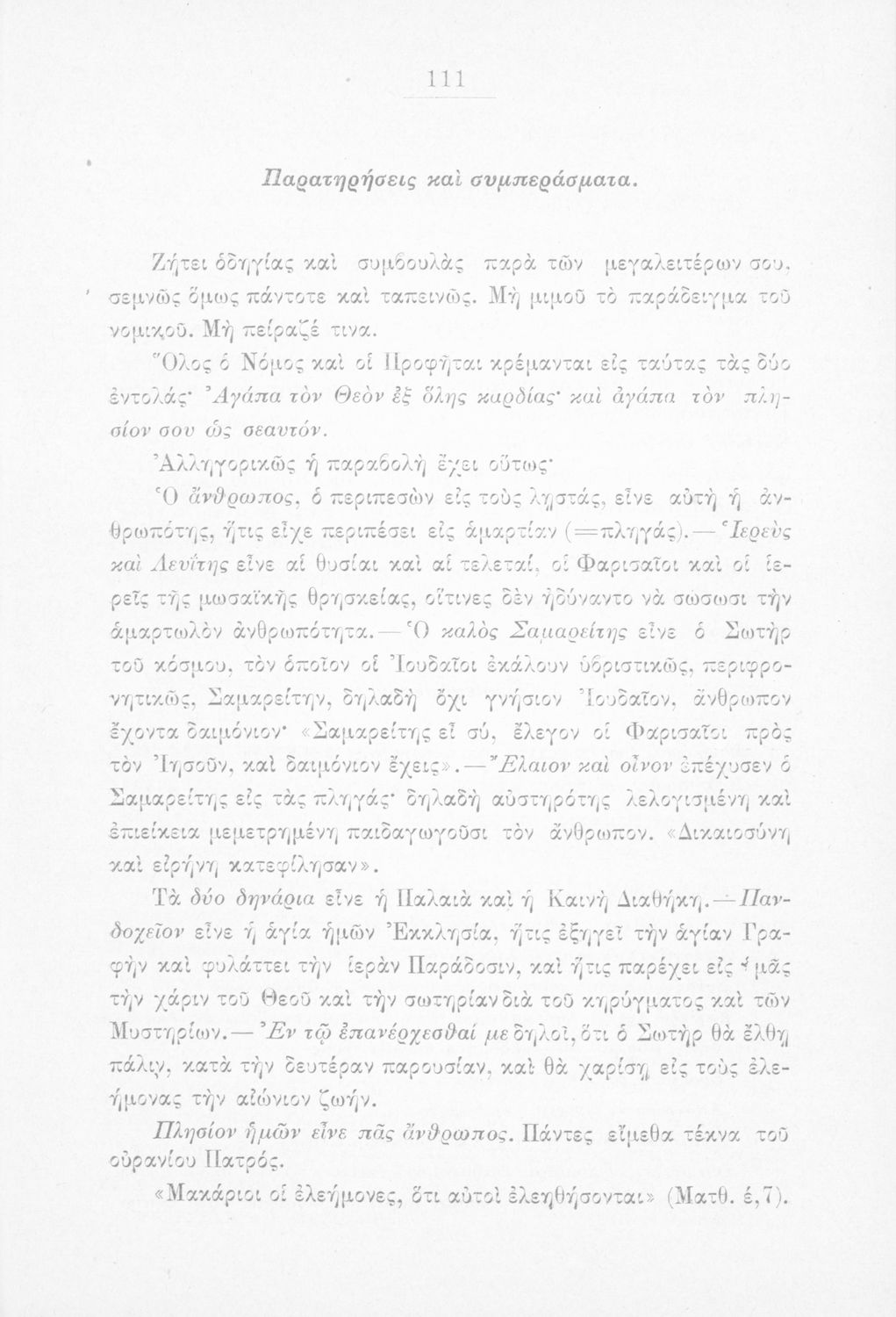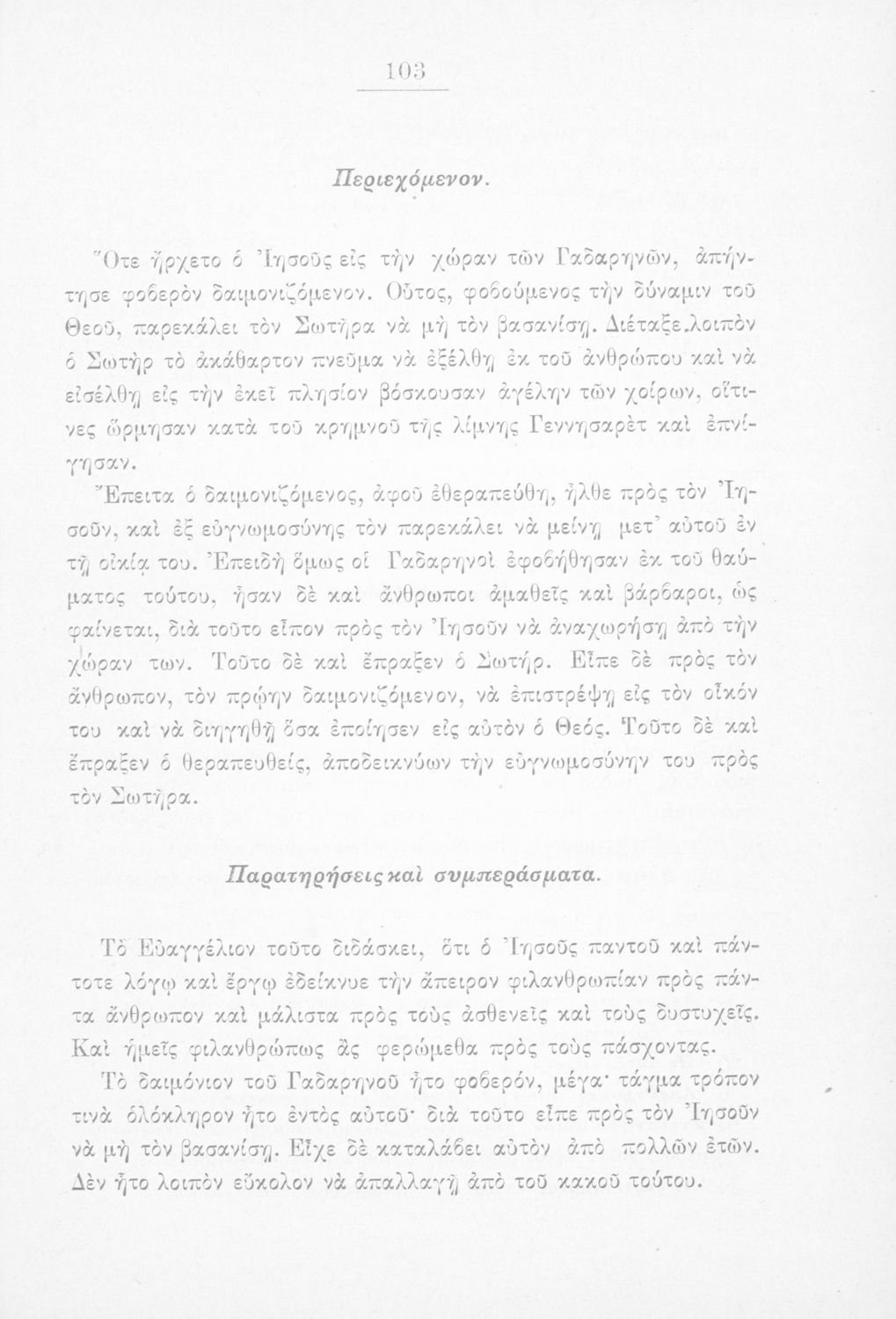 Παρουσίαση περιεχομένου: Σχολικό εγχειρίδιο Θρησκευτικών για τα Γυμνάσια, Ελληνικά Σχολεία και τα Παρθεναγωγεία που περιλαμβάνει εισαγωγικά σχόλια στα βιβλία της Παλαιάς και Καινής Διαθήκης, βιογραφικά σημειώματα των ευαγγελιστών περικοπές, και ερμηνευτικές και πραγματολογικές σημειώσεις. Ο συγγραφέας υπήρξε καθηγητής του Πανεπιστημίου. Το βιβλίο έχει την έγκριση της Ιερά Συνόδου με αρ.πρ.1632/7-12-1889.