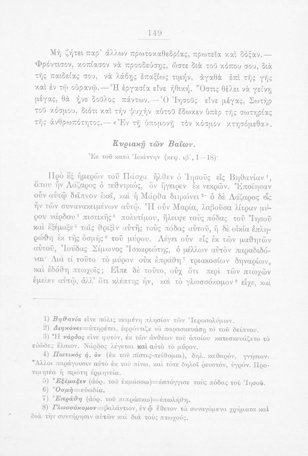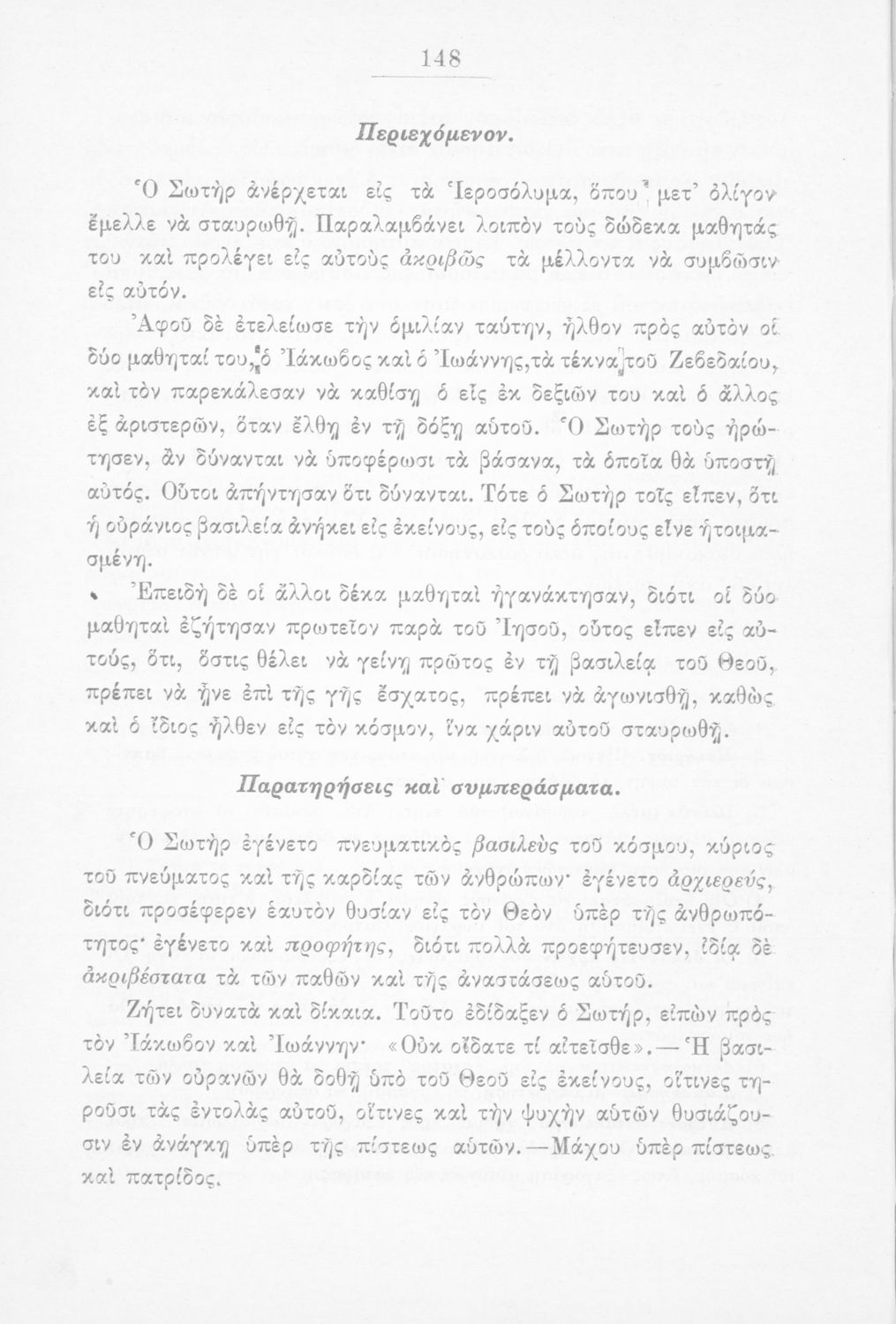 Παρουσίαση περιεχομένου: Σχολικό εγχειρίδιο Θρησκευτικών για τα Γυμνάσια, Ελληνικά Σχολεία και τα Παρθεναγωγεία που περιλαμβάνει εισαγωγικά σχόλια στα βιβλία της Παλαιάς και Καινής Διαθήκης, βιογραφικά σημειώματα των ευαγγελιστών περικοπές, και ερμηνευτικές και πραγματολογικές σημειώσεις. Ο συγγραφέας υπήρξε καθηγητής του Πανεπιστημίου. Το βιβλίο έχει την έγκριση της Ιερά Συνόδου με αρ.πρ.1632/7-12-1889.
