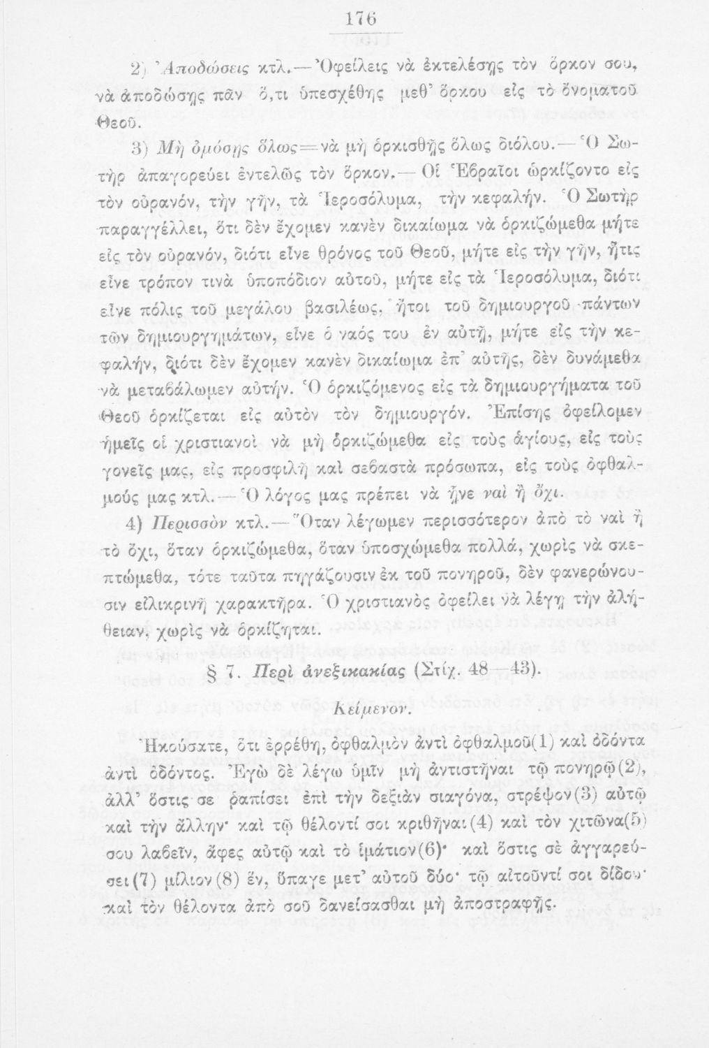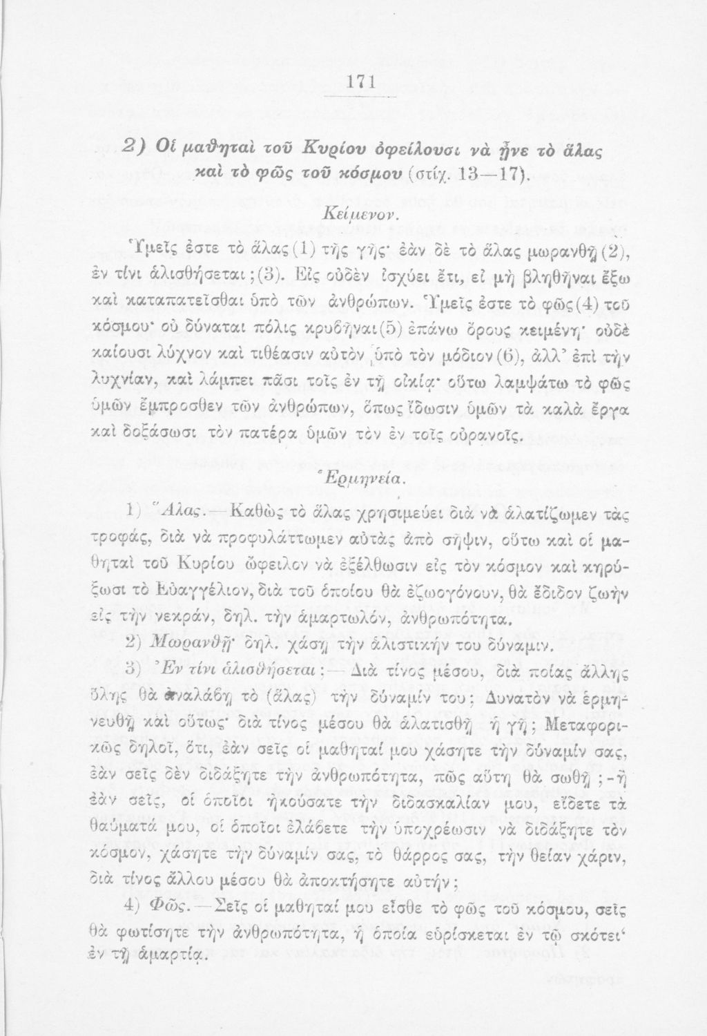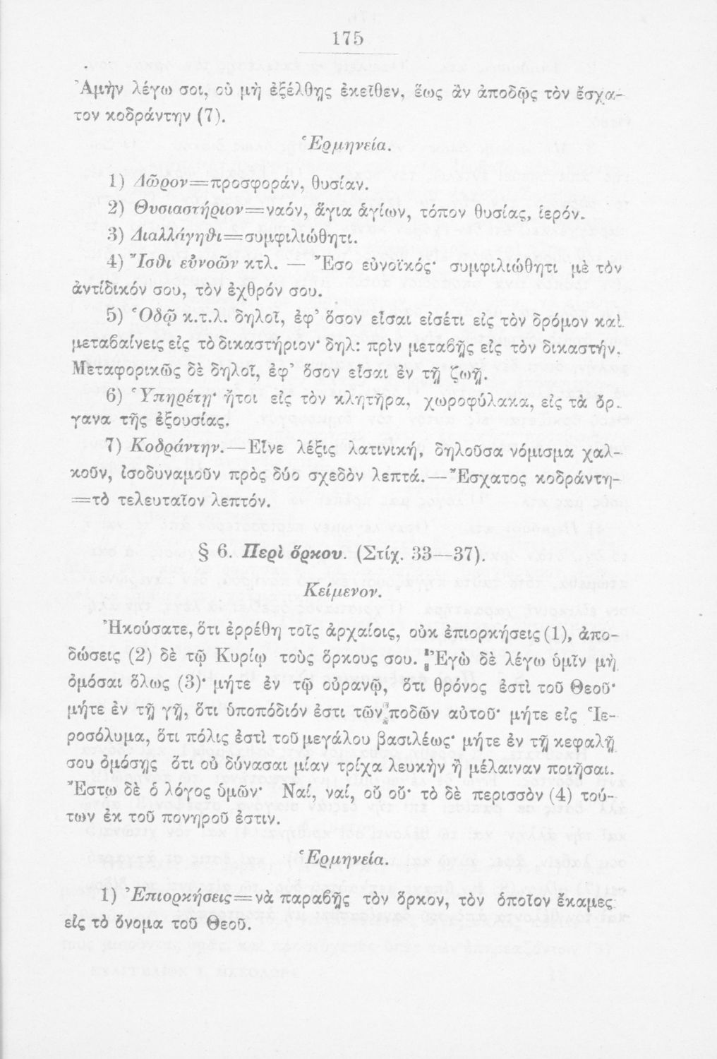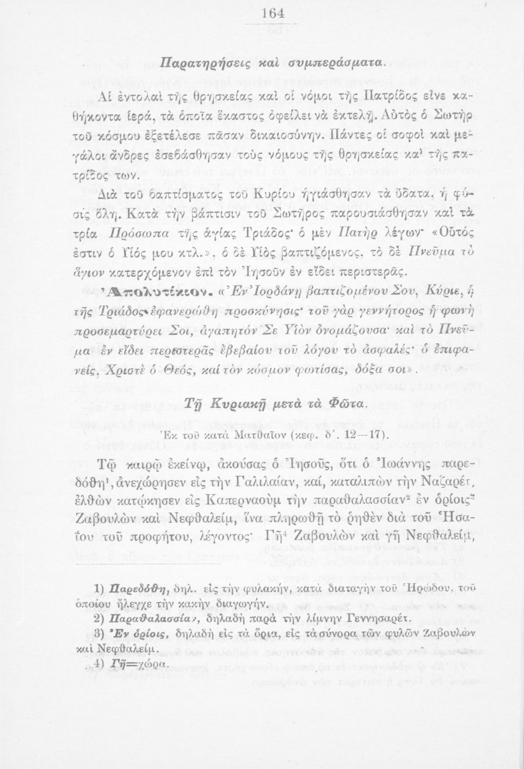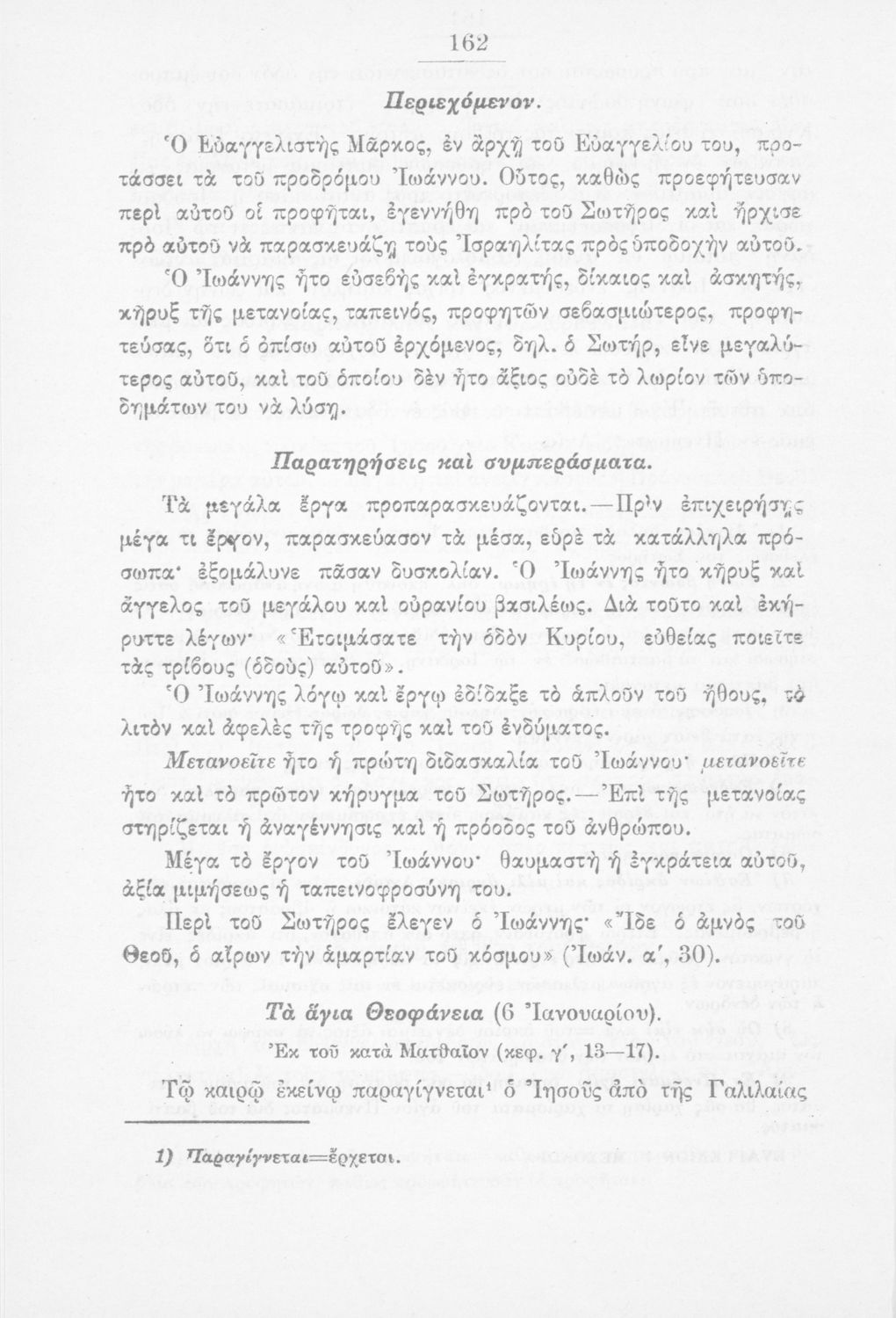 Παρουσίαση περιεχομένου: Σχολικό εγχειρίδιο Θρησκευτικών για τα Γυμνάσια, Ελληνικά Σχολεία και τα Παρθεναγωγεία που περιλαμβάνει εισαγωγικά σχόλια στα βιβλία της Παλαιάς και Καινής Διαθήκης, βιογραφικά σημειώματα των ευαγγελιστών περικοπές, και ερμηνευτικές και πραγματολογικές σημειώσεις. Ο συγγραφέας υπήρξε καθηγητής του Πανεπιστημίου. Το βιβλίο έχει την έγκριση της Ιερά Συνόδου με αρ.πρ.1632/7-12-1889.
