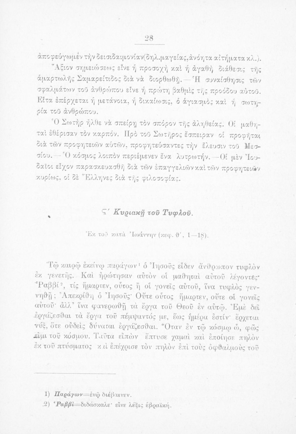 Βαθμίδα εκπαίδευσης: Δευτεροβάθμια Τάξη: Γυμνάσιο / Ελληνικό Σχολείο / Παρθεναγωγείο Μάθημα: Θρησκευτικά Γλώσσα: Καθαρεύουσα Παρουσίαση περιεχομένου: Σχολικό εγχειρίδιο Θρησκευτικών για τα Γυμνάσια, Ελληνικά Σχολεία και τα Παρθεναγωγεία που περιλαμβάνει εισαγωγικά σχόλια στα βιβλία της Παλαιάς και Καινής Διαθήκης, βιογραφικά σημειώματα των ευαγγελιστών περικοπές, και ερμηνευτικές και πραγματολογικές σημειώσεις. Ο συγγραφέας υπήρξε καθηγητής του Πανεπιστημίου. Το βιβλίο έχει την έγκριση της Ιερά Συνόδου με αρ.πρ.1632/7-12-1889. |