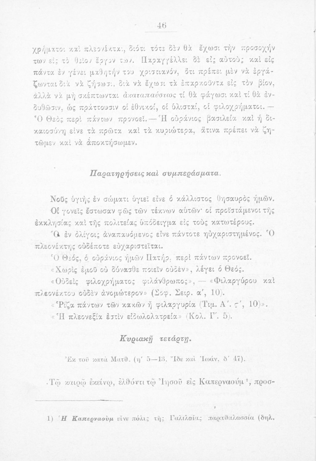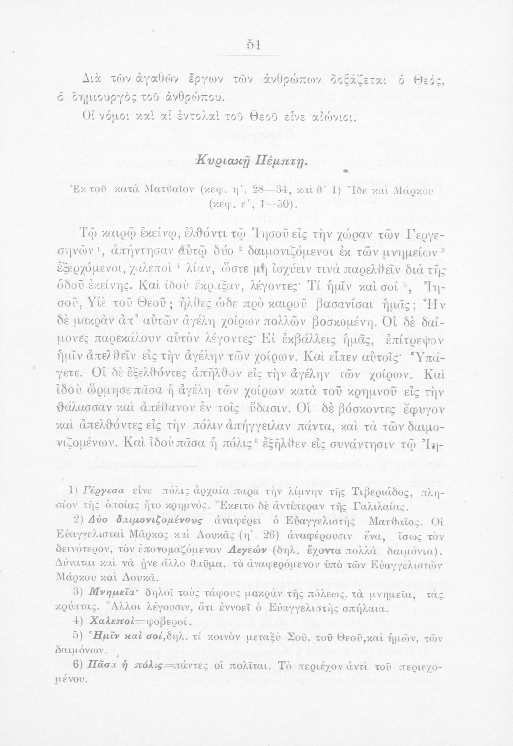 Παρουσίαση περιεχομένου: Σχολικό εγχειρίδιο Θρησκευτικών για τα Γυμνάσια, Ελληνικά Σχολεία και τα Παρθεναγωγεία που περιλαμβάνει εισαγωγικά σχόλια στα βιβλία της Παλαιάς και Καινής Διαθήκης, βιογραφικά σημειώματα των ευαγγελιστών περικοπές, και ερμηνευτικές και πραγματολογικές σημειώσεις. Ο συγγραφέας υπήρξε καθηγητής του Πανεπιστημίου. Το βιβλίο έχει την έγκριση της Ιερά Συνόδου με αρ.πρ.1632/7-12-1889.