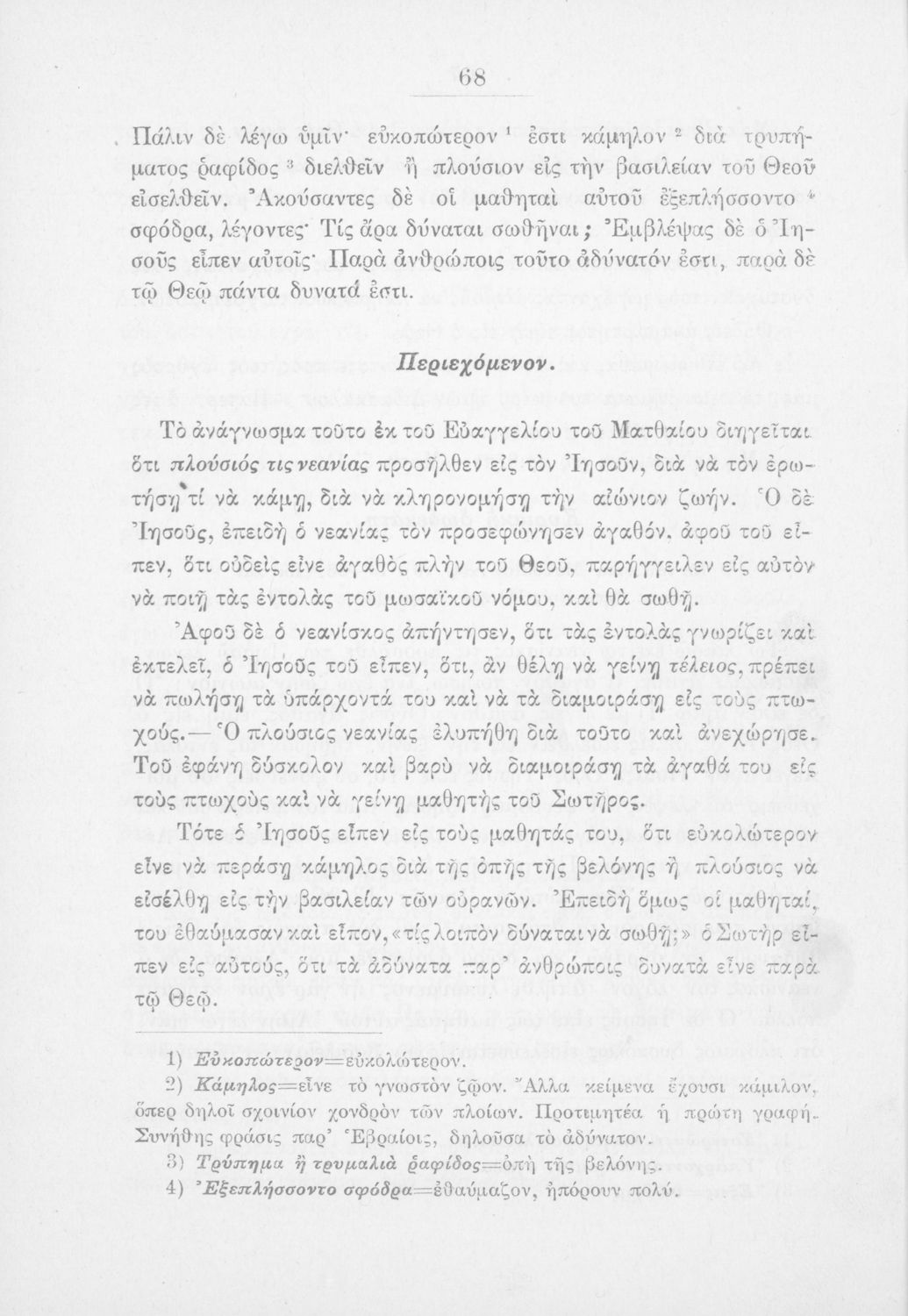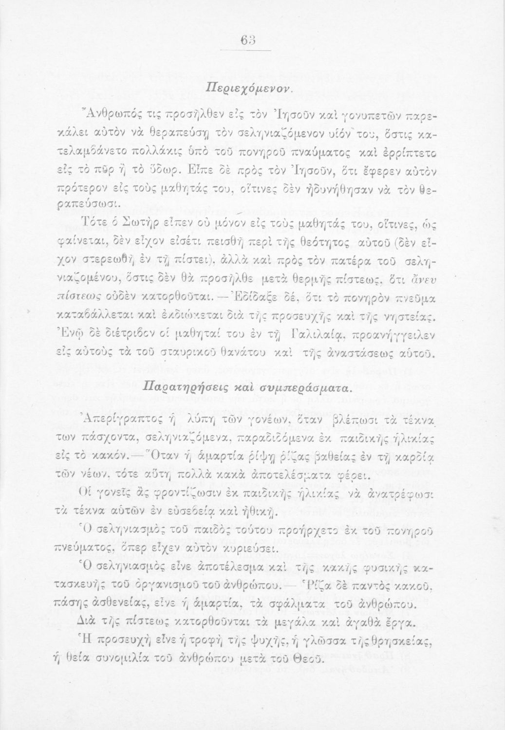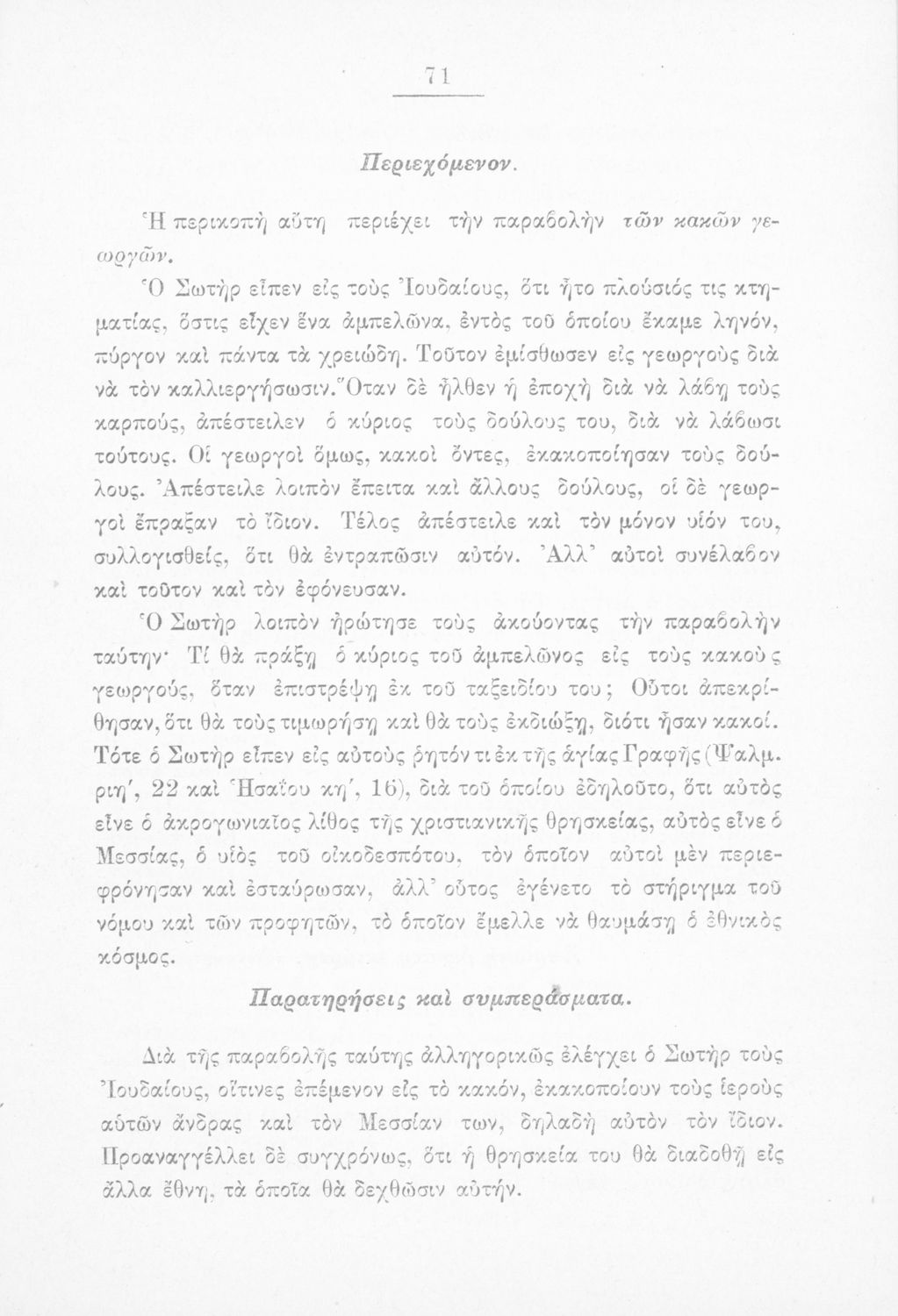 Παρουσίαση περιεχομένου: Σχολικό εγχειρίδιο Θρησκευτικών για τα Γυμνάσια, Ελληνικά Σχολεία και τα Παρθεναγωγεία που περιλαμβάνει εισαγωγικά σχόλια στα βιβλία της Παλαιάς και Καινής Διαθήκης, βιογραφικά σημειώματα των ευαγγελιστών περικοπές, και ερμηνευτικές και πραγματολογικές σημειώσεις. Ο συγγραφέας υπήρξε καθηγητής του Πανεπιστημίου. Το βιβλίο έχει την έγκριση της Ιερά Συνόδου με αρ.πρ.1632/7-12-1889.