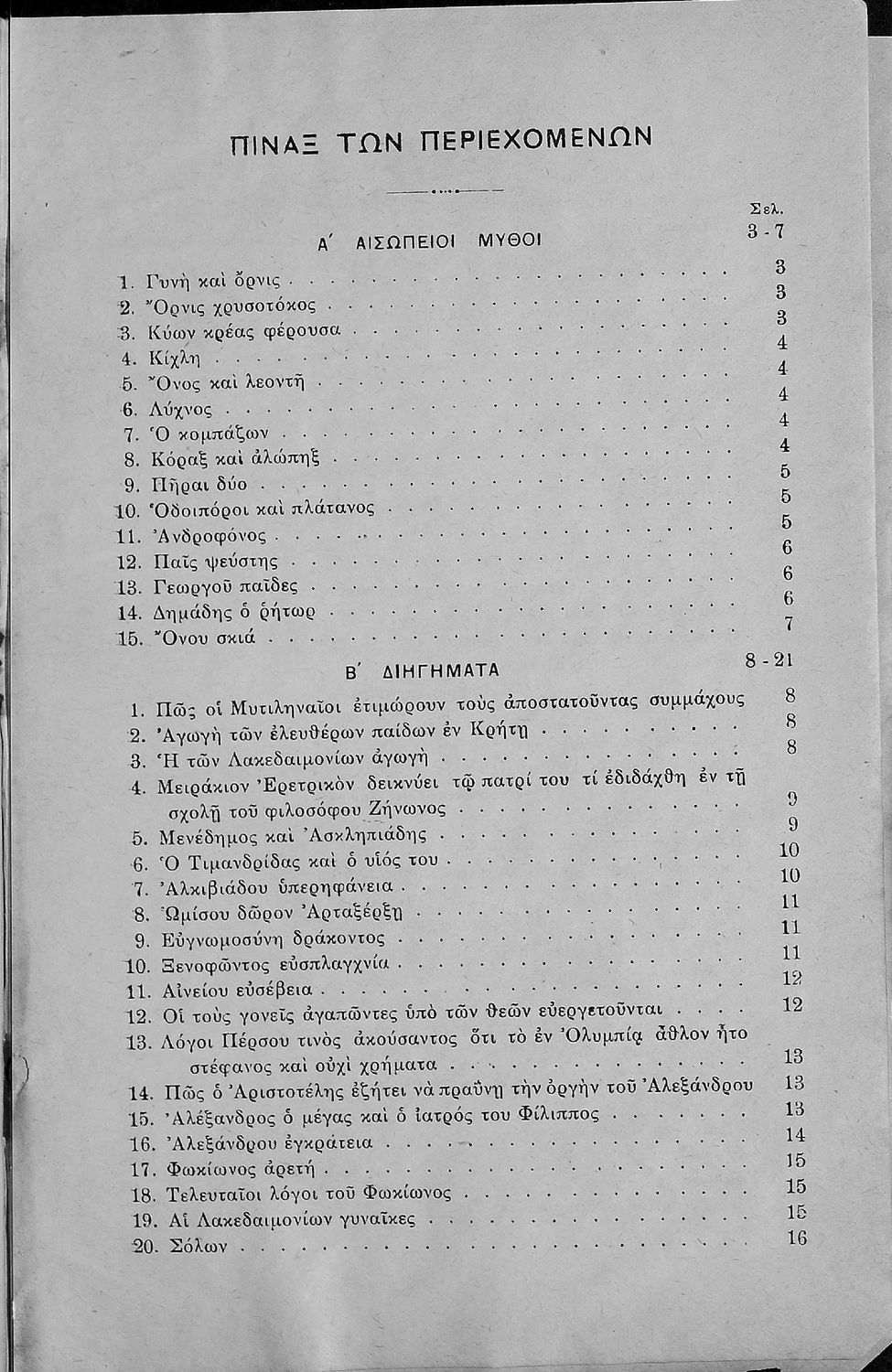 Σχολικό εγχειρίδιο Αρχαίων Ελληνικών Α΄ Γυμνασίου που περιλαμβάνει διηγήματα εμπνευσμένα από τους μύθους του Αισώπου, την αρχαία Ελλάδα, τις ελληνικές πόλεις και την ελληνική μυθολογία. Περιέχει λεξιλόγιο και πίνακα των κυριοτέρων ονομάτων..
