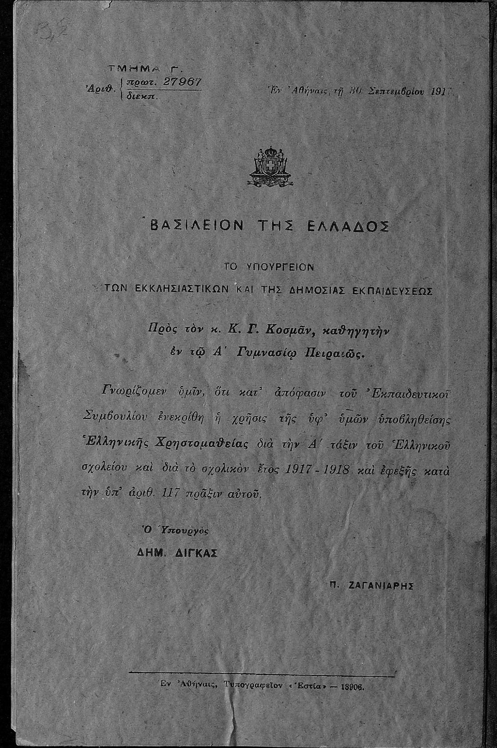 Εκδότης: Ιωάννης Δ. Κολλάρος, Βιβλιοπωλείο της "Εστίας" Έτος έκδοσης: 1923 Τόπος έκδοσης: Αθήνα Έκδοση: 14η Υπουργική απόφαση / Σύμβαση: 27967/1917. Έτος έγκρισης: 1917 |