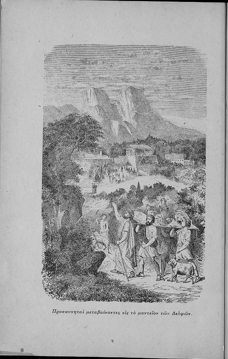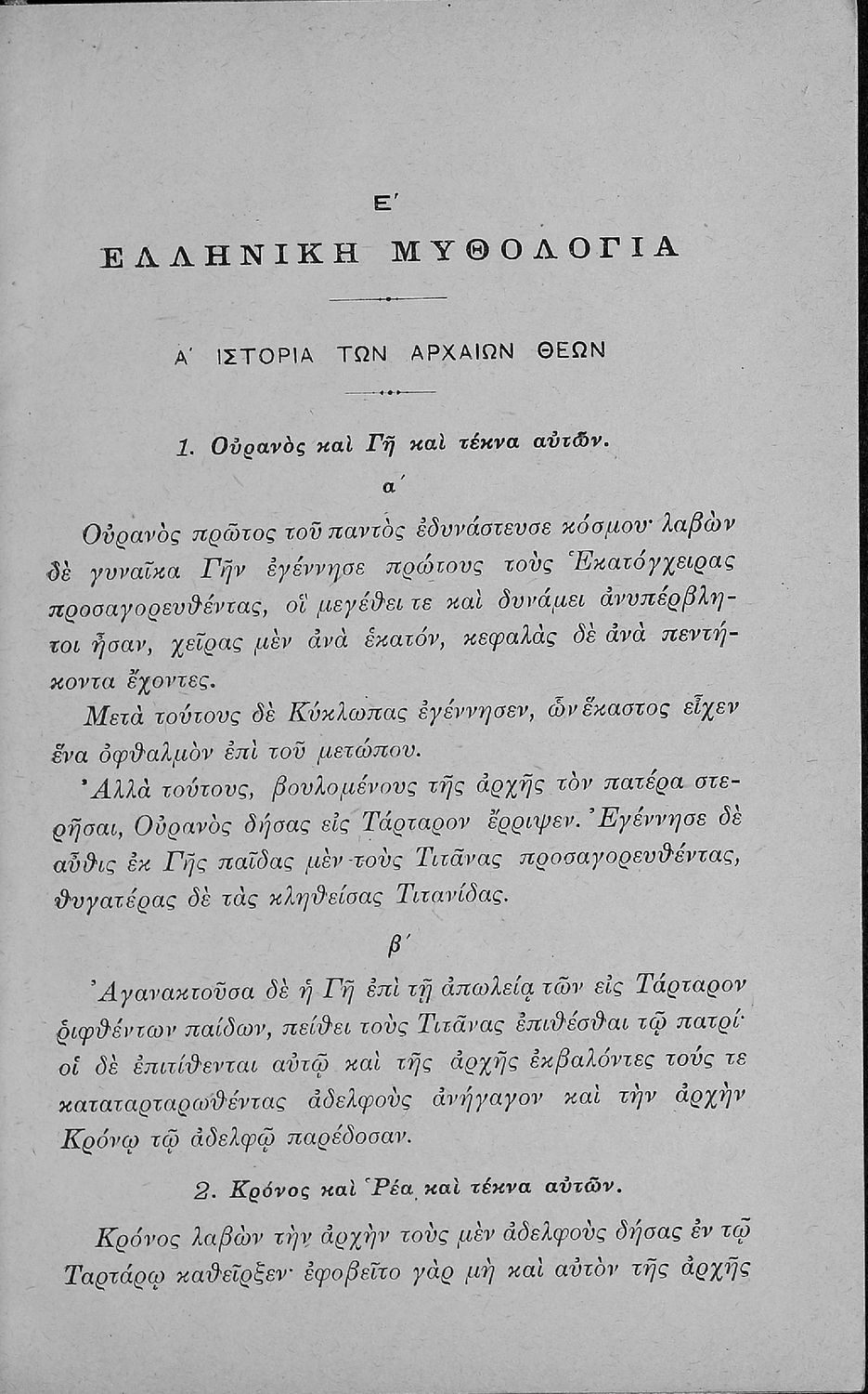 Σχολικό εγχειρίδιο Αρχαίων Ελληνικών για τις Α' Ελληνικού Σχολείου και Παρθεναγωγείου και την Ε΄ Δημοτικού που περιέχει κείμενα στην αρχαία ελληνική εμπνευσμένα από την ελληνική μυθολογία, και γραμματικές, ...