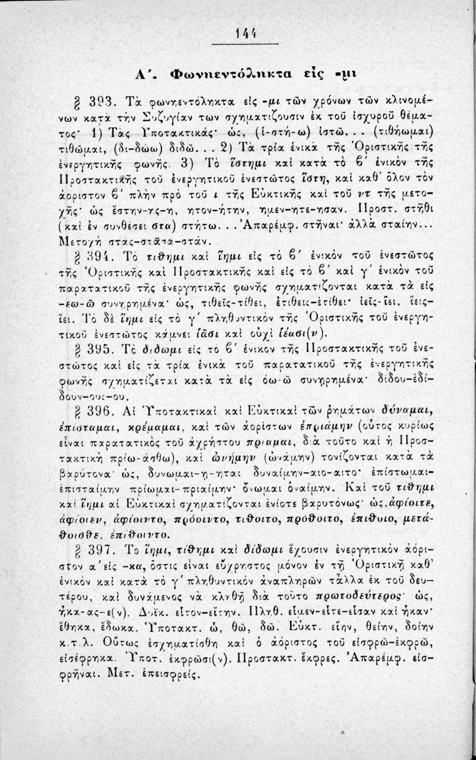 Σχολικό εγχειρίδιο Αρχαίων Ελληνικών για τα Ελληνικά Σχολεία και Παρθεναγωγεία που περιέχει τους κανόνες γραμματικής και είναι χωρισμένο σε φθογγολογικό, τυπολογικό και ετυμολογικό μέρος.