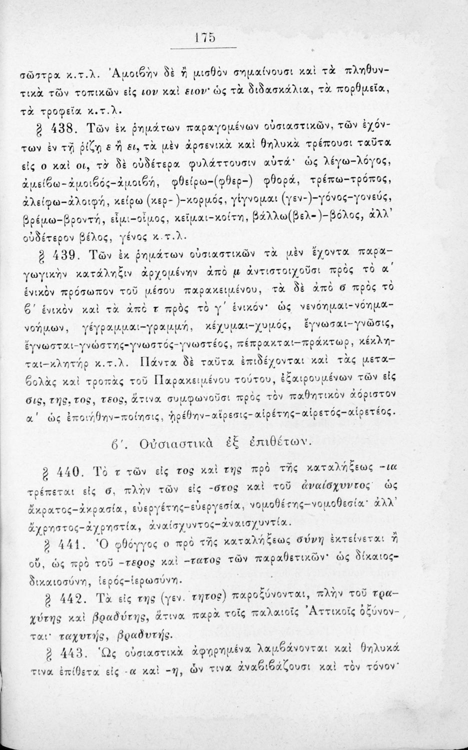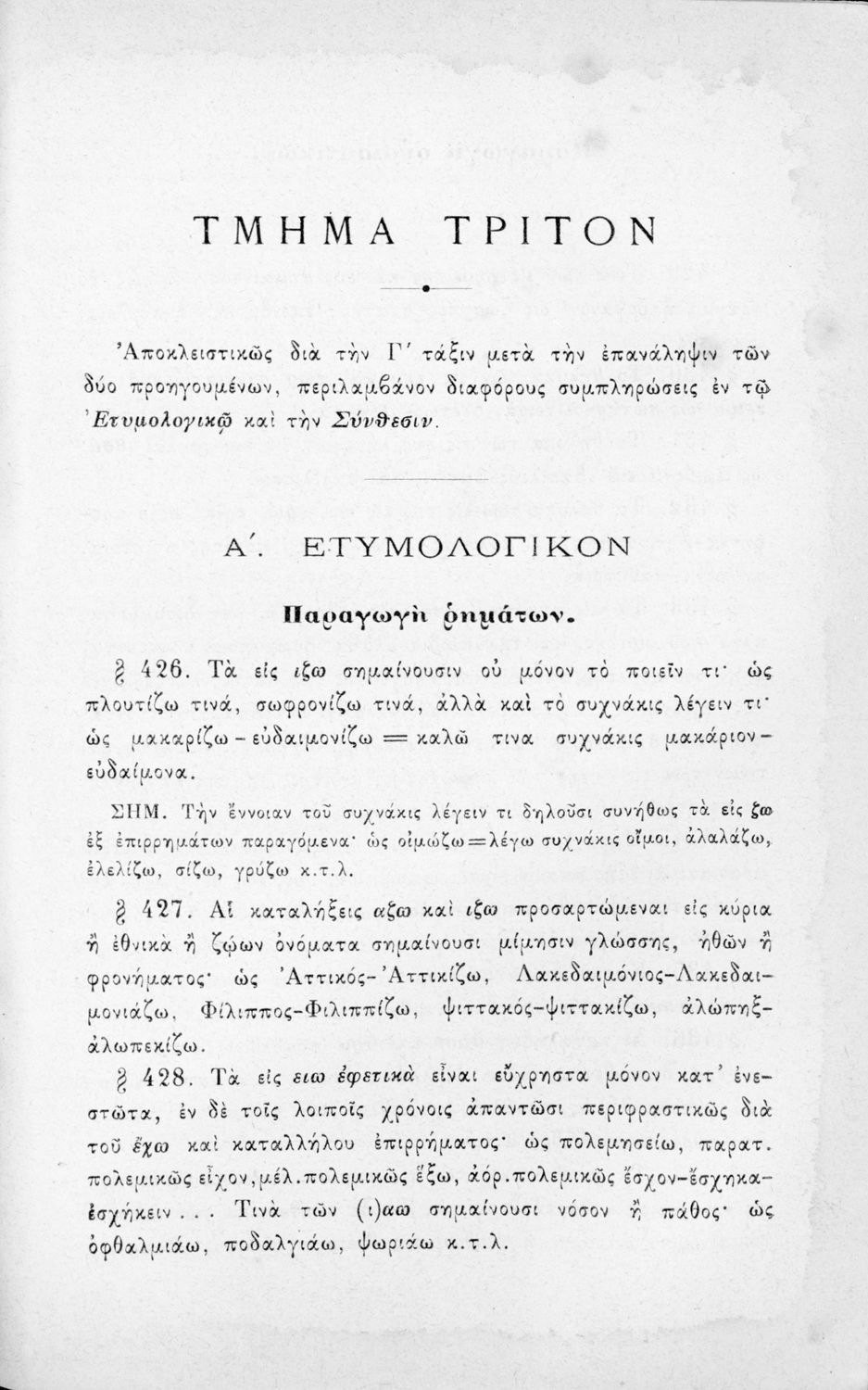 Σχολικό εγχειρίδιο Αρχαίων Ελληνικών για τα Ελληνικά Σχολεία, Παρθεναγωγεία και Γυμνάσια που περιέχει τους κανόνες γραμματικής και είναι χωρισμένο σε φθογγολογικό, τυπολογικό και ετυμολογικό μέρος.