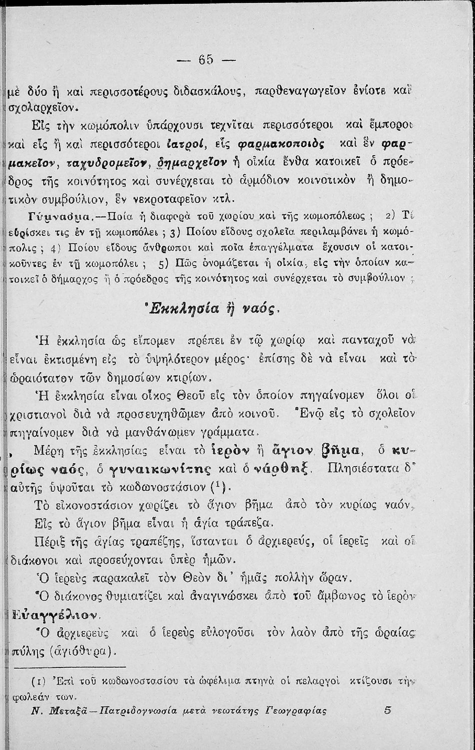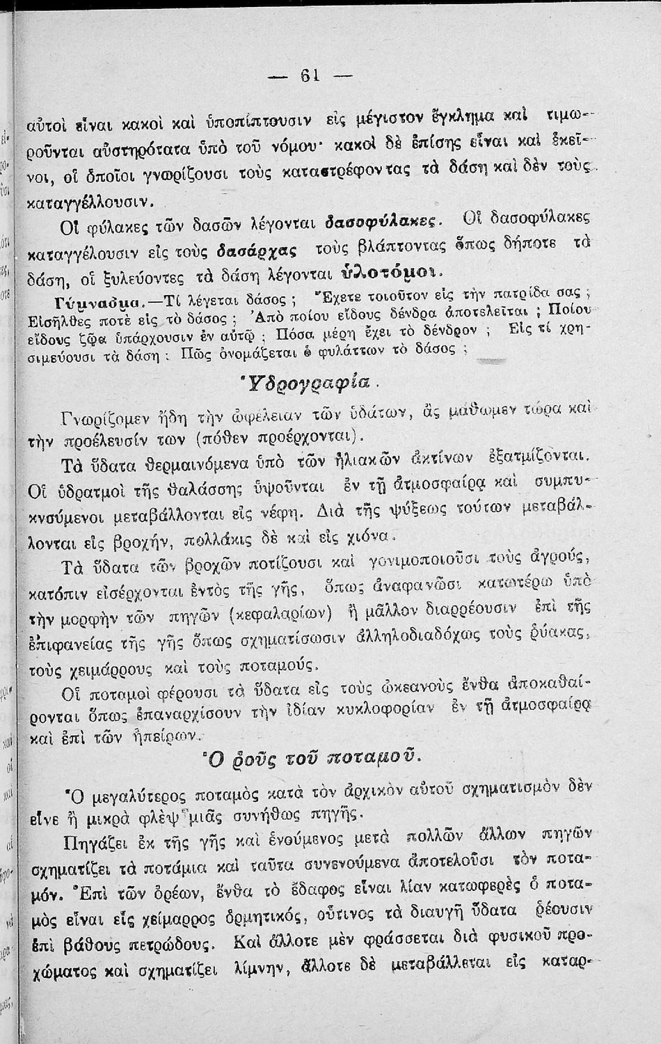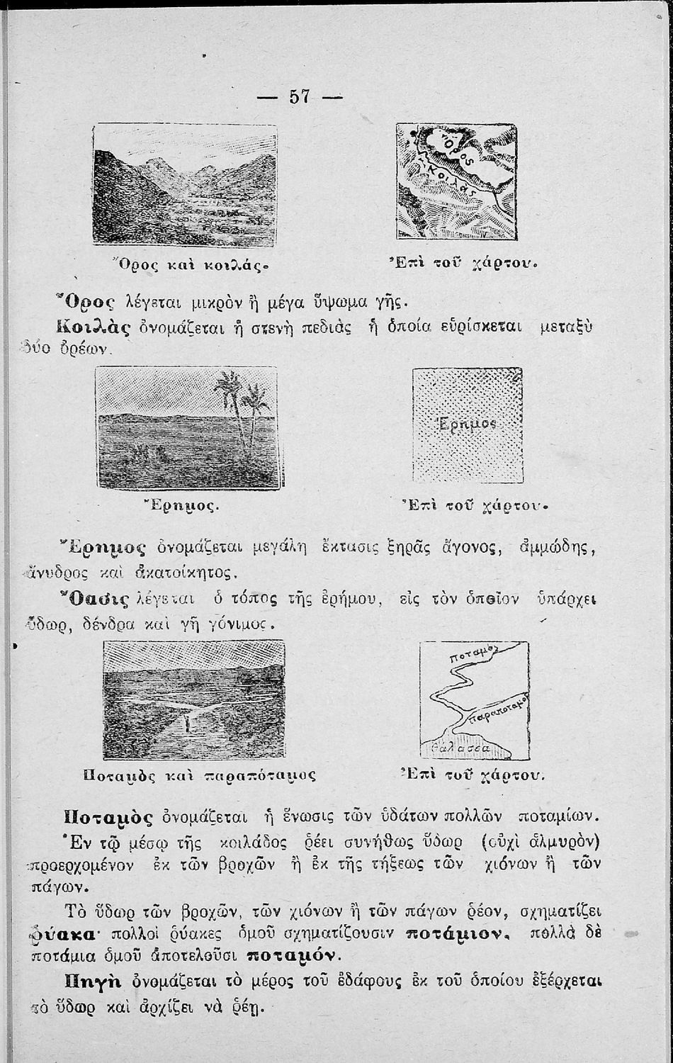Σχολικό εγχειρίδιο Γεωγραφίας για τις Γ΄, Δ΄, Ε΄, ΣΤ΄ Δημοτικού που περιλαμβάνει εισαγωγή στην πατριδογνωσία και παρουσιάζει την φυσική και πολιτική γεωγραφία της Παλαιάς και Νέας Ελλάδας.