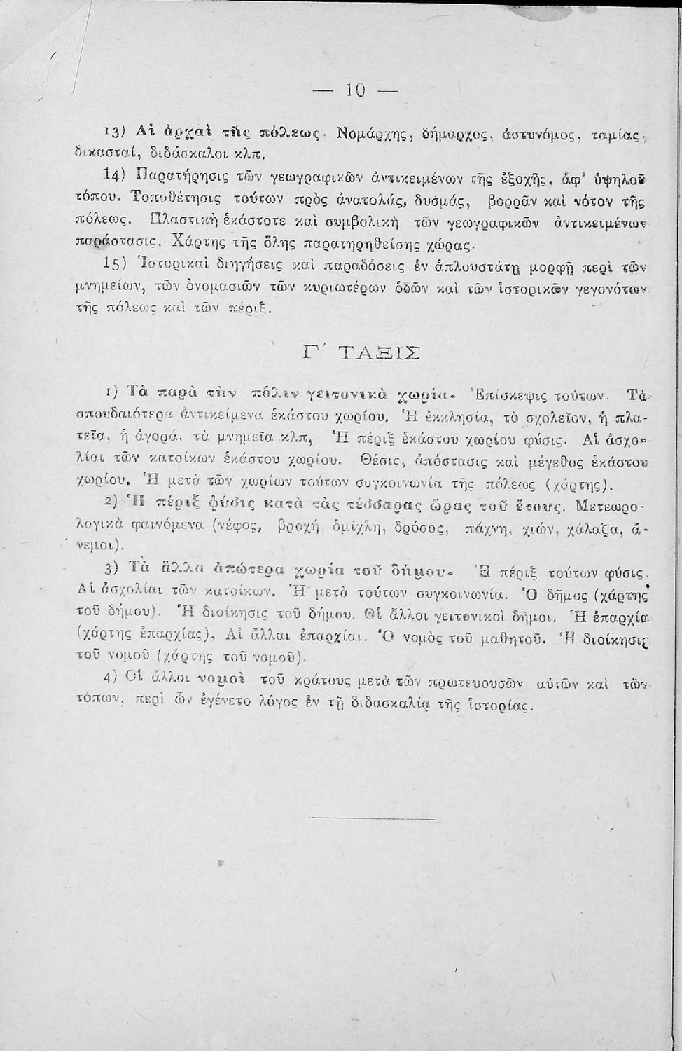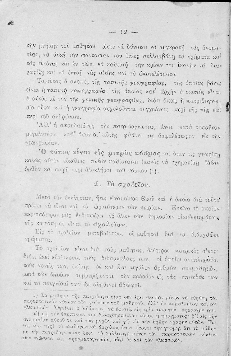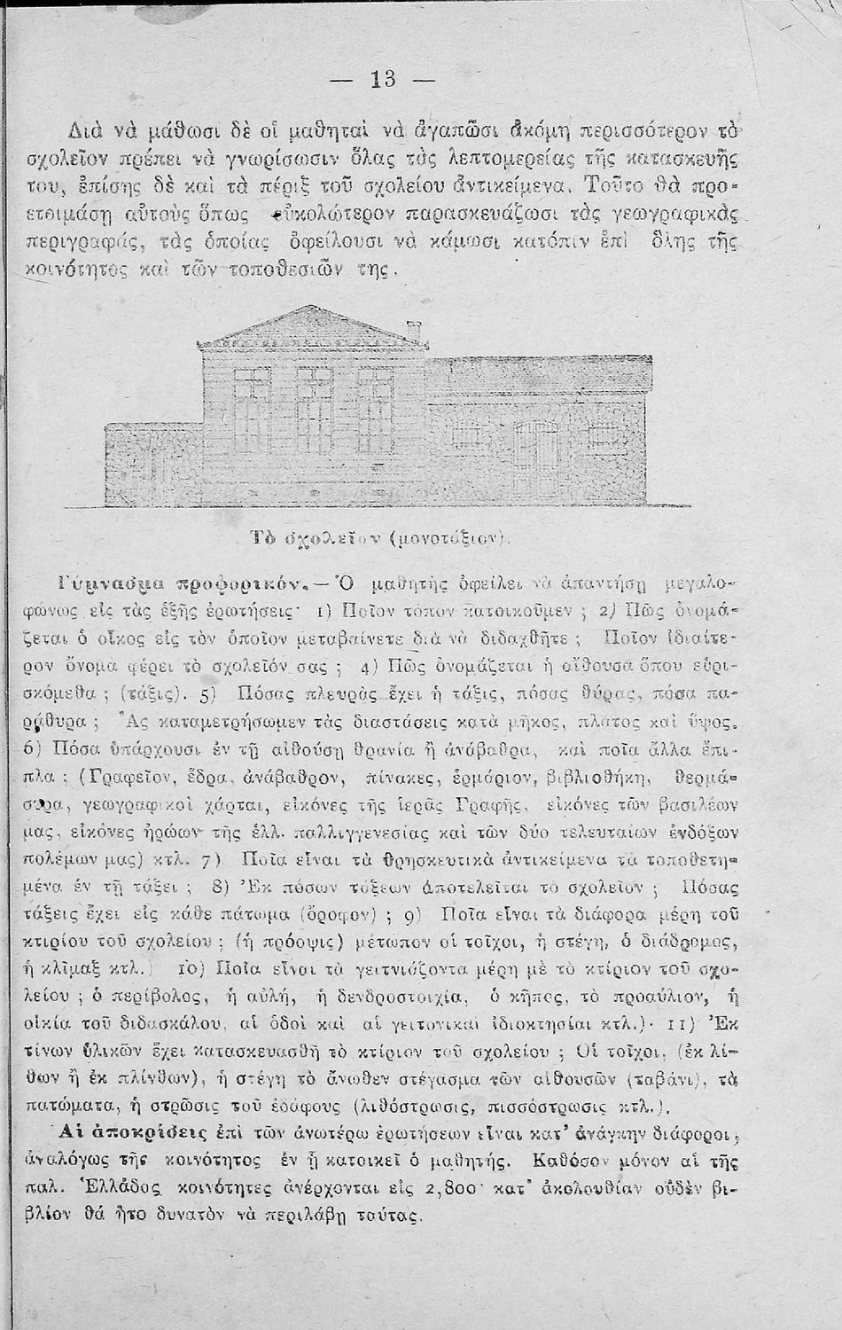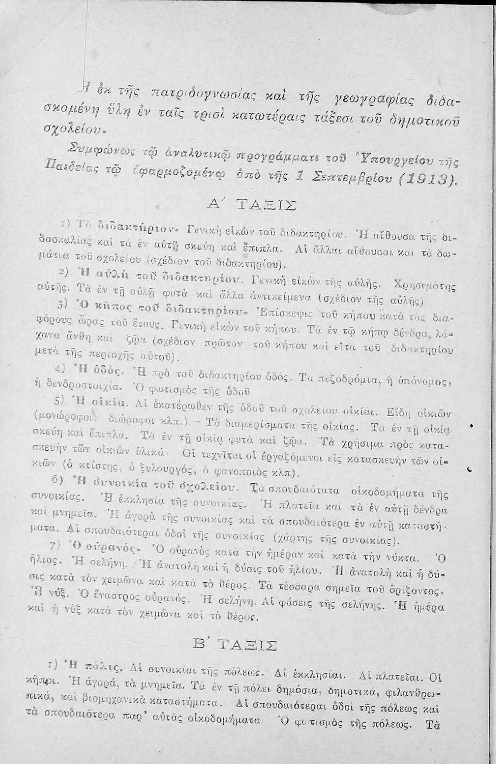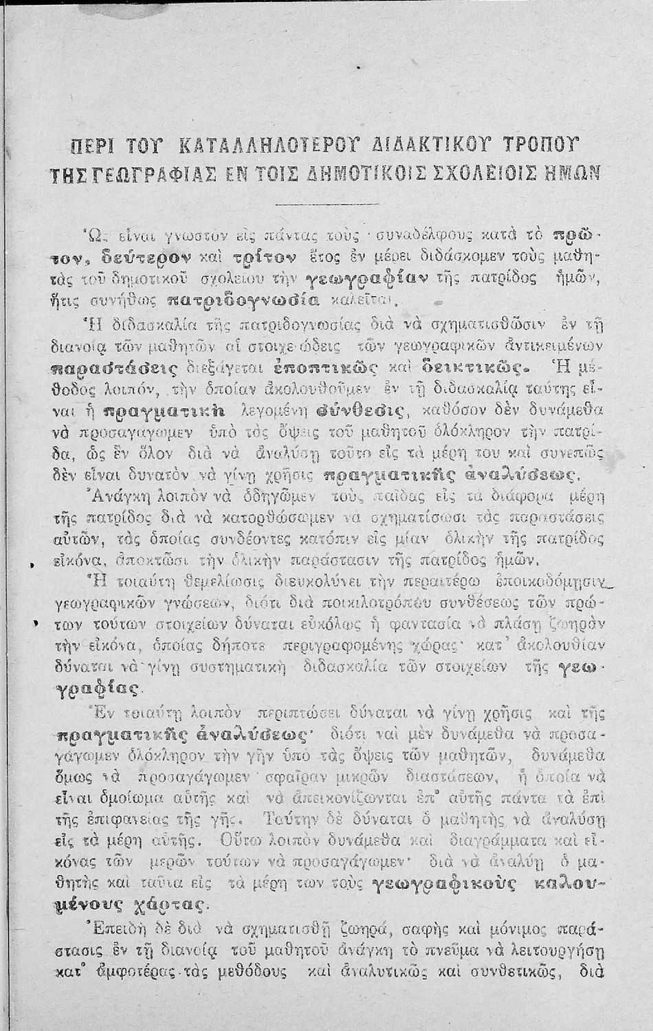 Σχολικό εγχειρίδιο Γεωγραφίας για την Γ' Δημοτικού. Είναι σύμφωνο με το αναλυτικό πρόγραμμα του 1913. Περιλαμβάνει στοιχεία πατριδογνωσίας, γεωγραφικούς ορισμούς και στοιχεία της Αττικής και των επαρχιών της.