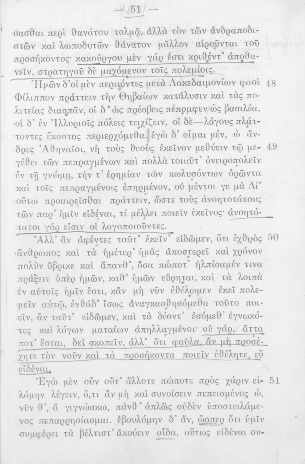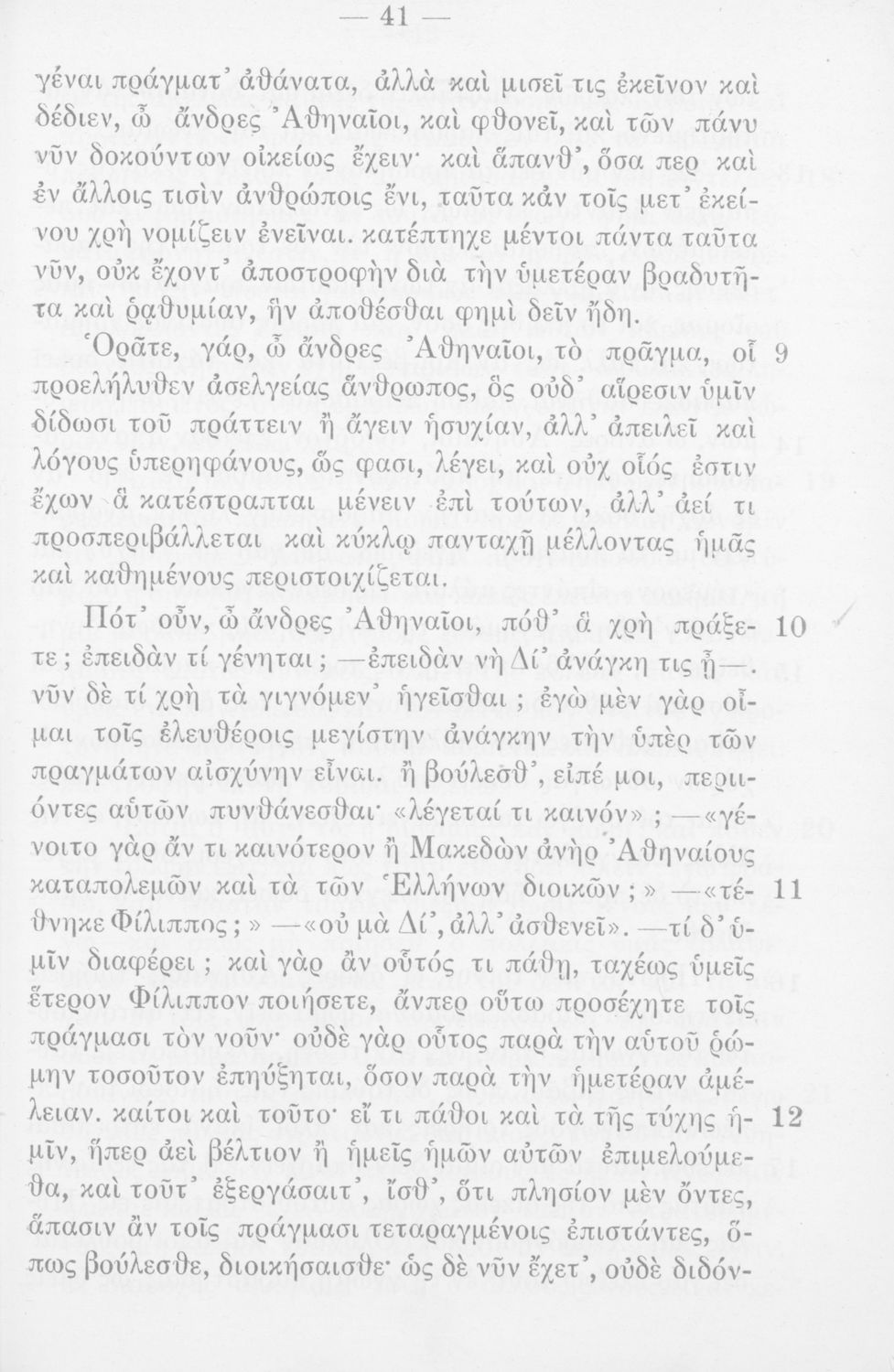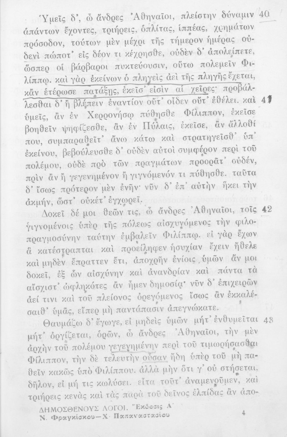 Σχολικό εγχειρίδιο Αρχαίων Ελληνικών Δ΄ Γυμνασίου που περιλαμβάνει εισαγωγή στη ζωή και στο έργο του Δημοσθένη, τον Α΄ κατά Φιλίππου, και τους Α΄ και Β΄ Ολυνθιακούς και ερμηνευτικά και ετυμολογικά σχόλια.