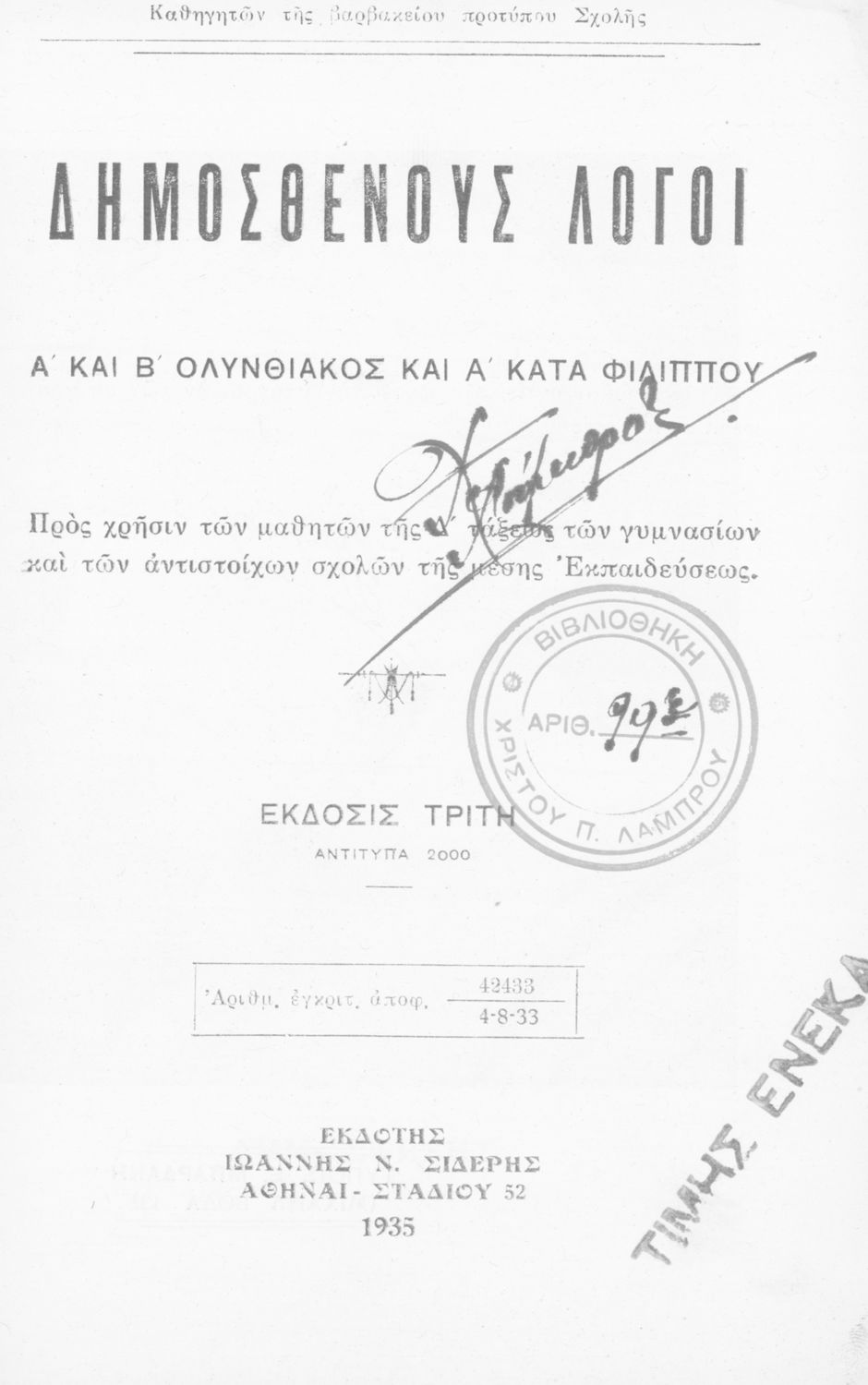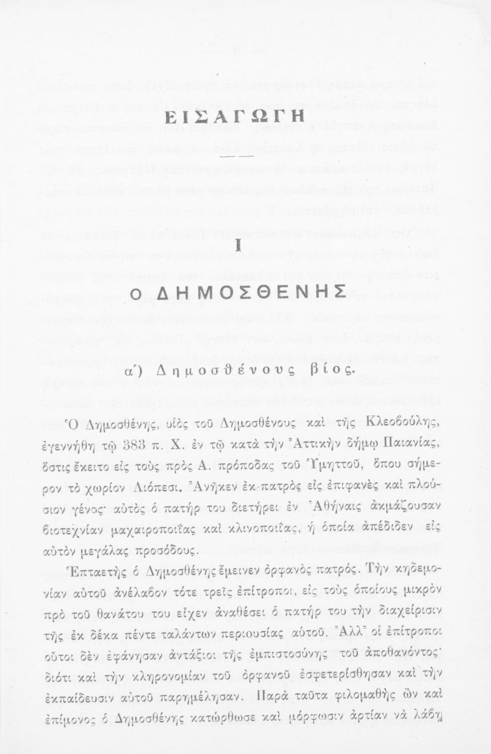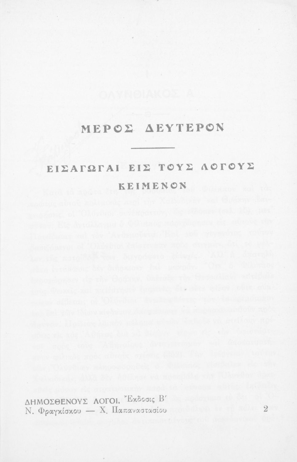 Σχολικό εγχειρίδιο Αρχαίων Ελληνικών Δ΄ Γυμνασίου που περιλαμβάνει εισαγωγή στη ζωή και στο έργο του Δημοσθένη, τον Α΄ κατά Φιλίππου, και τους Α΄ και Β΄ Ολυνθιακούς και ερμηνευτικά και ετυμολογικά σχόλια.