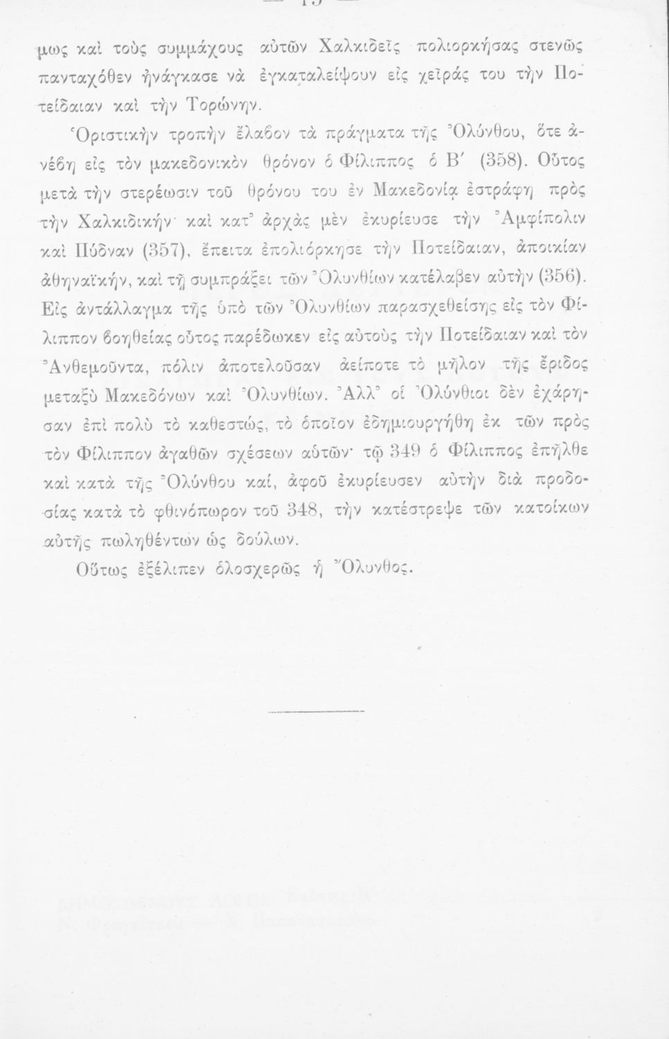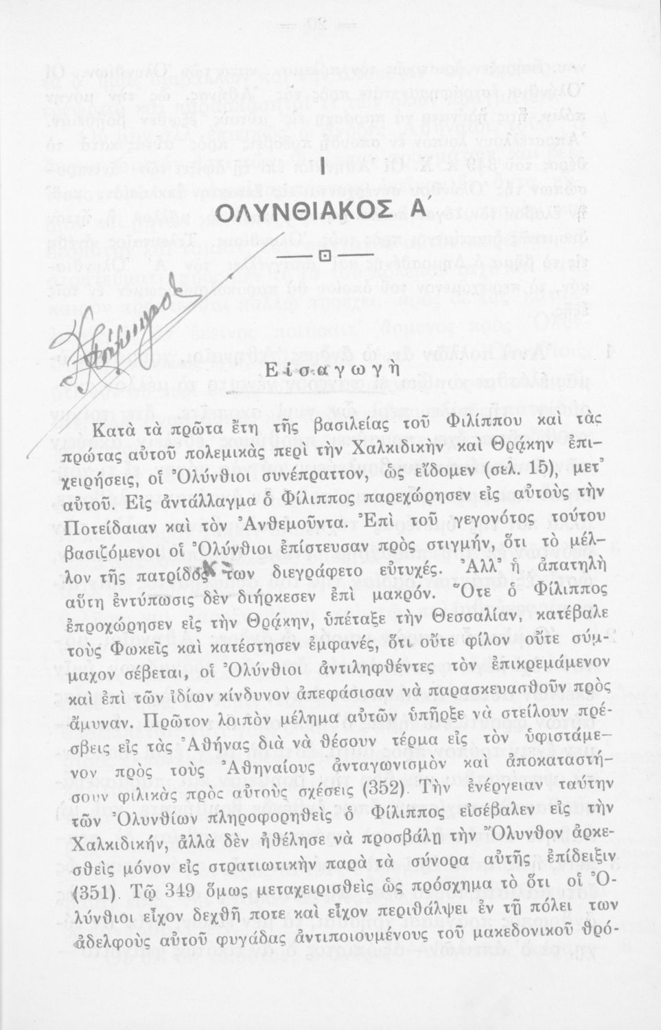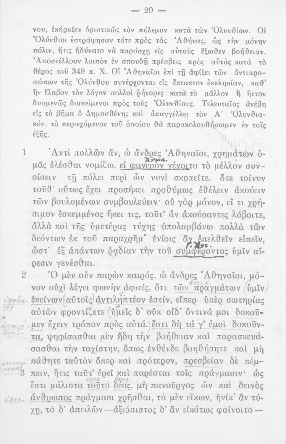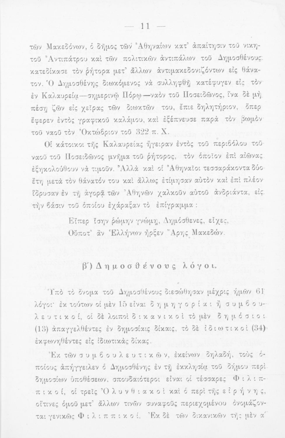Σχολικό εγχειρίδιο Αρχαίων Ελληνικών Δ΄ Γυμνασίου που περιλαμβάνει εισαγωγή στη ζωή και στο έργο του Δημοσθένη, τον Α΄ κατά Φιλίππου, και τους Α΄ και Β΄ Ολυνθιακούς και ερμηνευτικά και ετυμολογικά σχόλια.