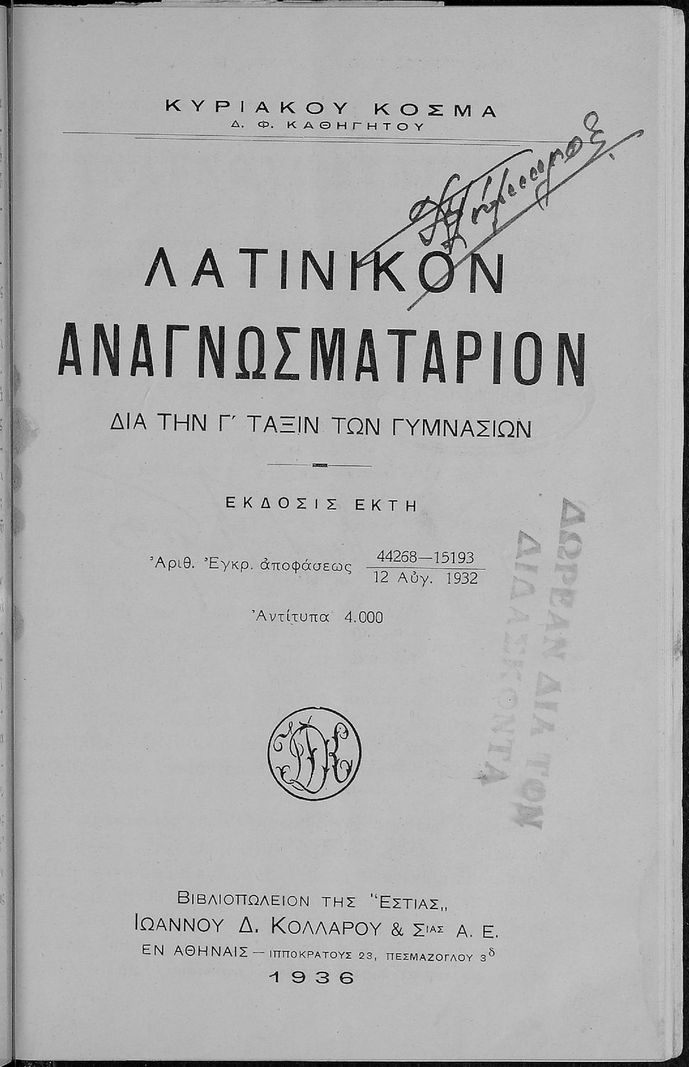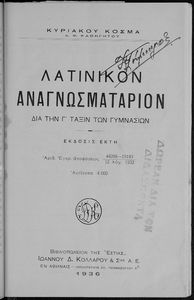 Κωδικός αναγνώρισης: 01-45176b Τίτλος: Λατινικόν Αναγνωσματάριο. Δια την Γ΄ Τάξιν των Γυμνασίων Συγγραφέας: Κυριάκος Κοσμάς (σχόλια) Μέγεθος και υπόστρωμα: Σχολικό εγχειρίδιο, σκληρό εξώφυλλο, 80 σελίδες. |