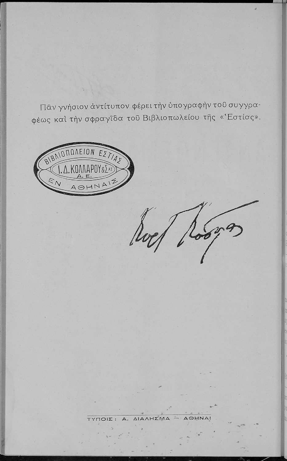 Εκδότης: Ιωάννης Δ. Κολλάρος, Βιβλιοπωλείο της "Εστίας" Έτος έκδοσης: 1936 Τόπος έκδοσης: Αθήνα |