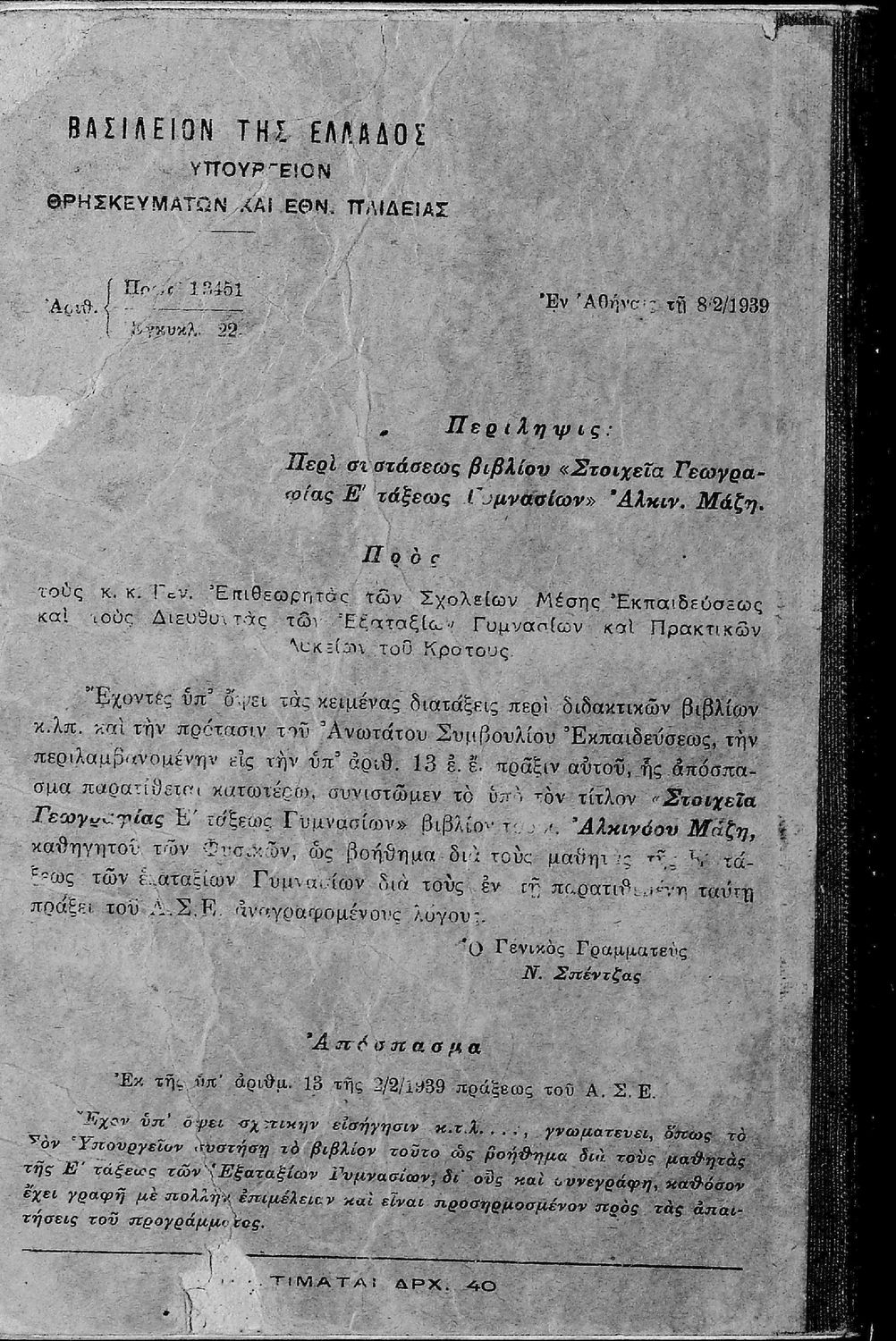 Υπουργική απόφαση / Σύμβαση: 22/13451/8-2-1939