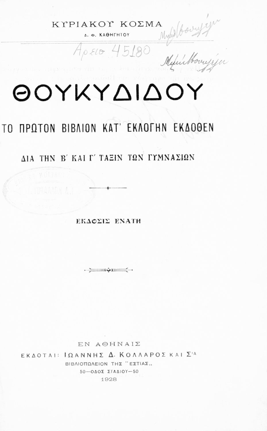 Τίτλος: Θουκυδίδου Ιστορίαι το πρώτο βιβλίον κατ΄ εκλογήν εκδοθέν. Δια την Β΄ και Γ΄ Τάξιν των Γυμνασίων