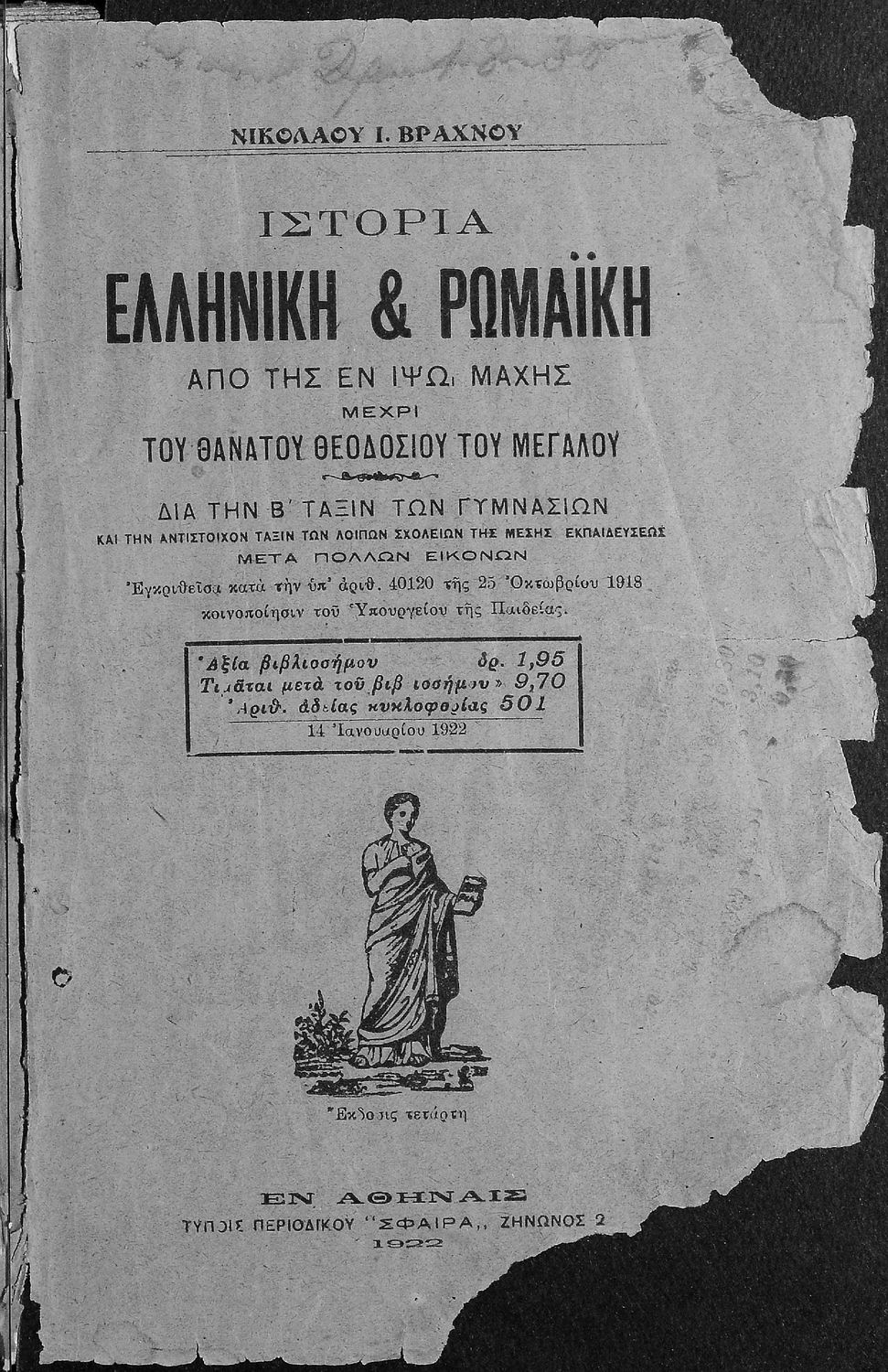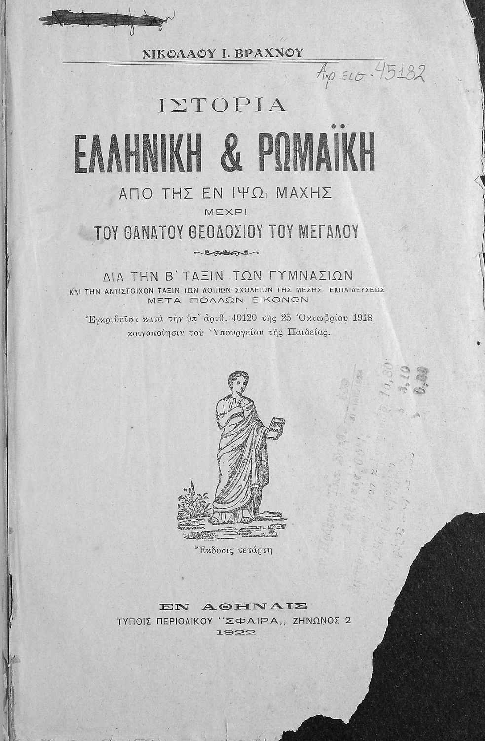 Κωδικός αναγνώρισης: 01-45182 Τίτλος: Ιστορία Ελληνική και Ρωμαϊκή. Από της εν Ιψώ μάχης μέχρι του θανάτου Θεοδόσιου του Μεγάλου δια την Β΄ Τάξιν των Γυμνασίων Συγγραφέας: Νικόλαος Ι. Βραχνός Μέγεθος και υπόστρωμα: Σχολικό εγχειρίδιο, μαλακό εξώφυλλο, 254 σελίδες. Σκίτσα (ασπρόμαυρα). |