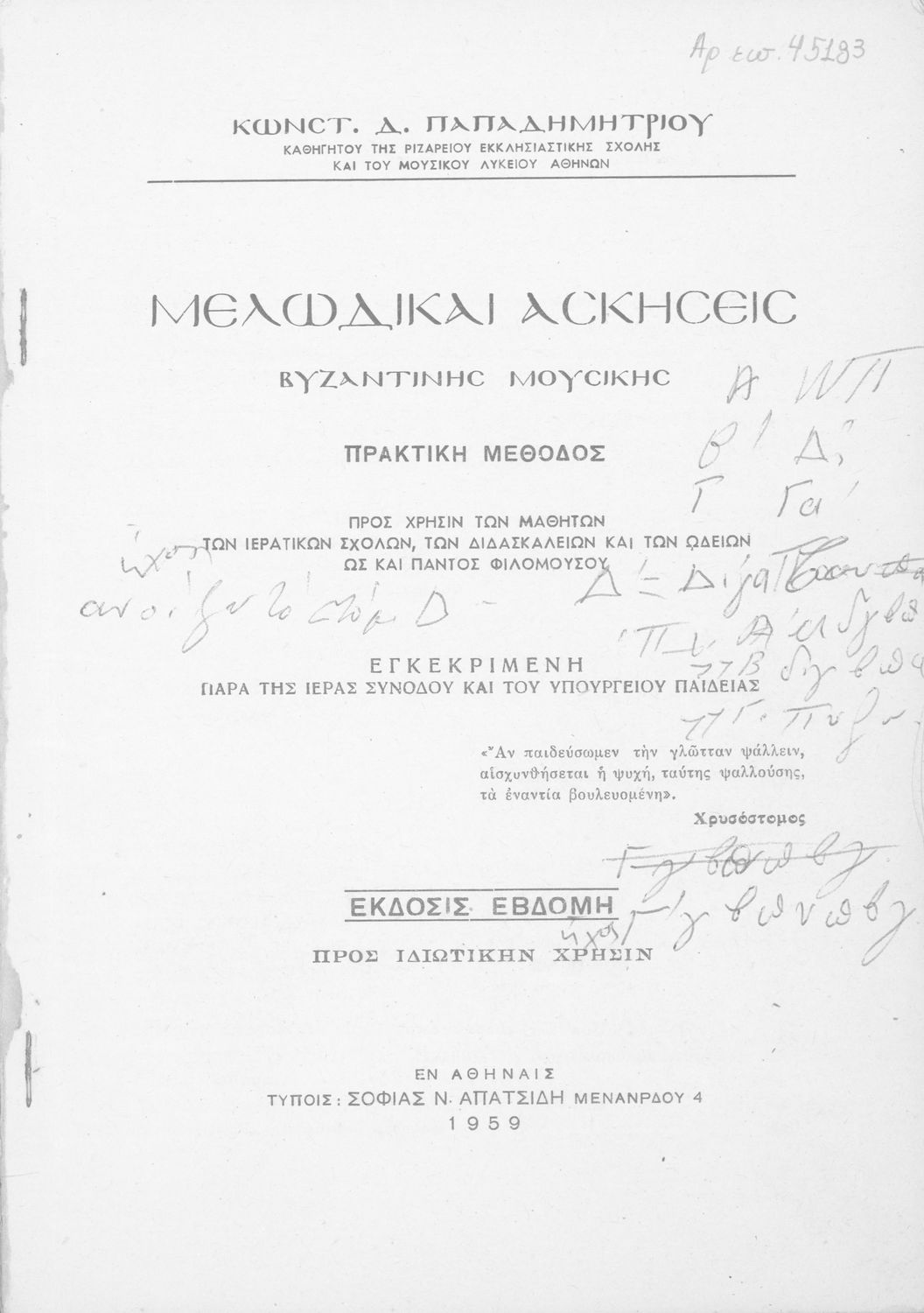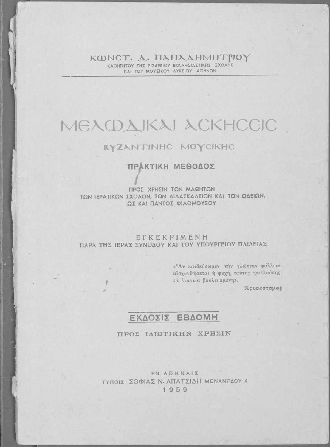 Μελωδικαί Ασκήσεις Βυζαντινής Μουσικής. Πρακτική Μέθοδος, προς χρήσιν των μαθητών των Ιερατικών σχολών, των Διδασκαλείων και των Ωδείων ως και παντός φιλόμουσου