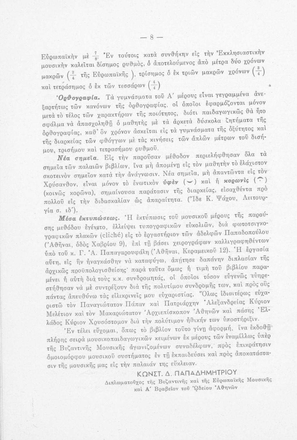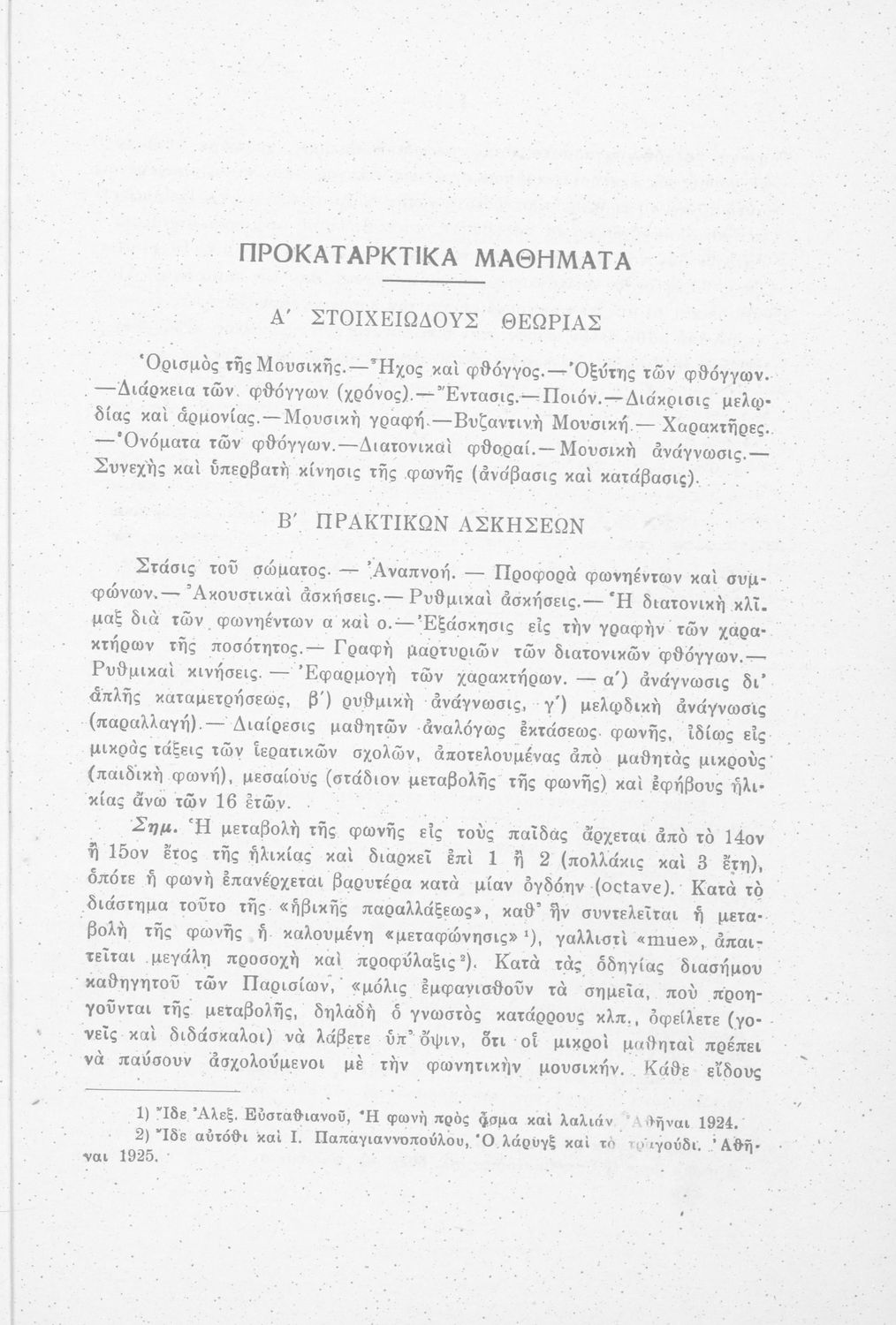 Παρουσίαση περιεχομένου: Σχολικό εγχειρίδιο Μουσικής για Ιερατικές σχολές, Διδασκαλεία και Ωδεία. Περιλαμβάνει στοιχεία Βυζαντινής Μουσικής. Ο συγγραφέας υπήρξε καθηγητής της Ριζαρείου Εκκλησιαστικής Σχολής και του Μουσικού Λυκείου Αθηνών.